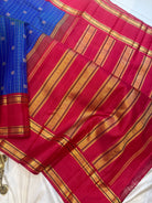 The body is beautiful mayilkazhuthu colour with Kalashetra style Kattam in body in 2 shades of Muthu Kattam in beige and araku Kattam and the body has annam chakrm Butta and the border is Kai Korvai in dark red color with retta pet jada Nagam and chakram pet and dense varisai Palla and blouse