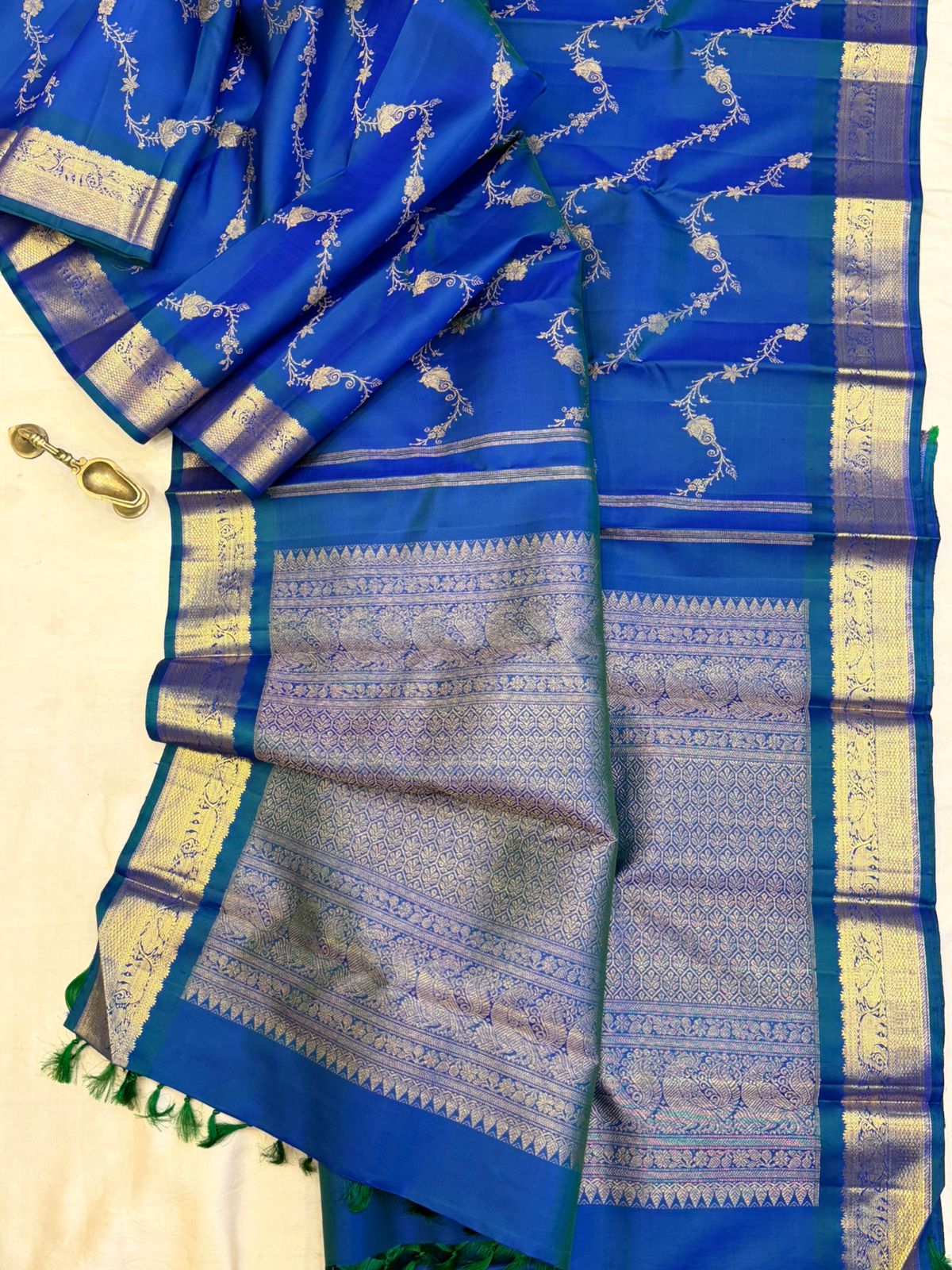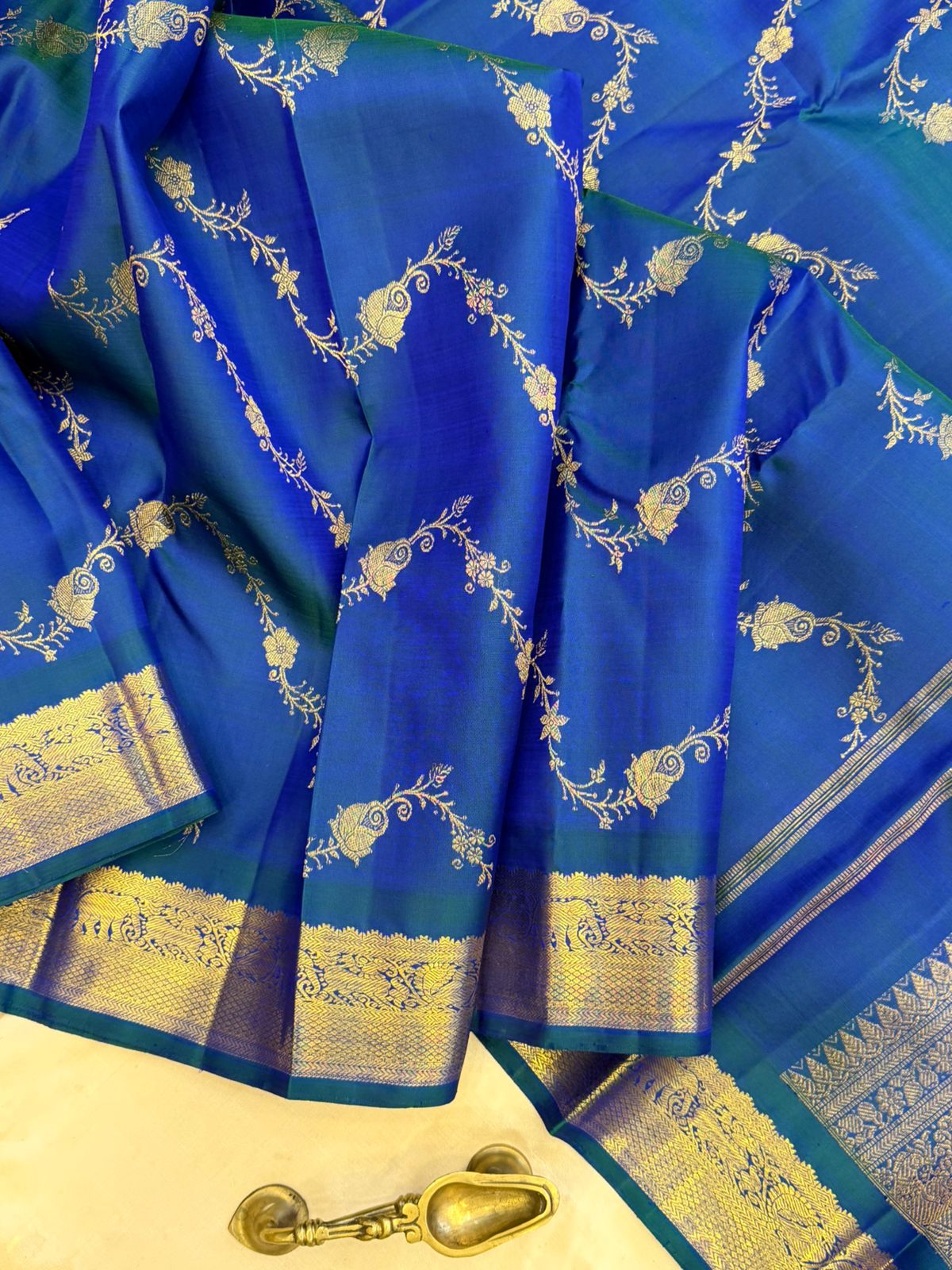 A beautiful Benarsi inspired kodi pattern in body with annam yaanai Kuil kann pet border and dense pure Zari Palla and blouse