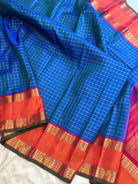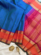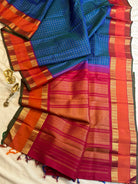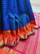 The body is a dual tone mayilkazhuthu or peacock blue color with Zari Kattam in body and the border is araku color with Kai Korvai retta pet border centre orange and dense pure Zari Palla and blouse