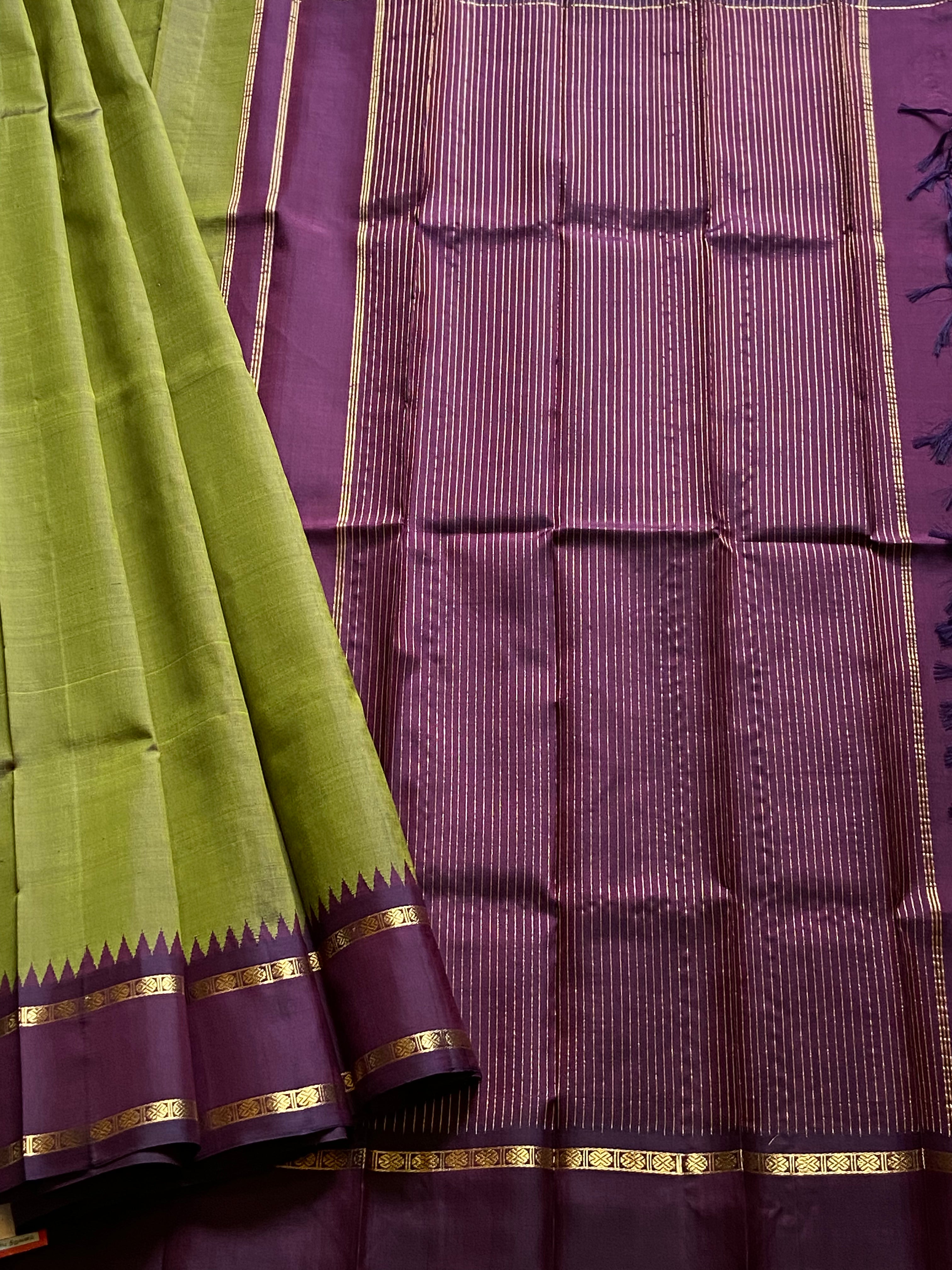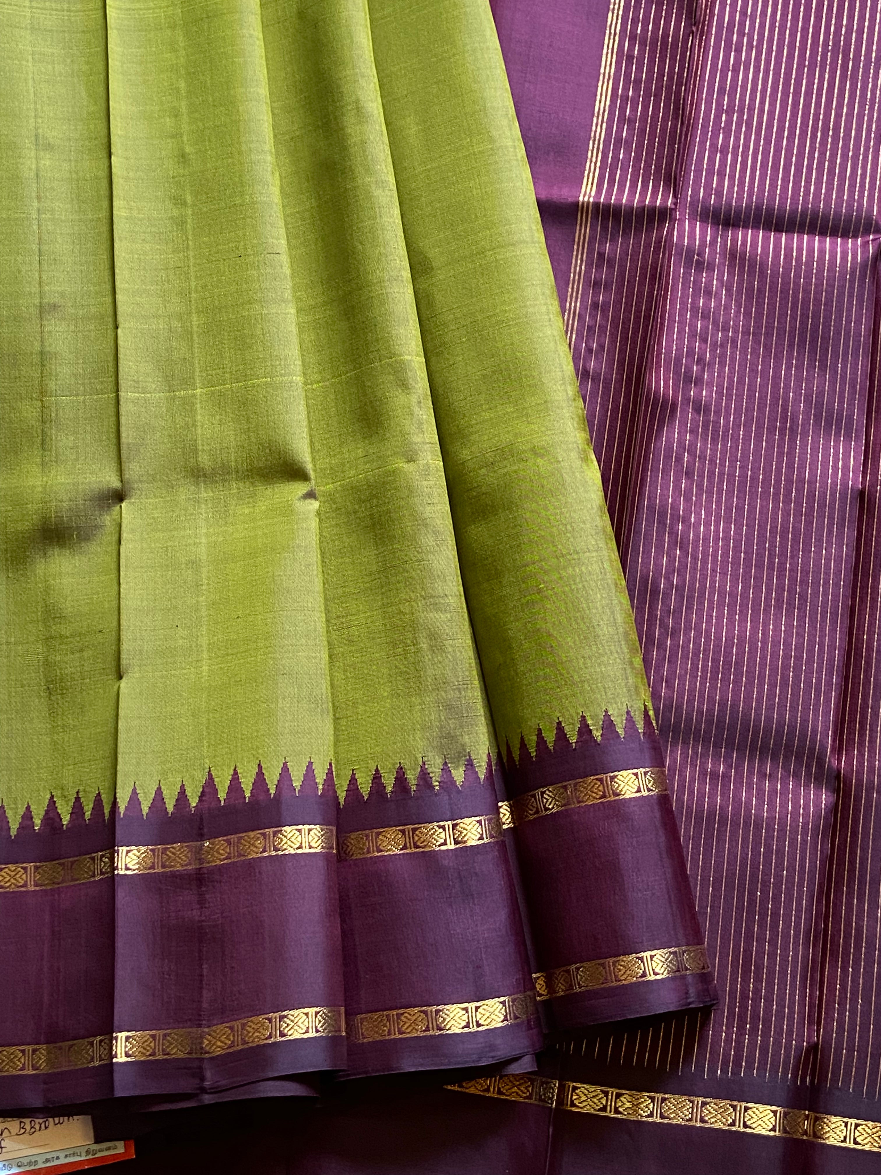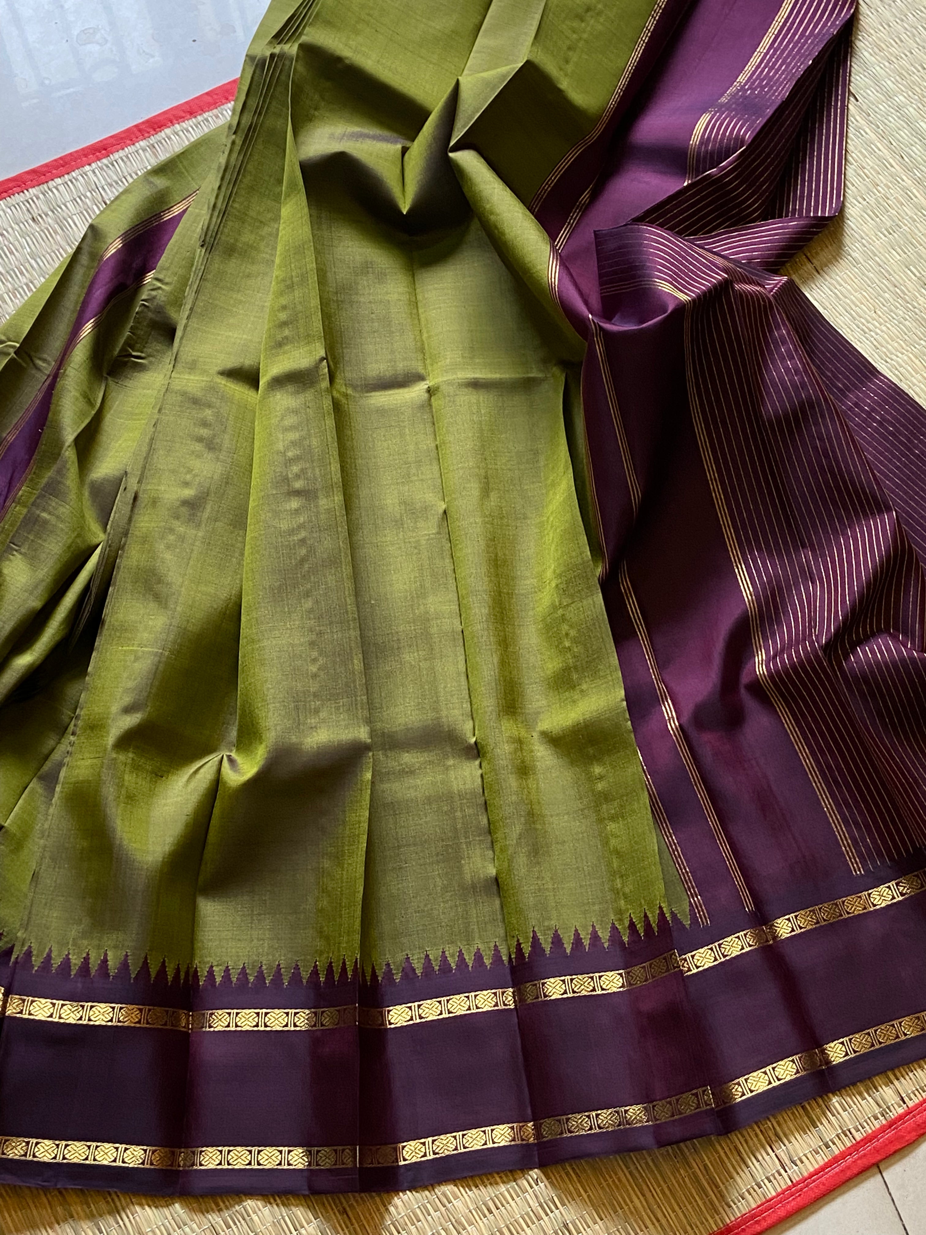 Mehendi green body with retta pet pure zari border on one side and a zari woven palla