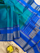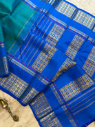 The saree is sea blue colour with Muthu kattam with varisapet ( Kalashetra style border ) and dense pure zari Palla and blouse