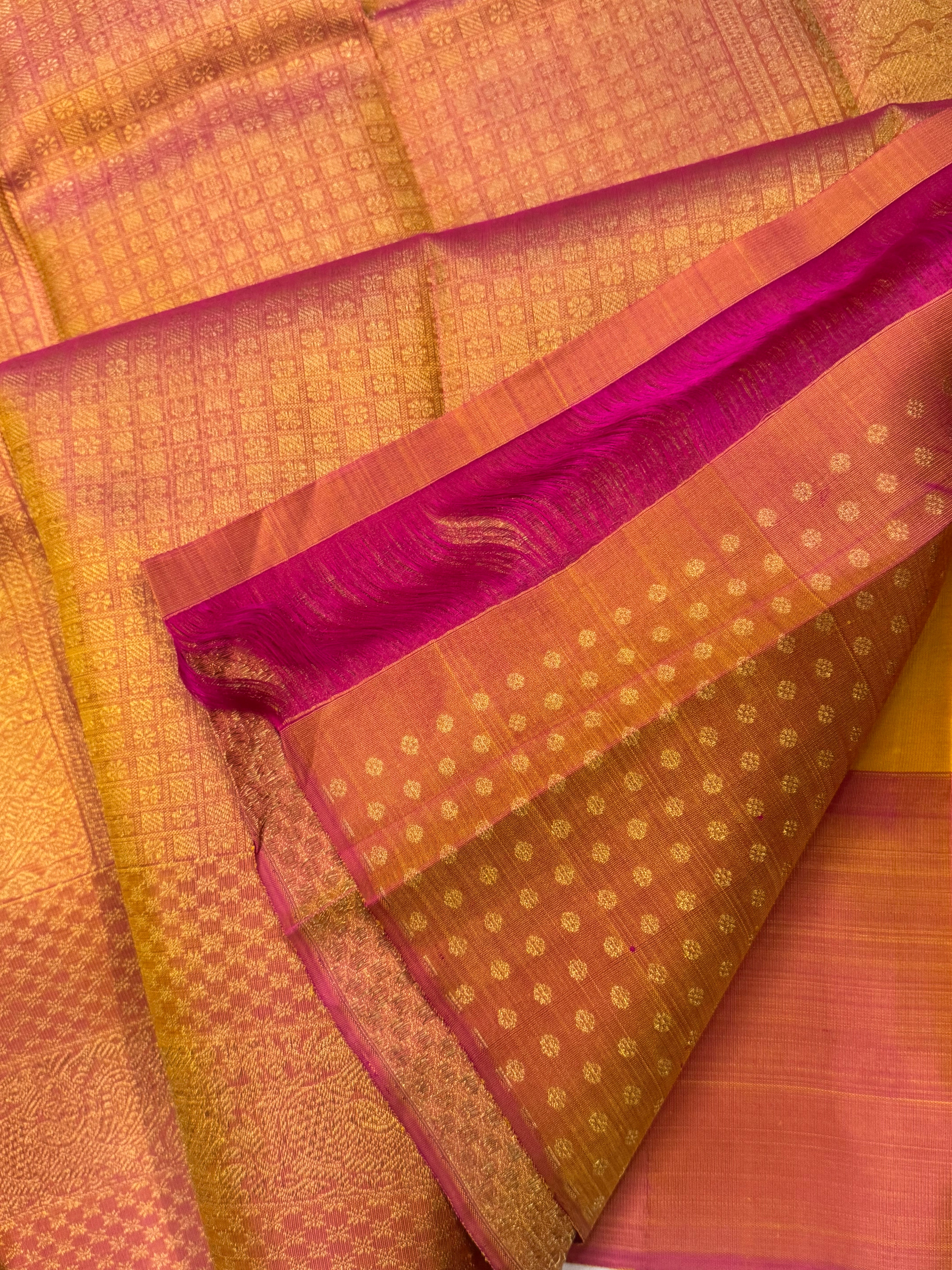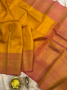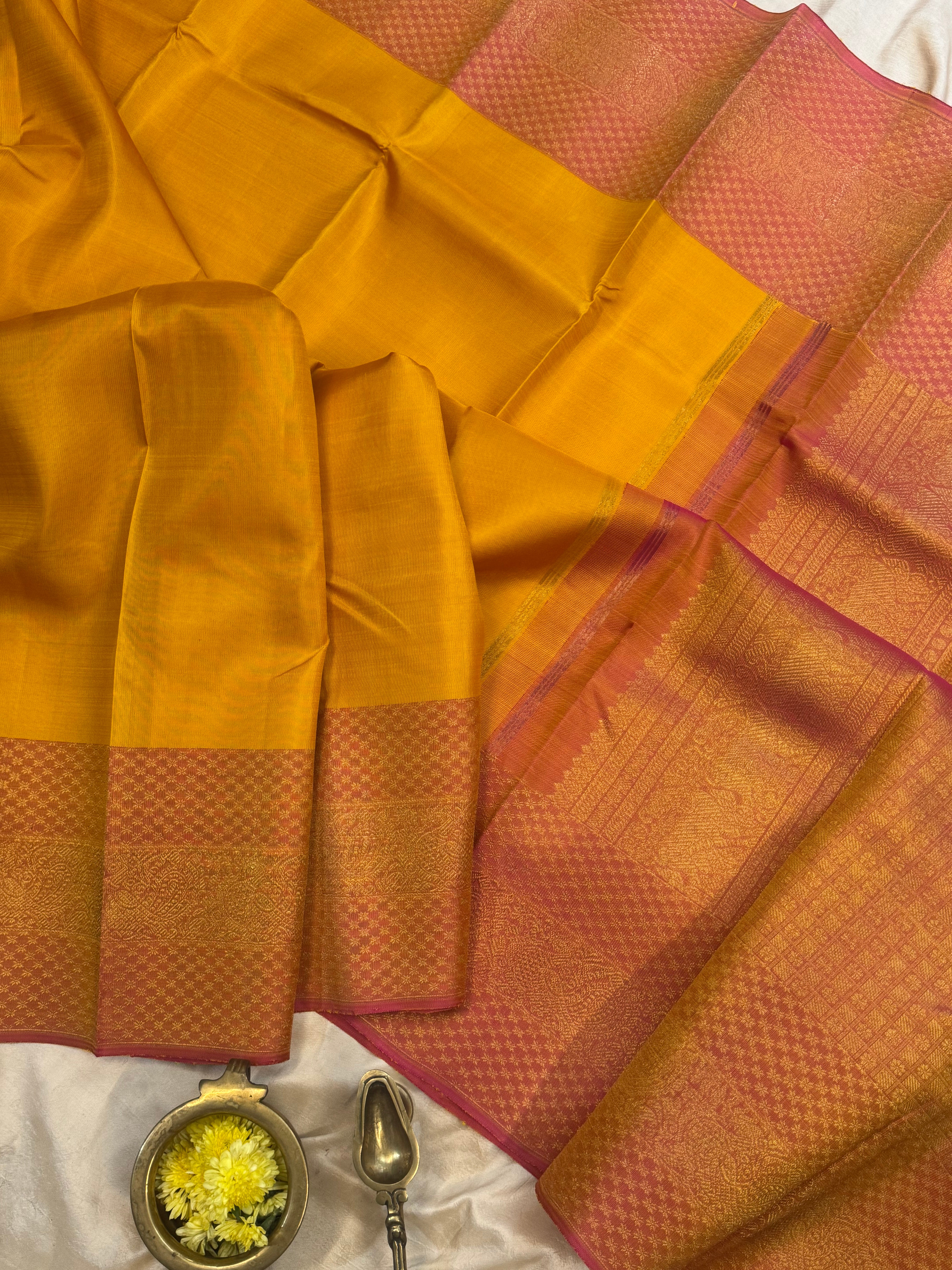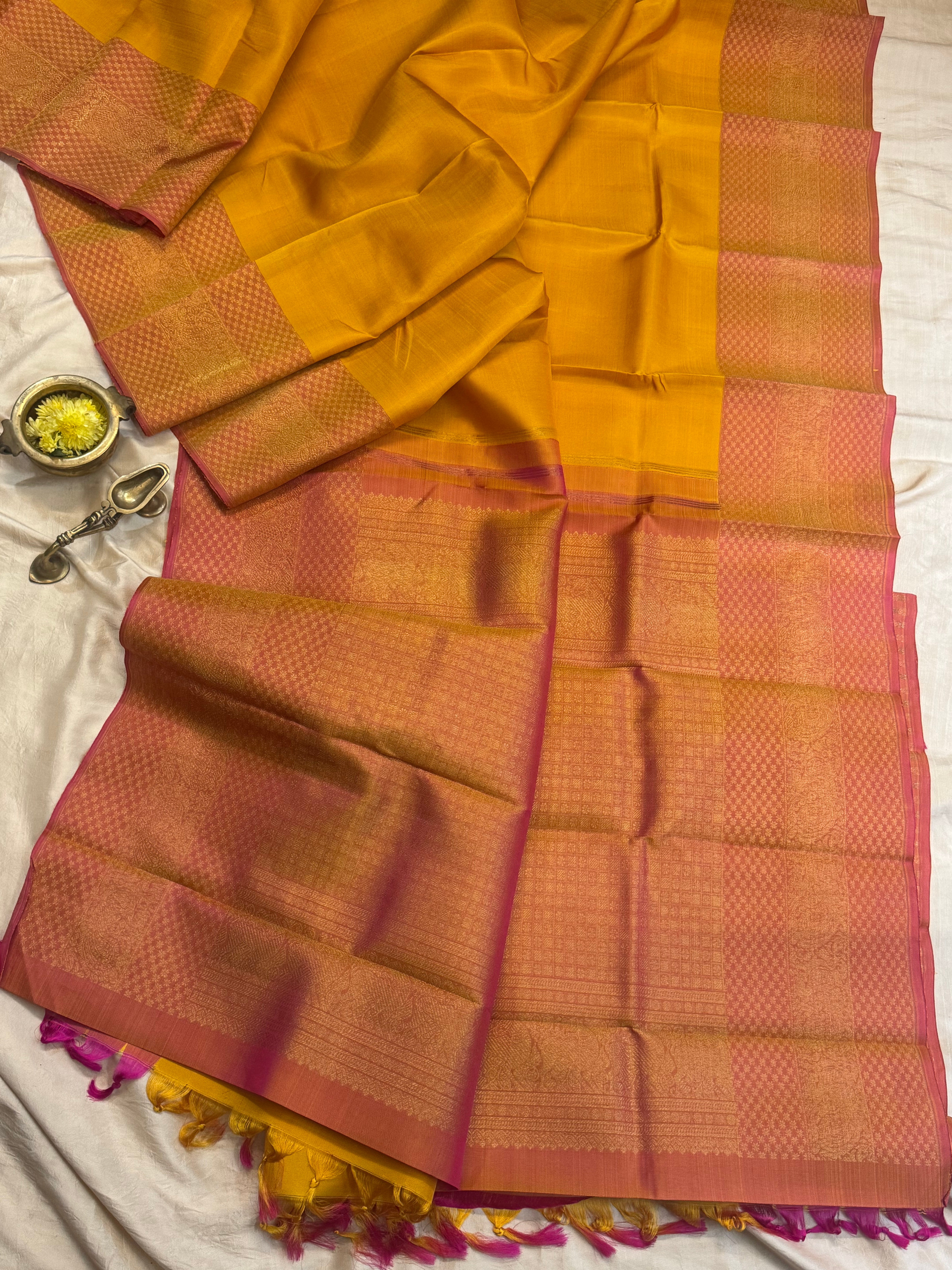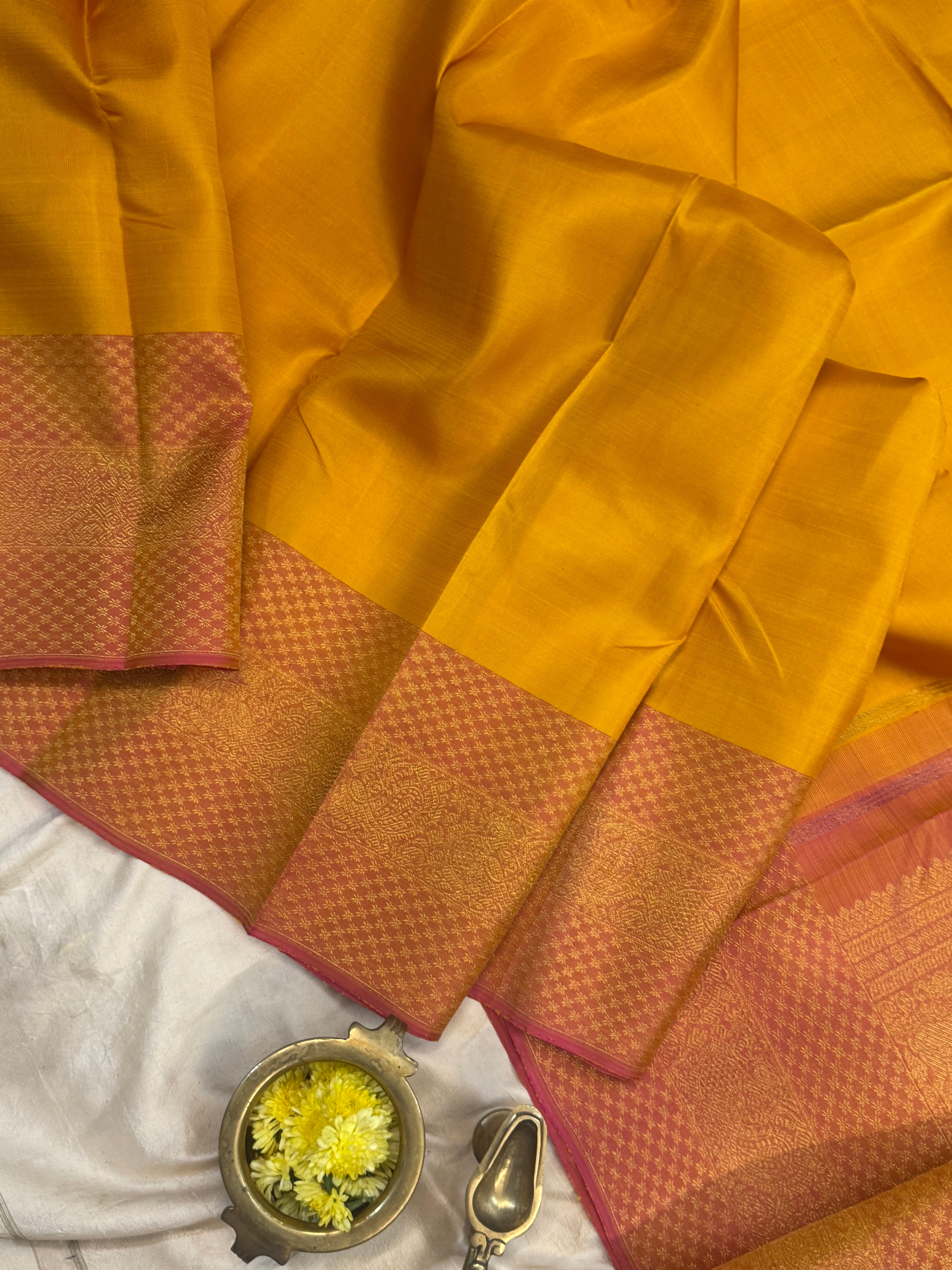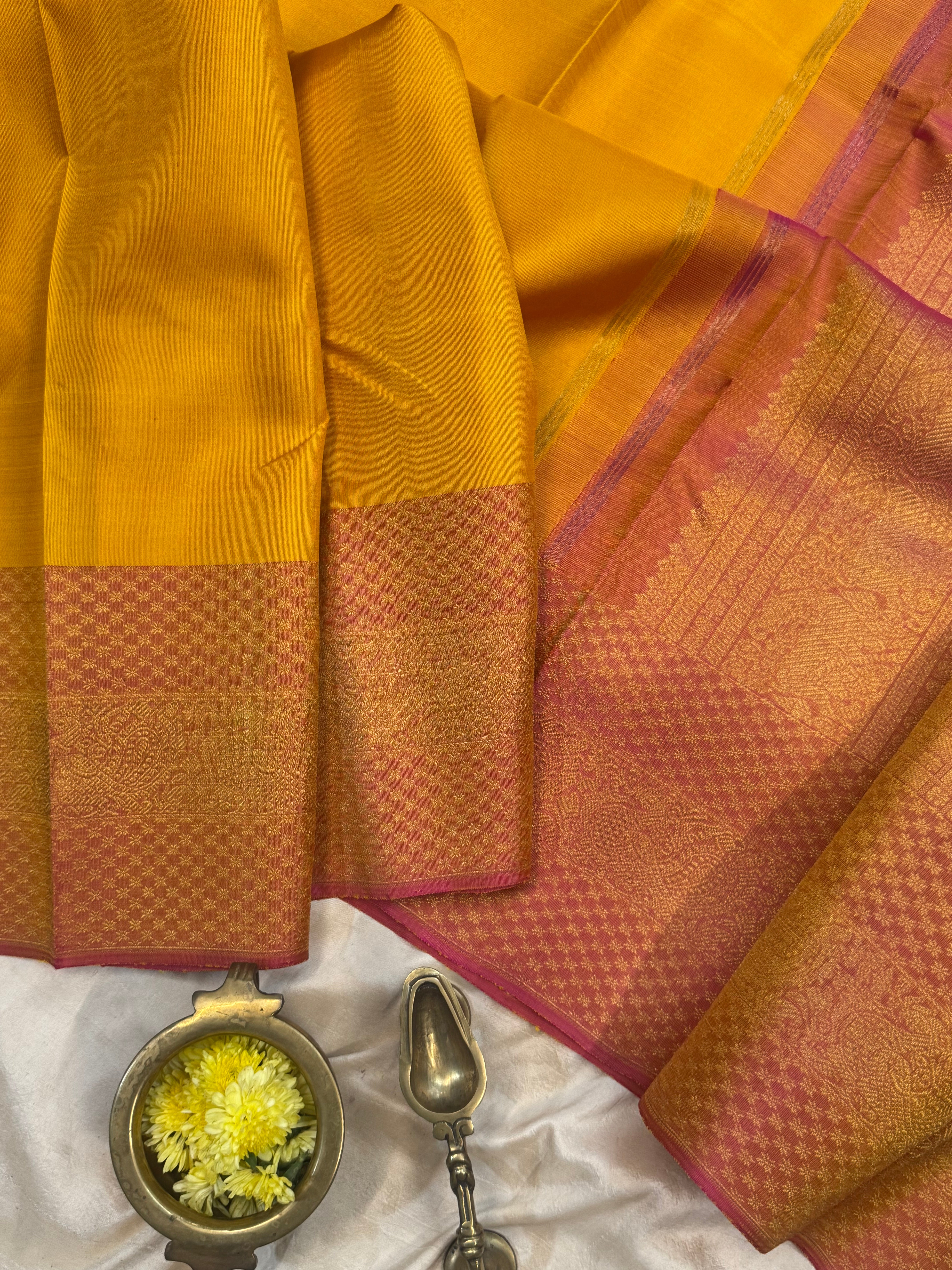 The saree is mustard yellow with annam pink border and dense zari Palla and blouse