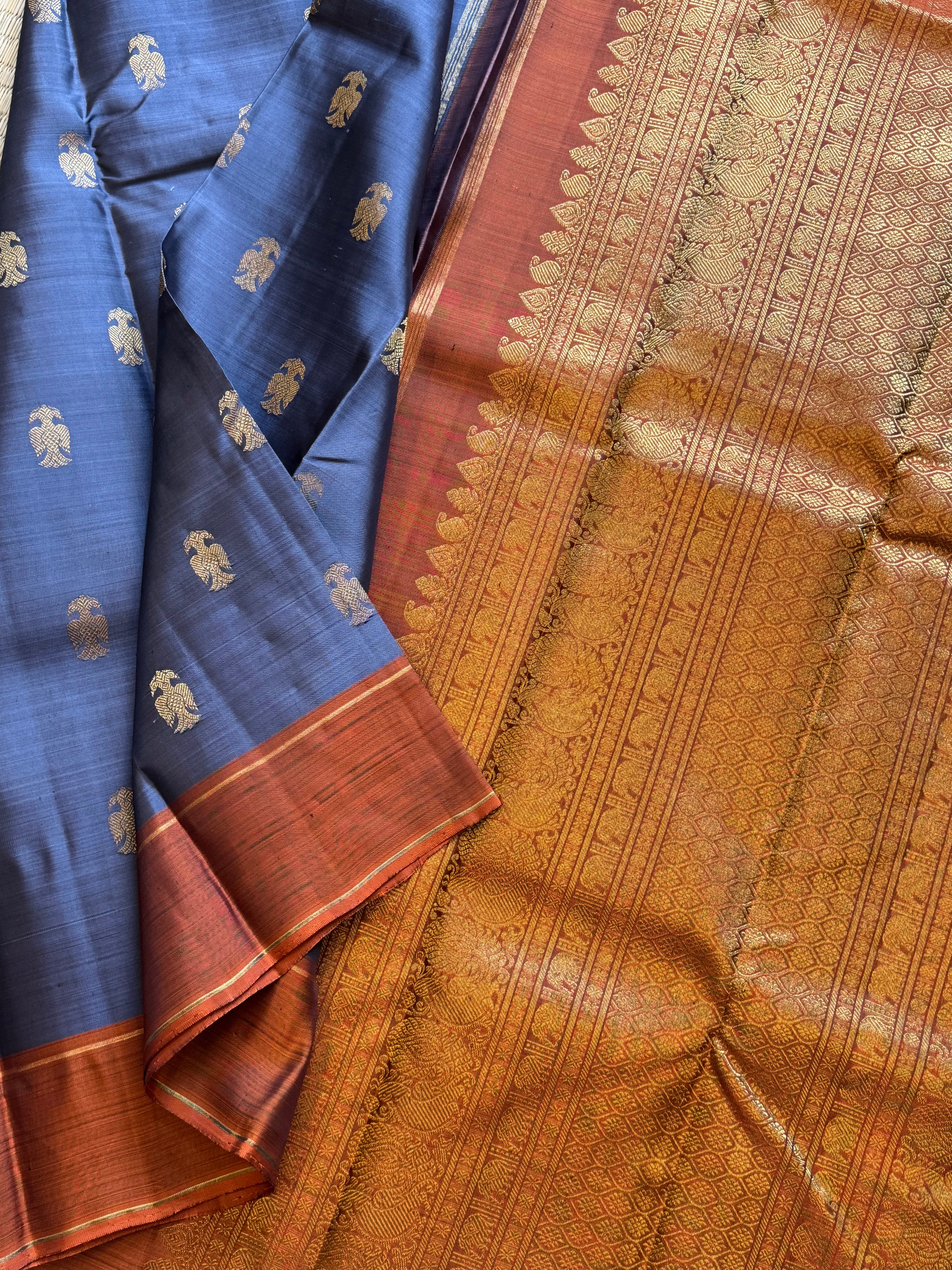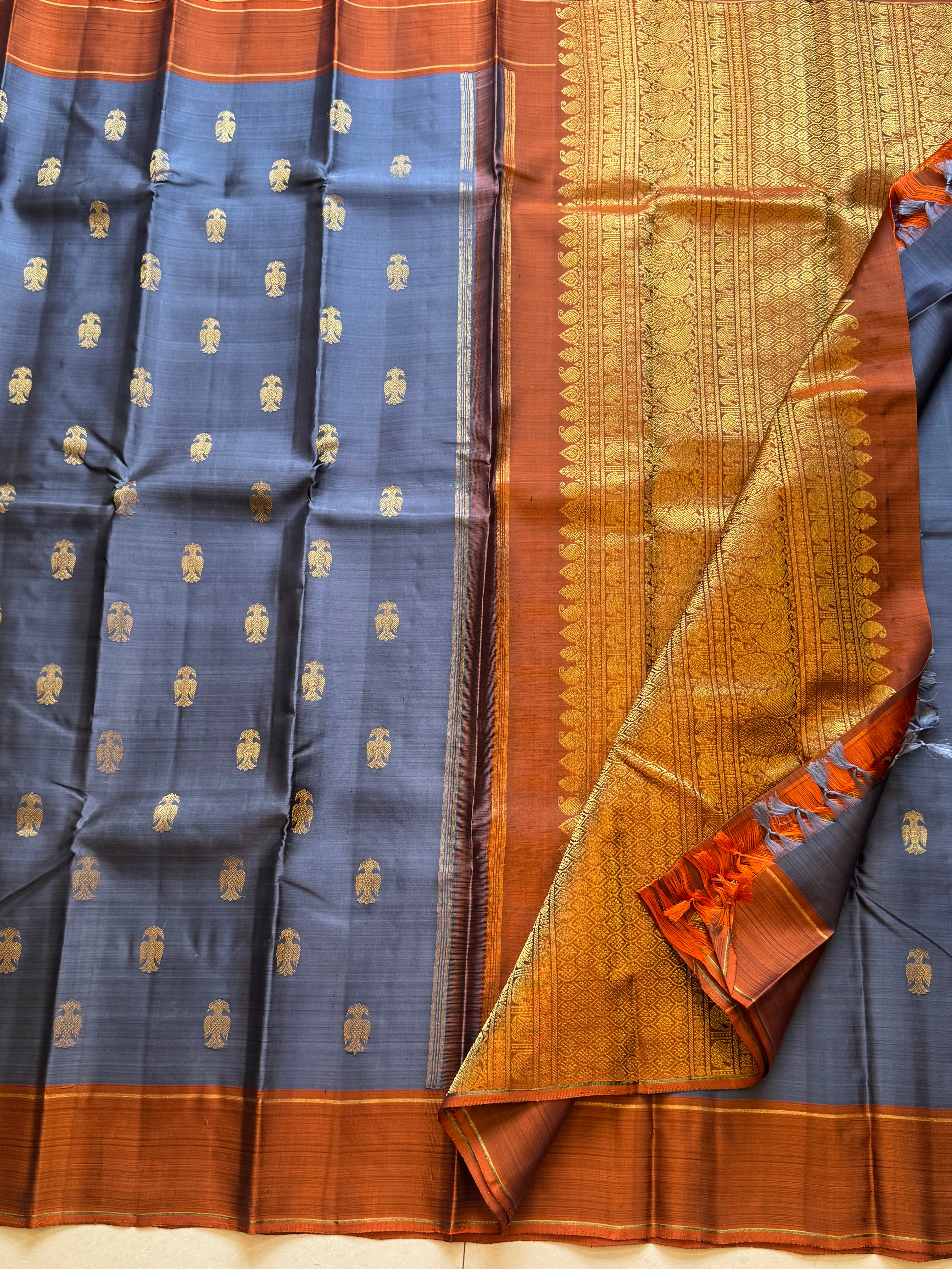 Nithya: Grey irutalaipakshi kanjipuram silk