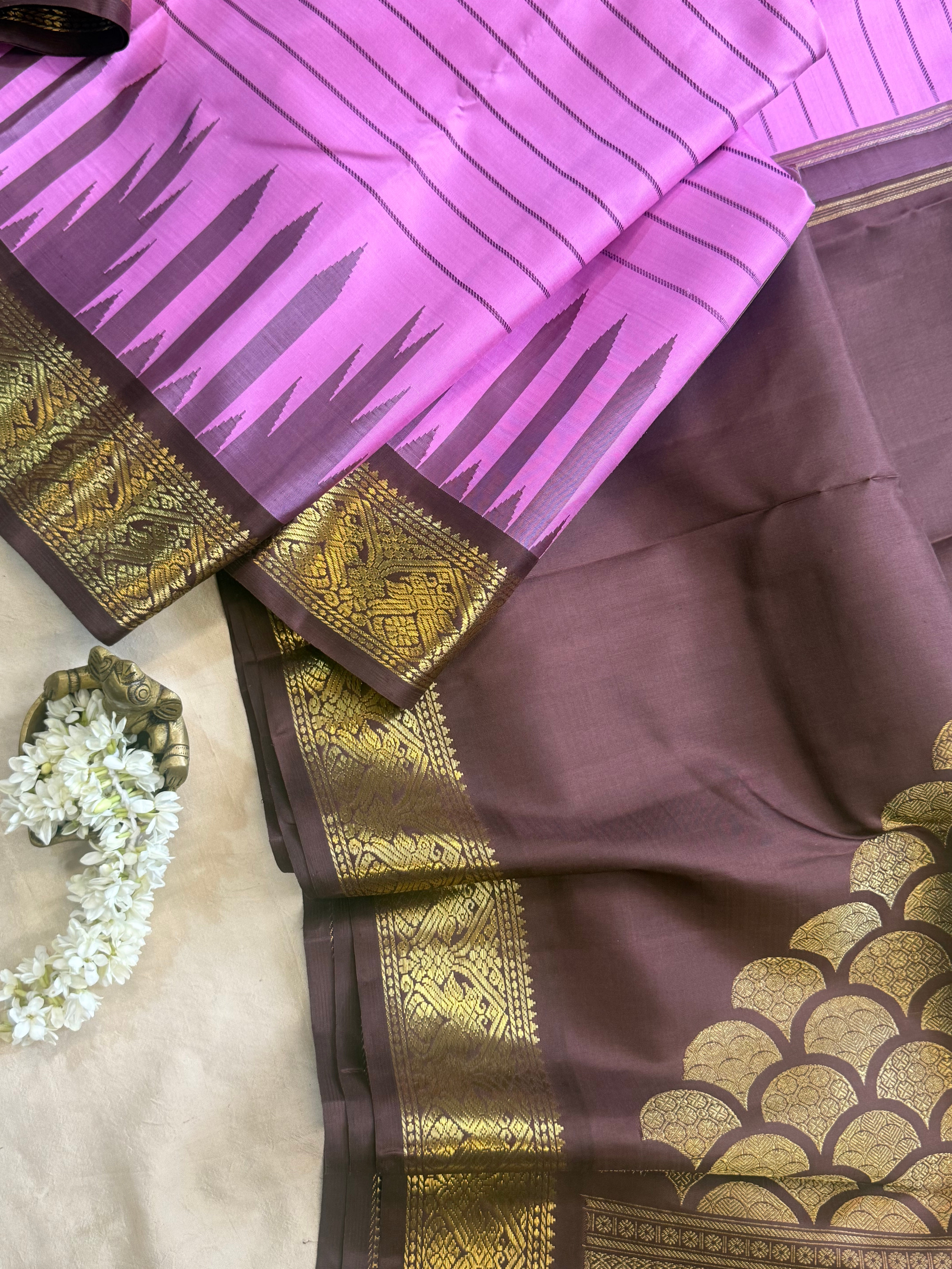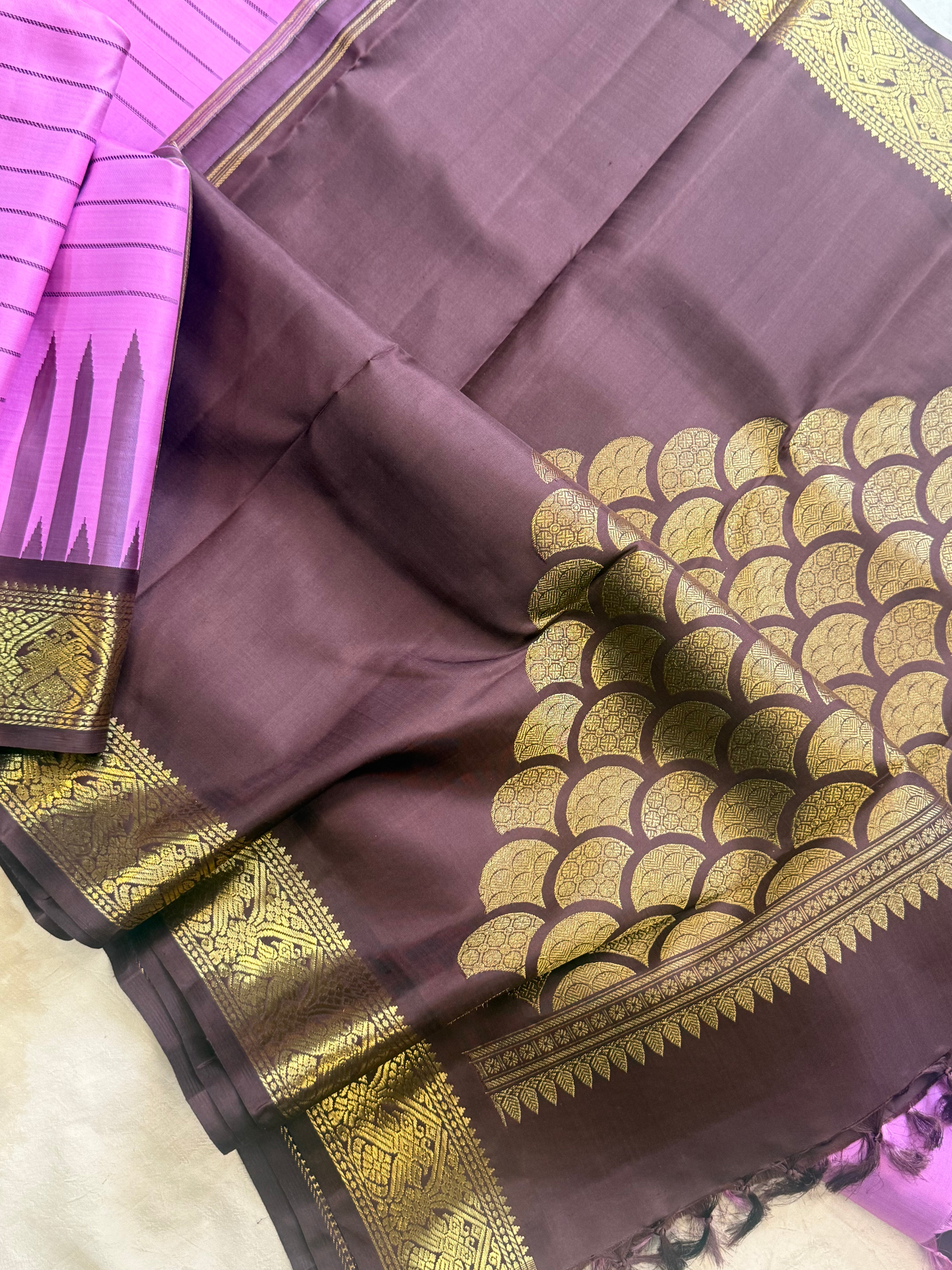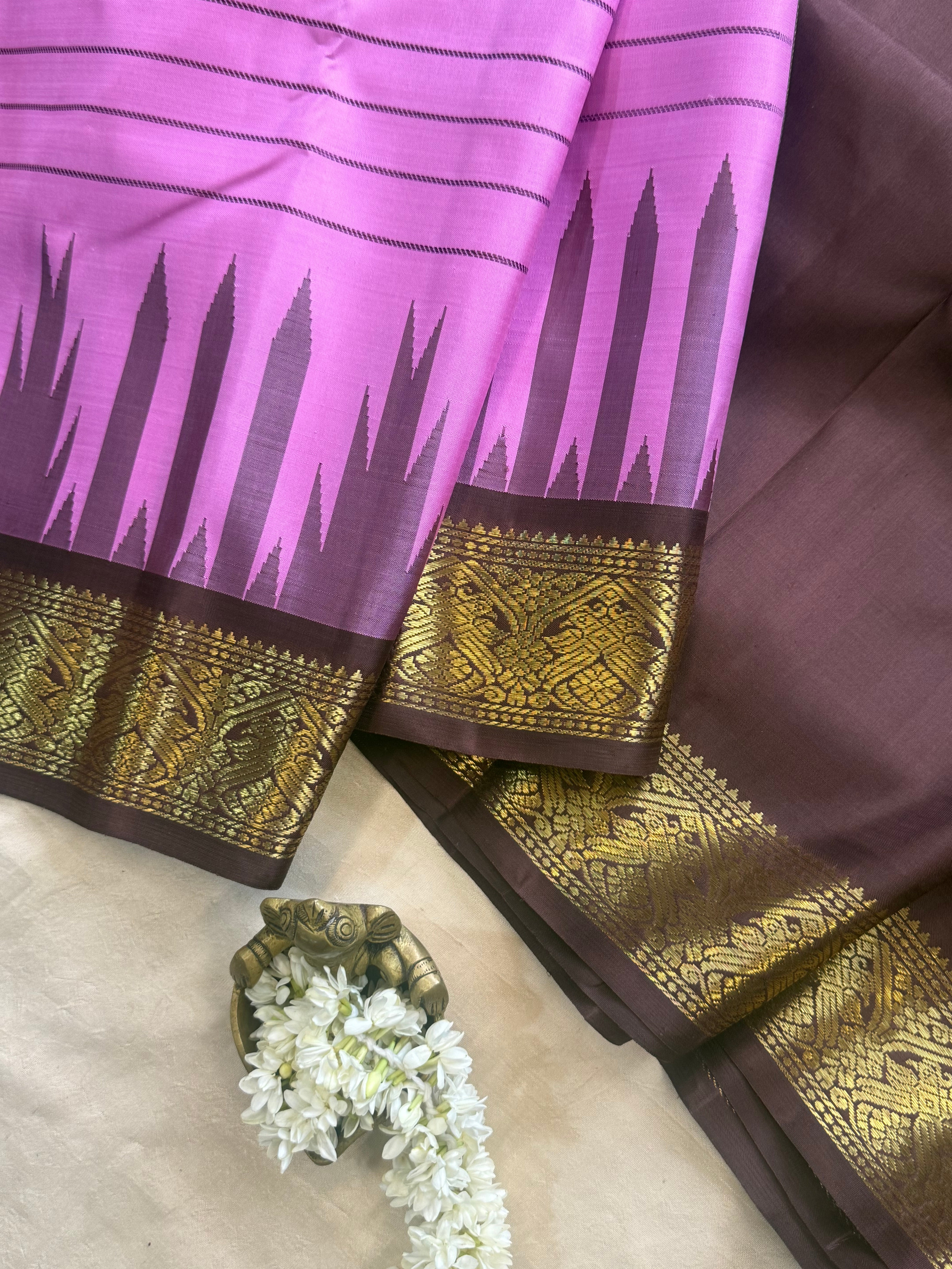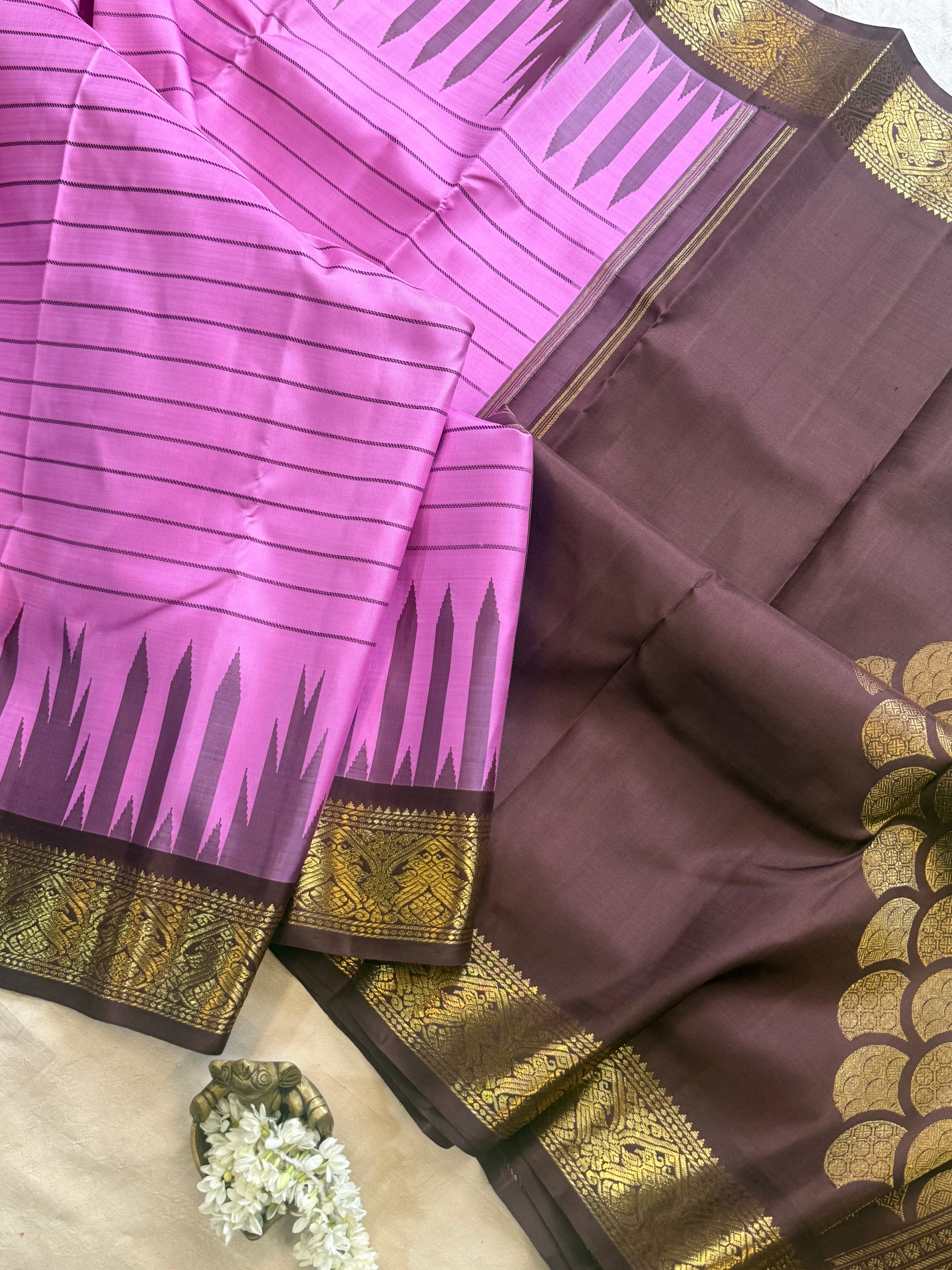 The saree is old style kanjipuram with border having Jodi parrot pet and border is chocolate Brown with temple and pencil rekku pattern and body had veldhari in thread and dense Palla in flower bouquet fashion and blouse