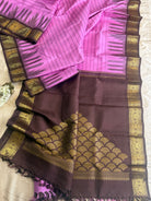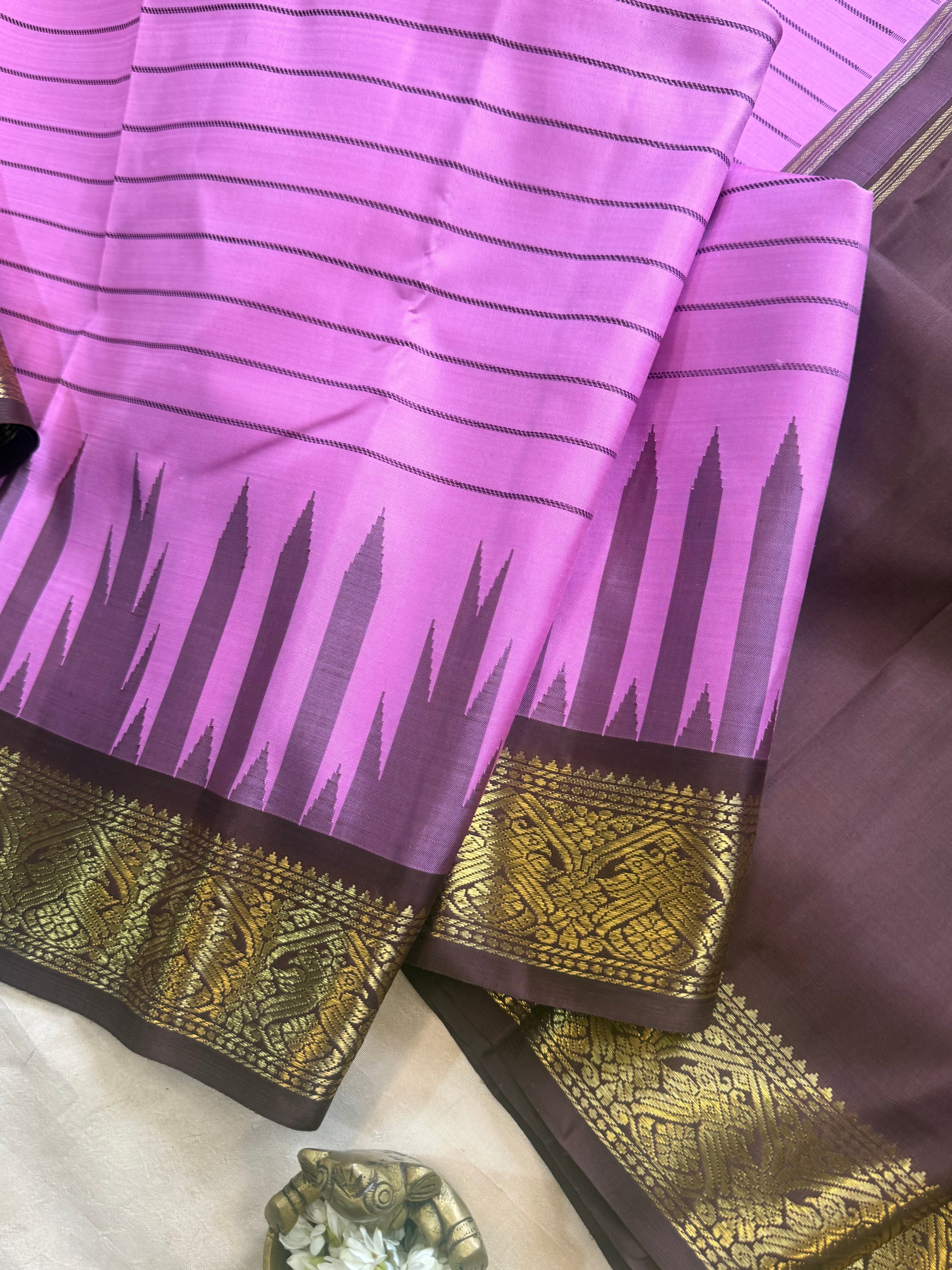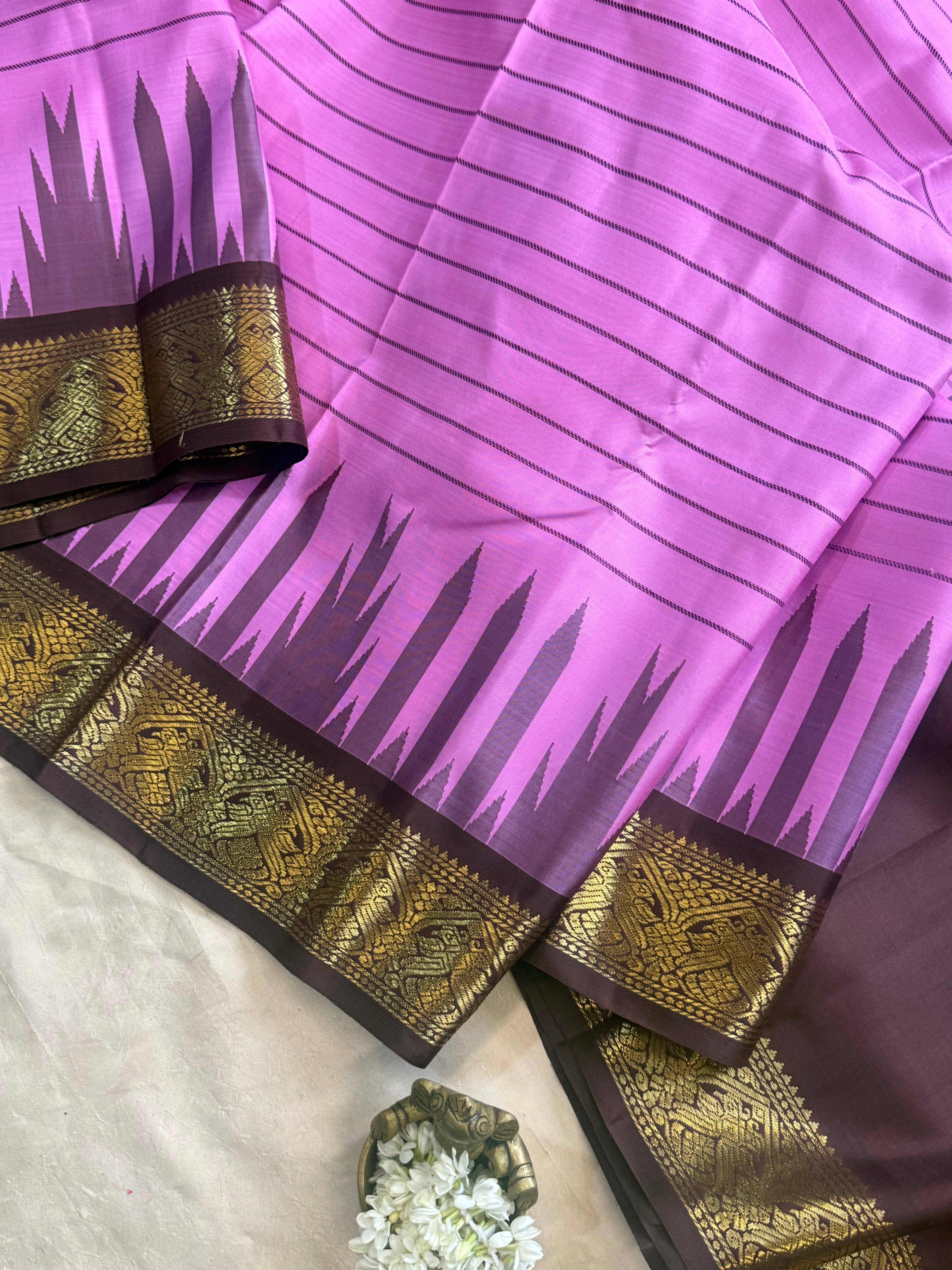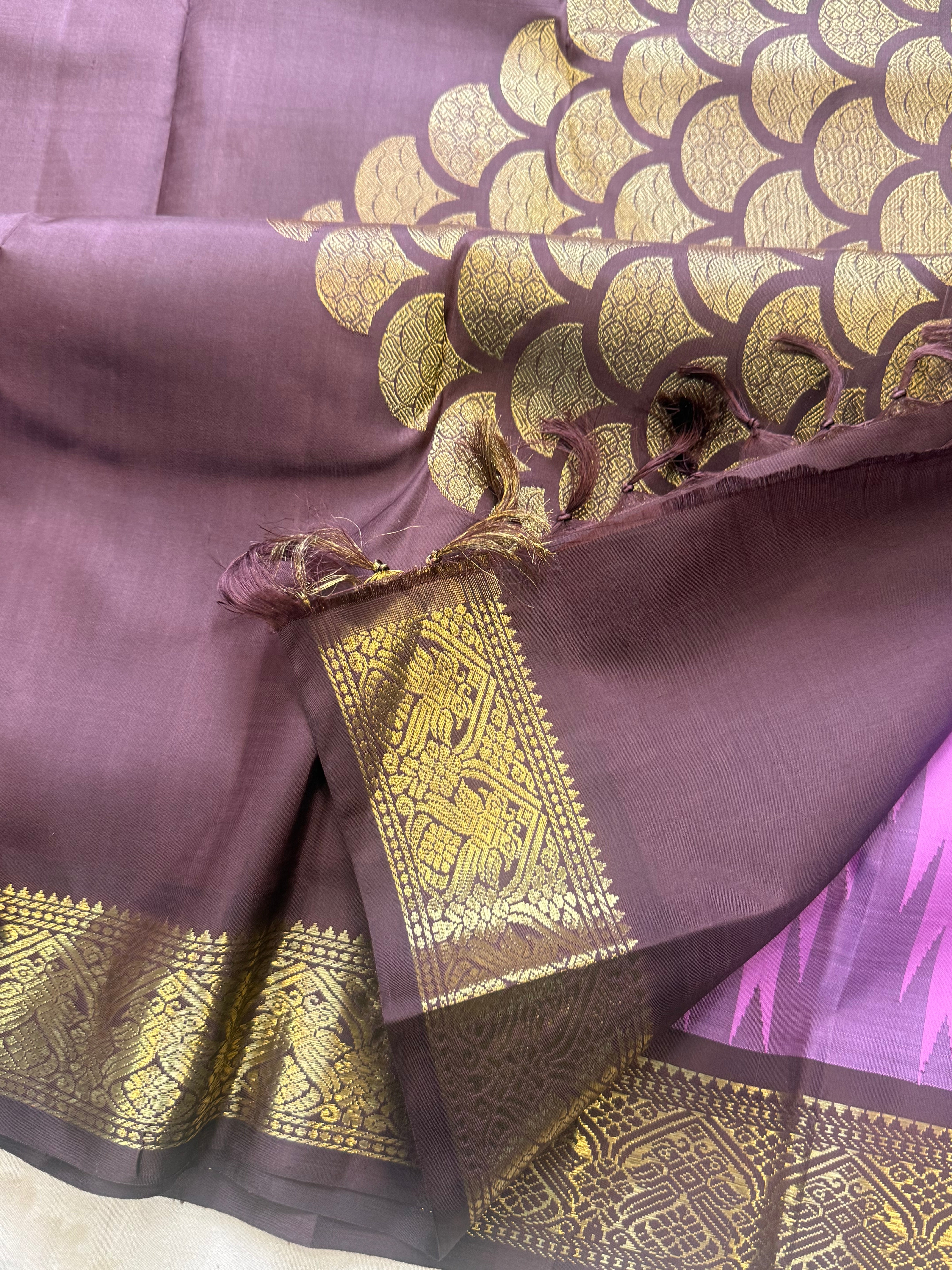 The saree is old style kanjipuram with border having Jodi parrot pet and border is chocolate Brown with temple and pencil rekku pattern and body had veldhari in thread and dense Palla in flower bouquet fashion and blouse