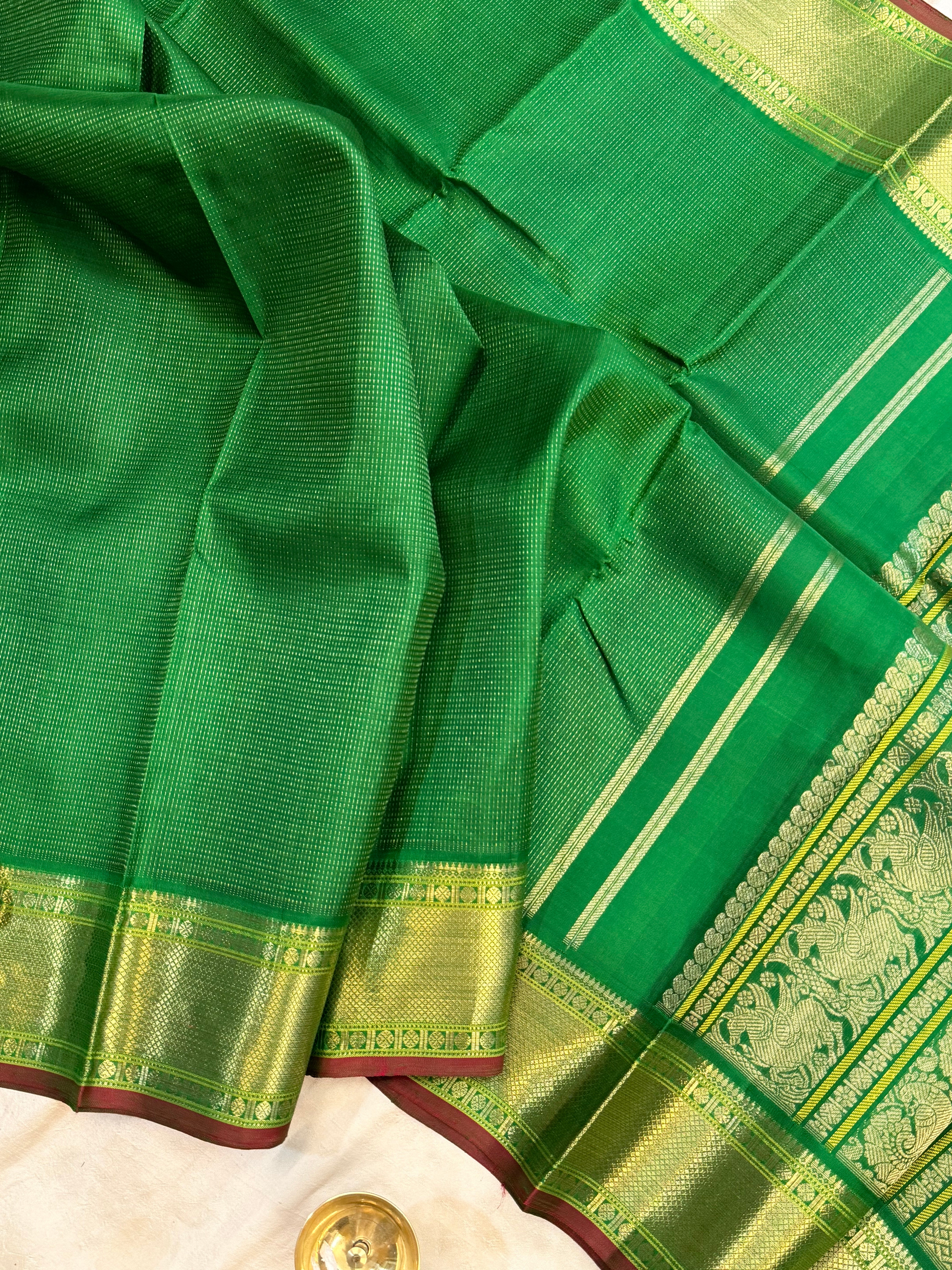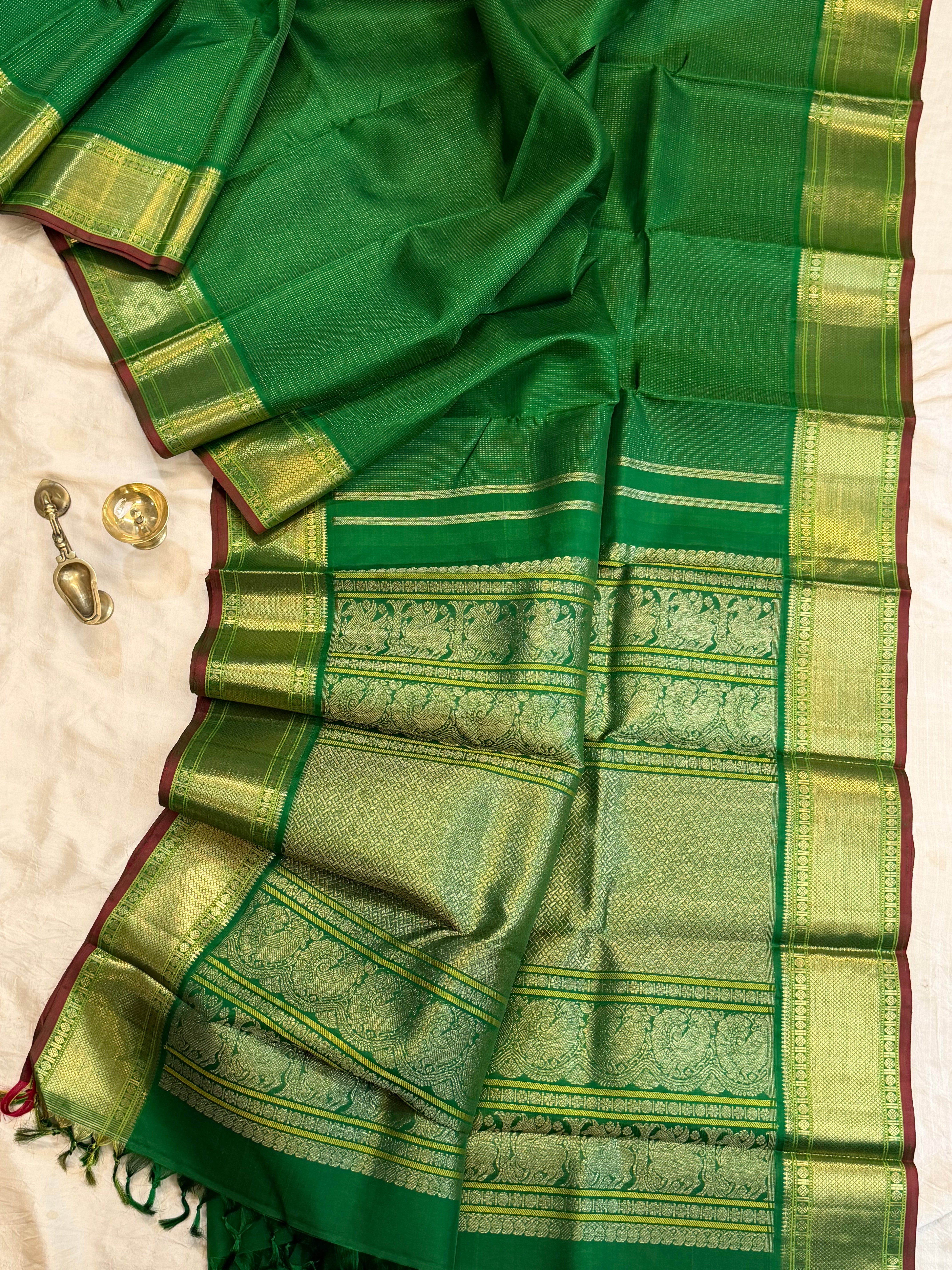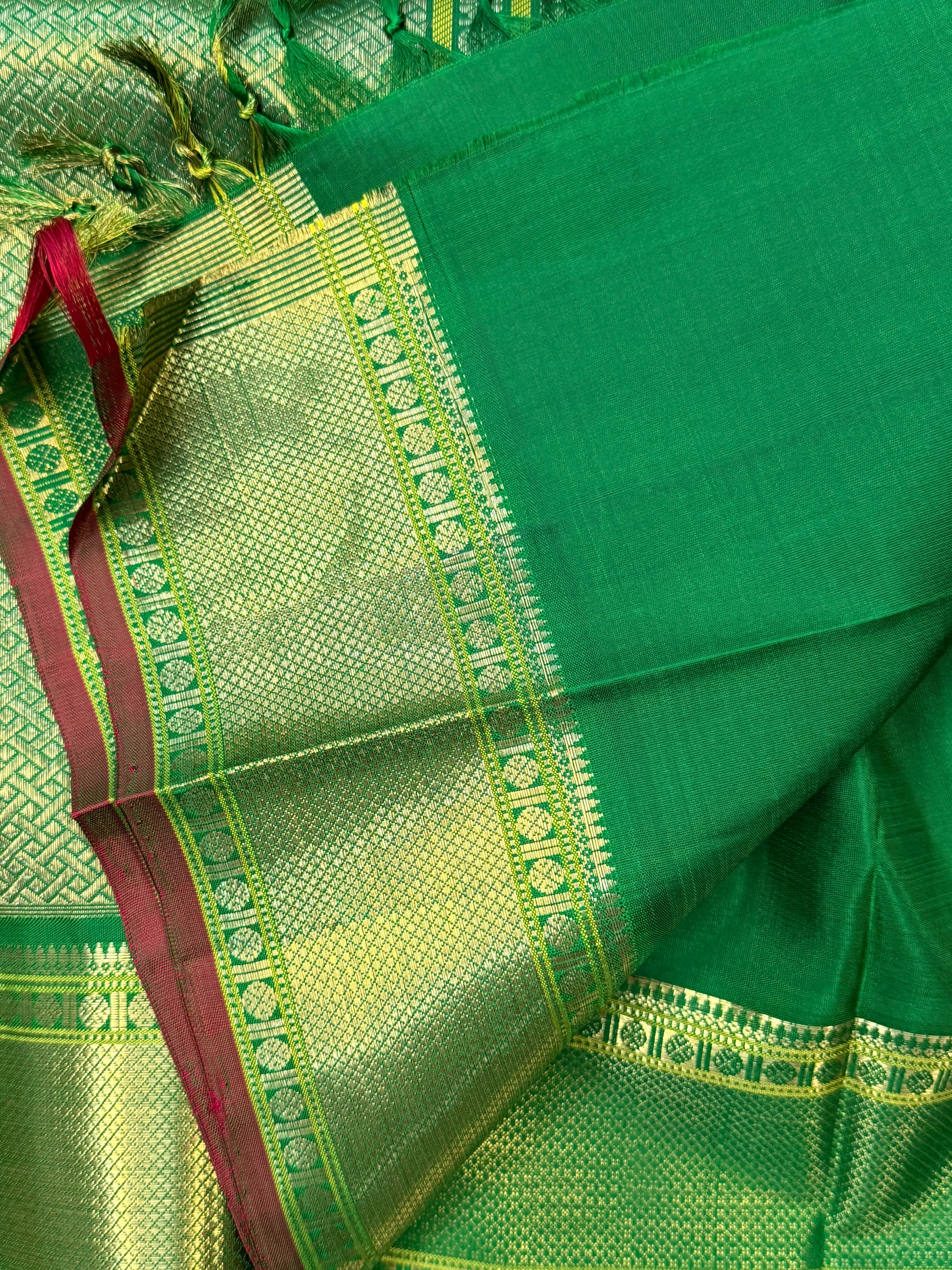 The body is green colour oosivanam in body and the border is Benaras pet  and salangai pet  and dense pure Zari palla and blouse