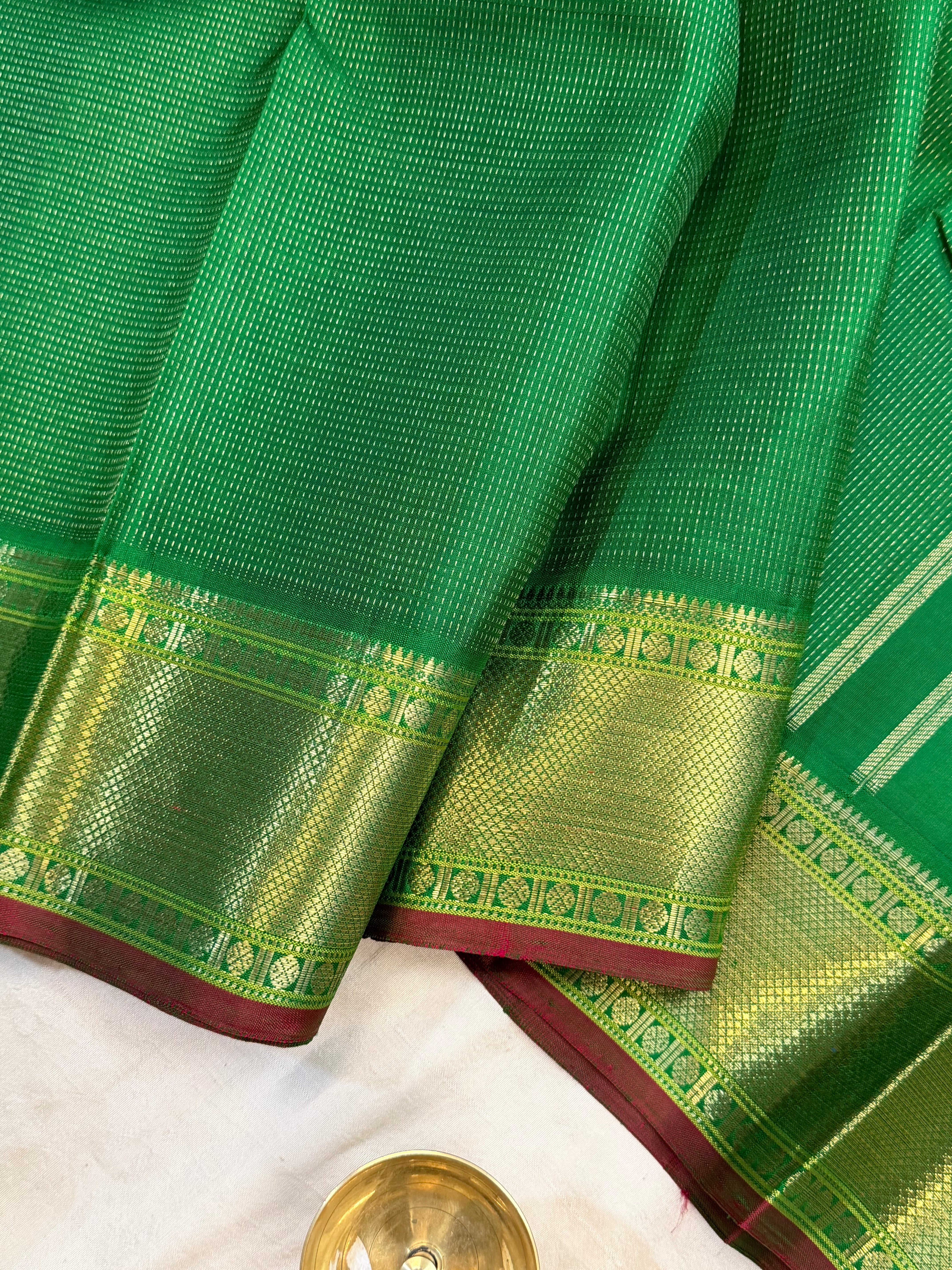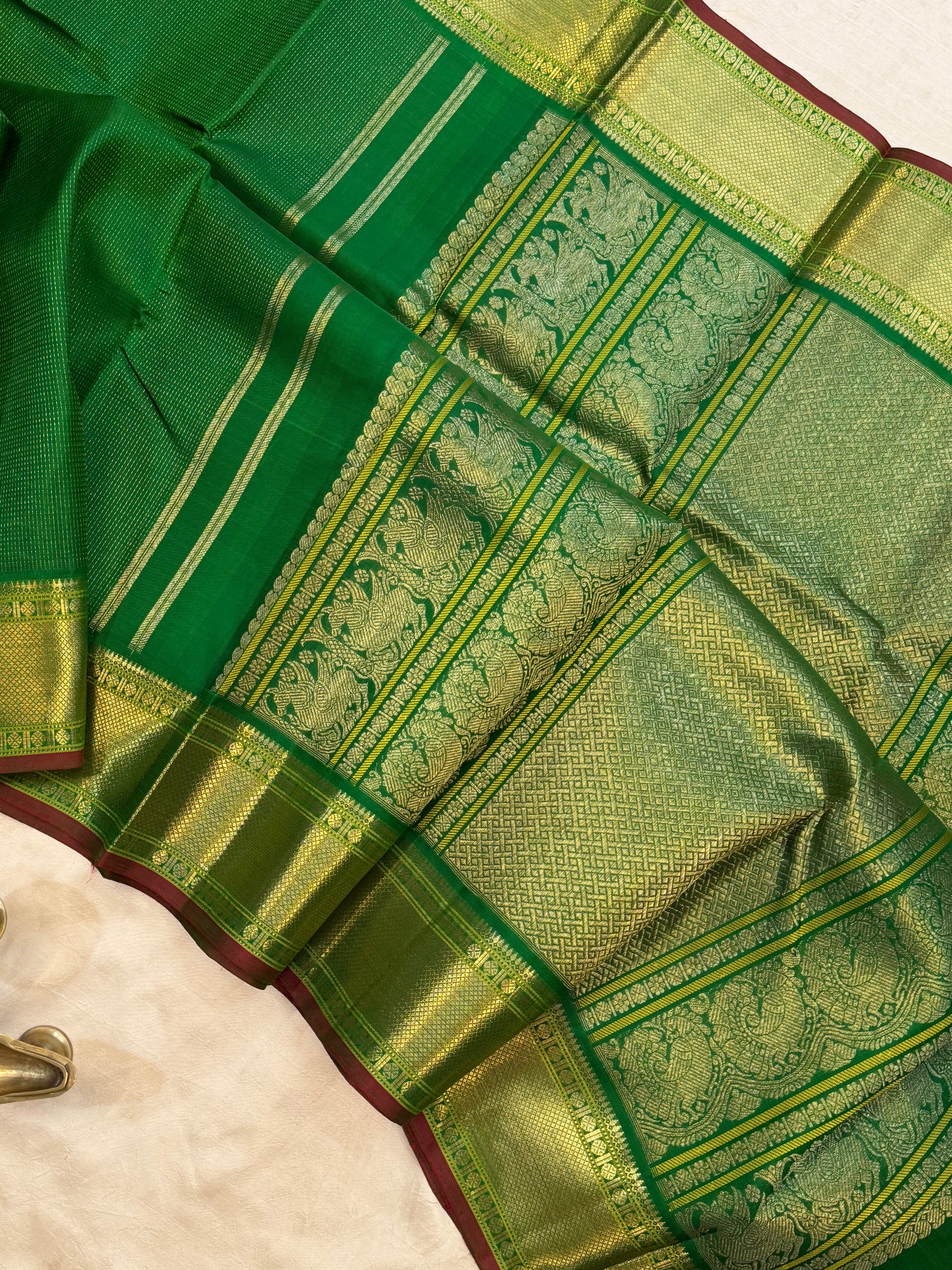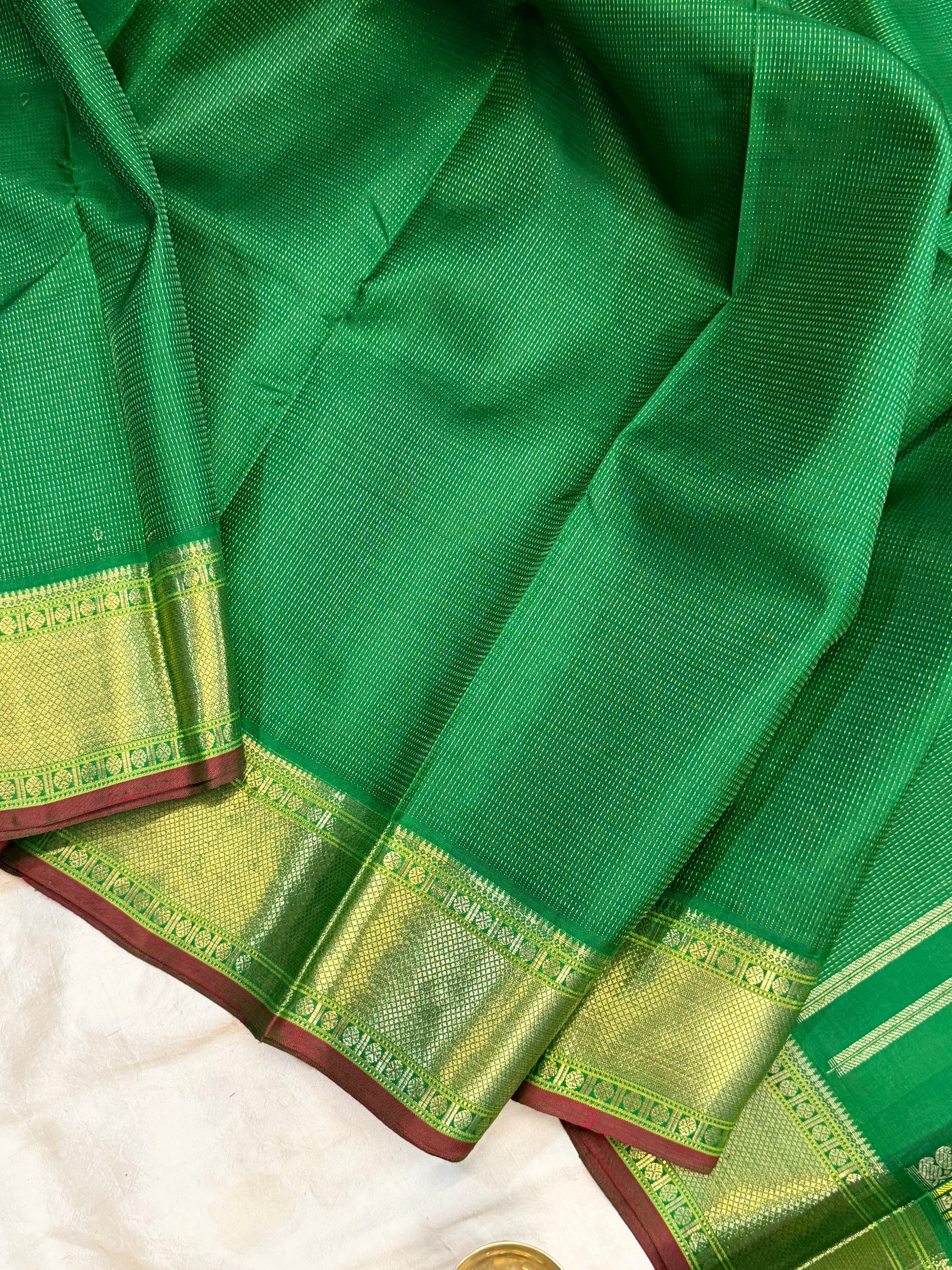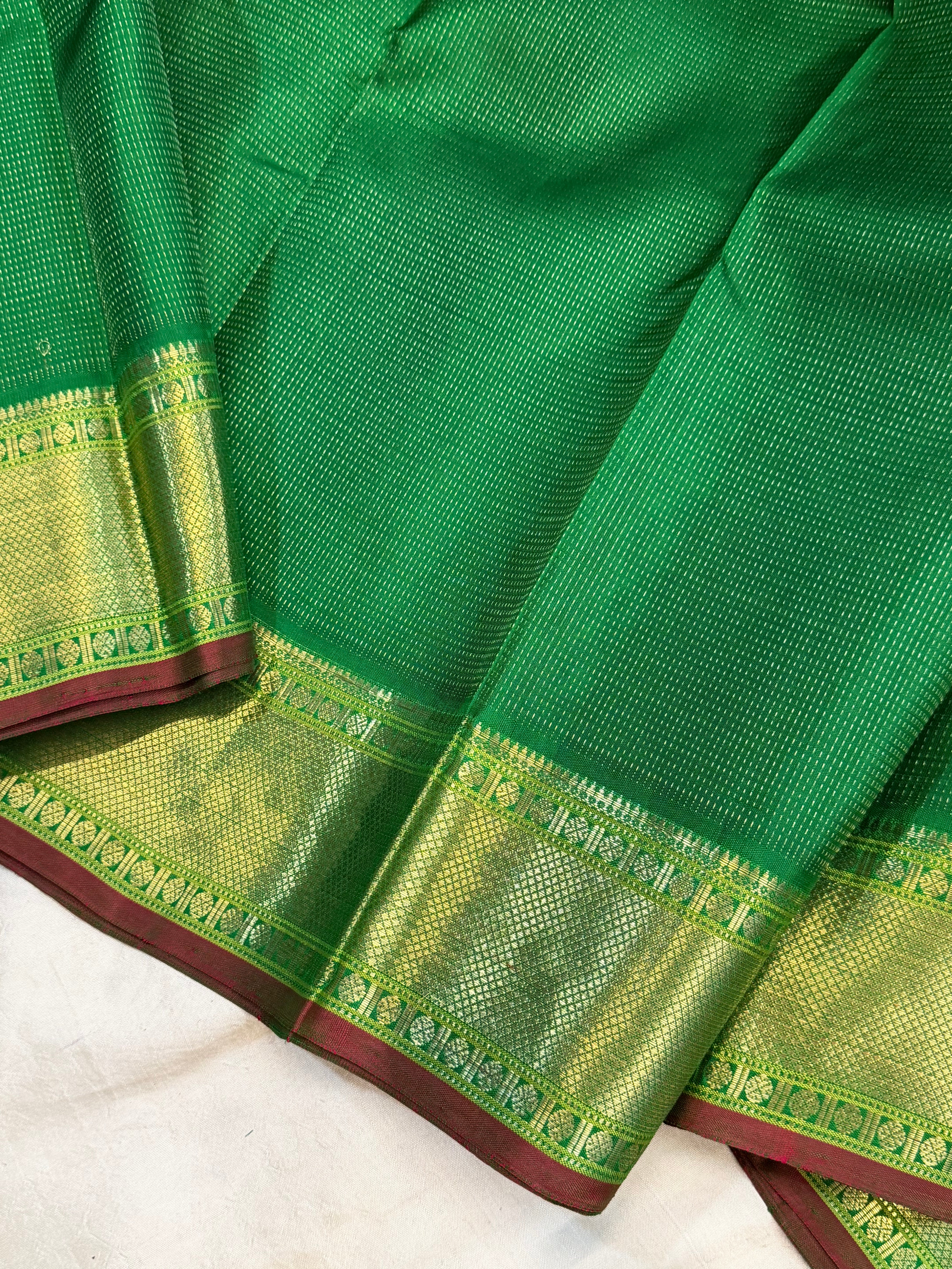 The body is green colour oosivanam in body and the border is Benaras pet  and salangai pet  and dense pure Zari palla and blouse