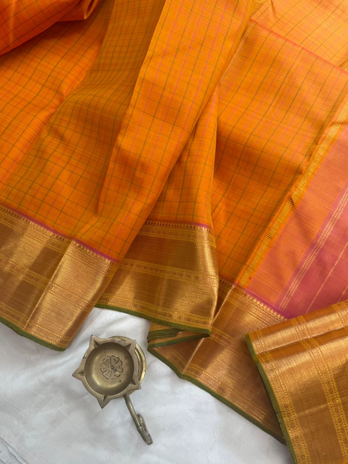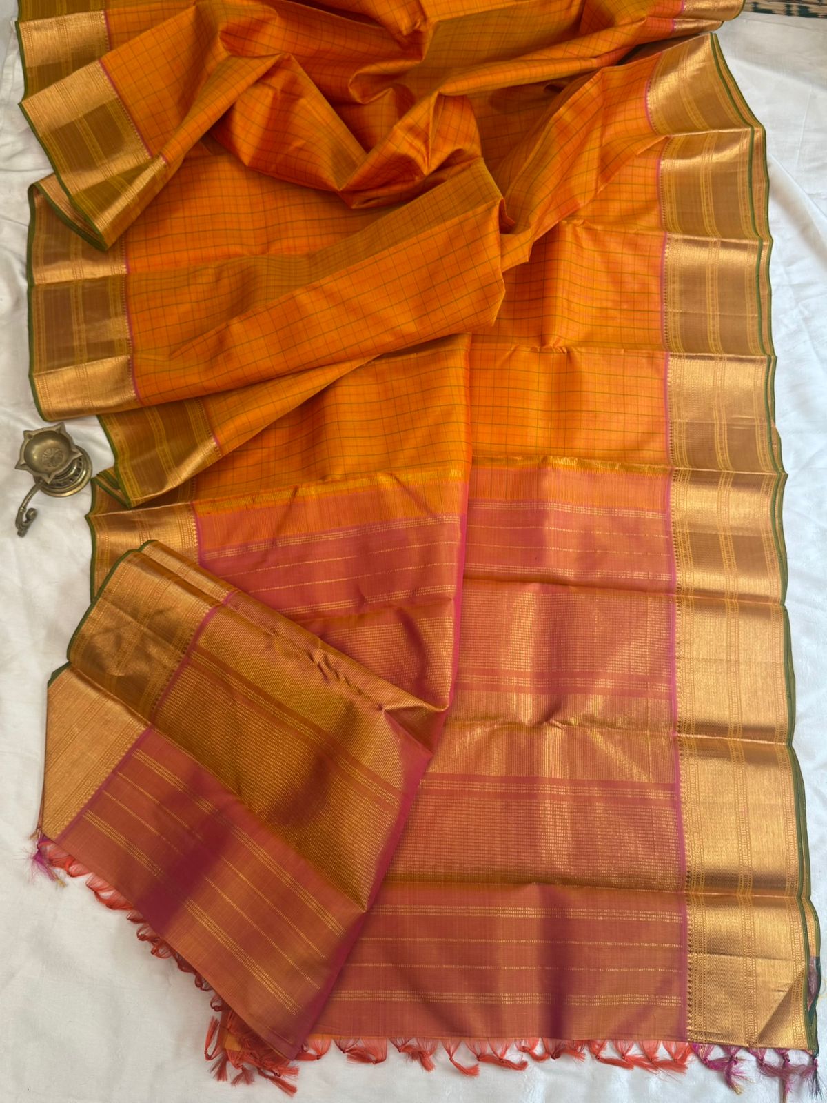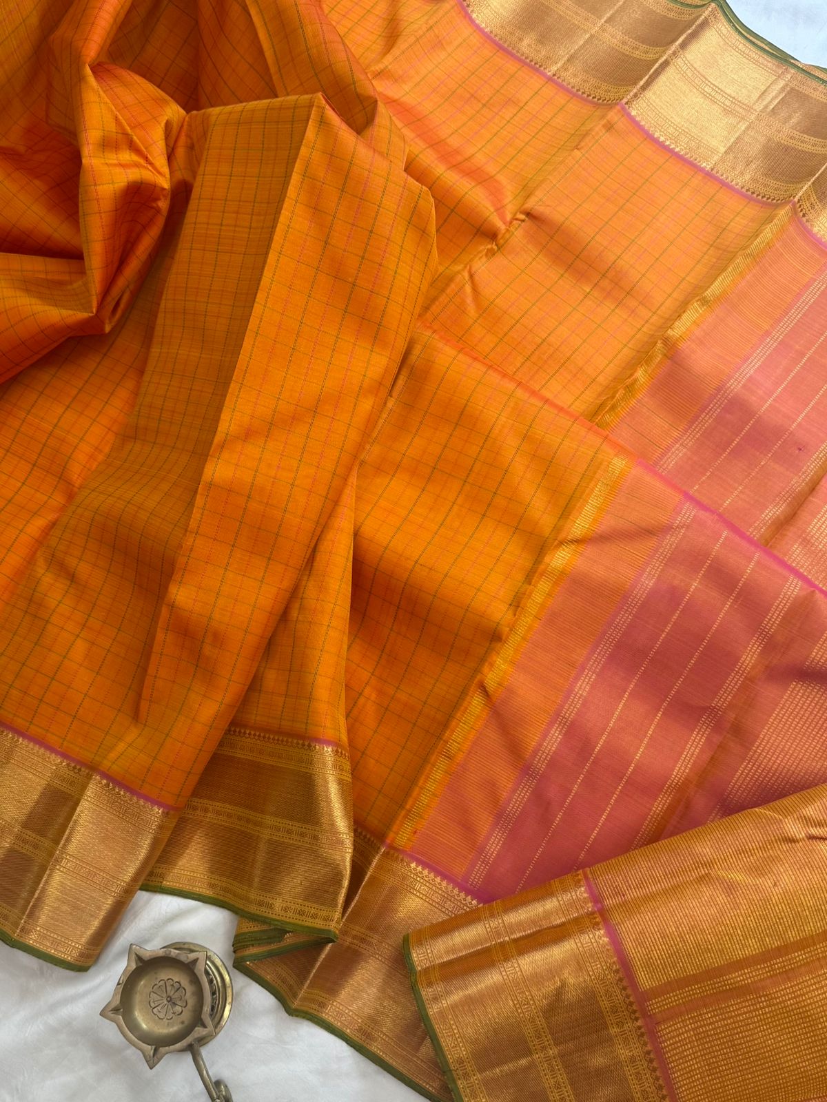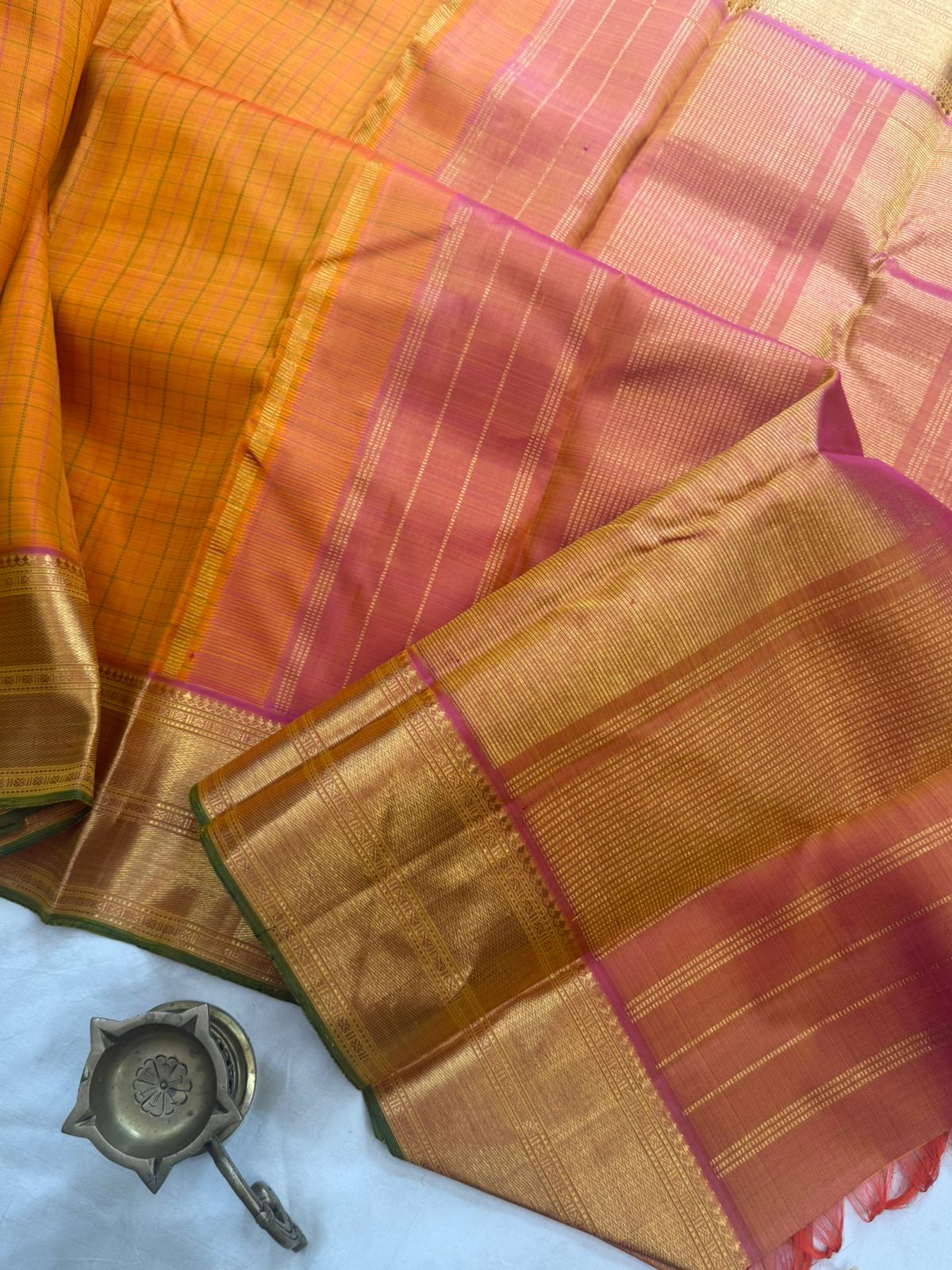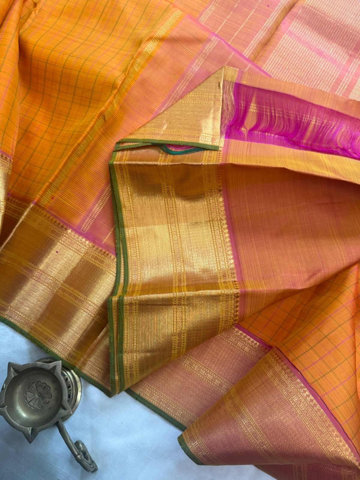 Mango yellow with pink and green kattam / arani silk