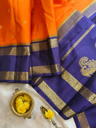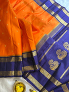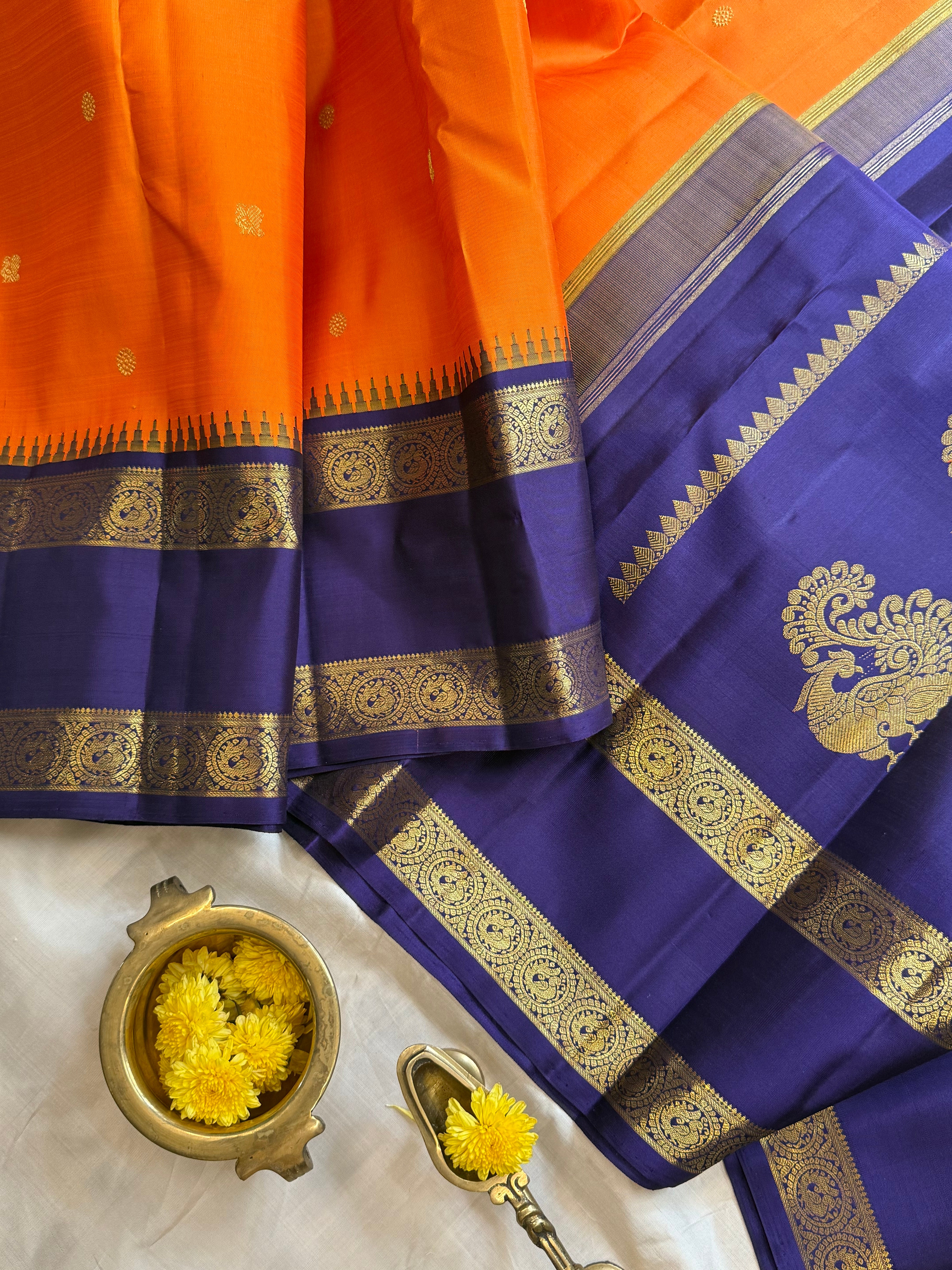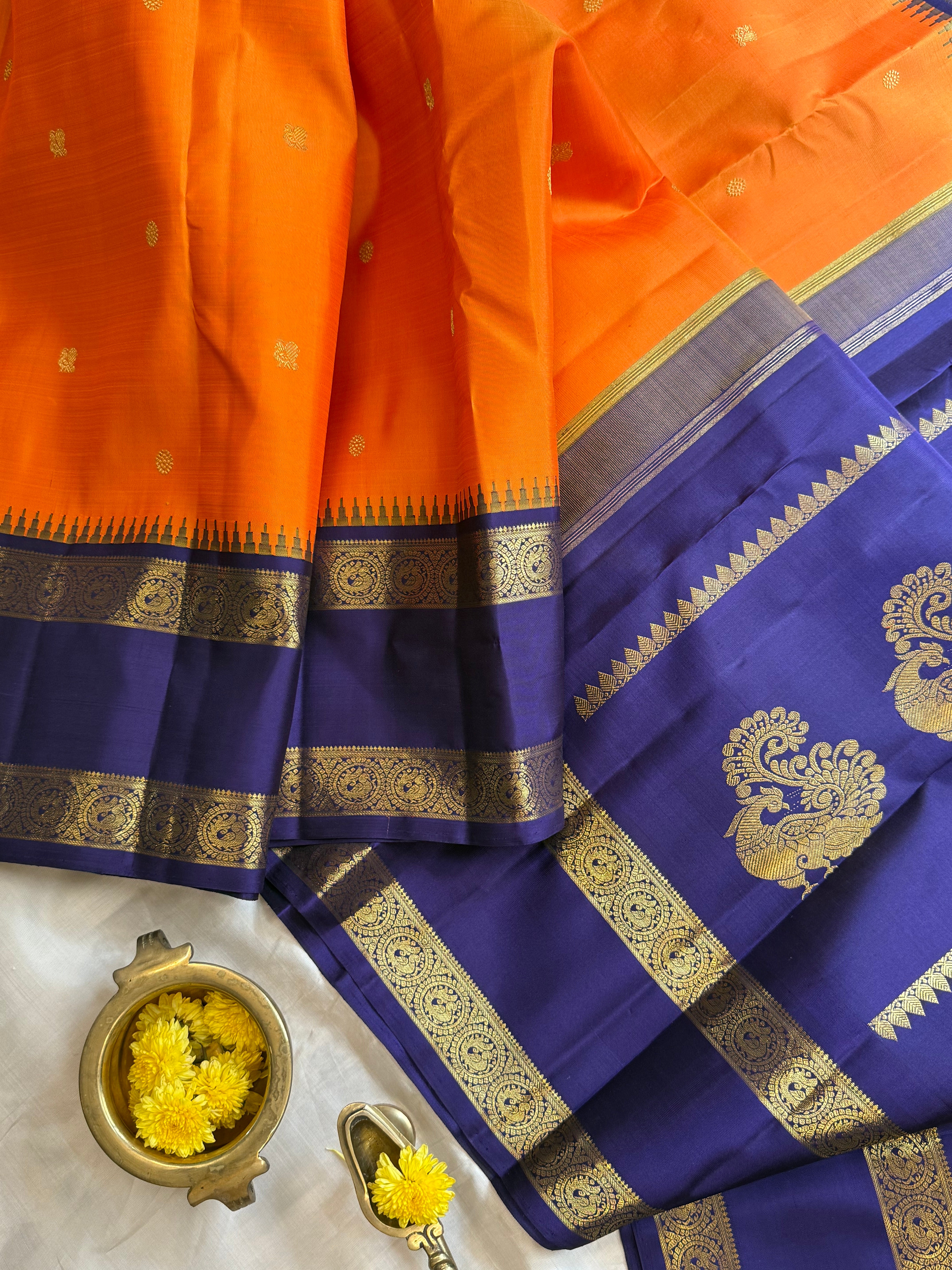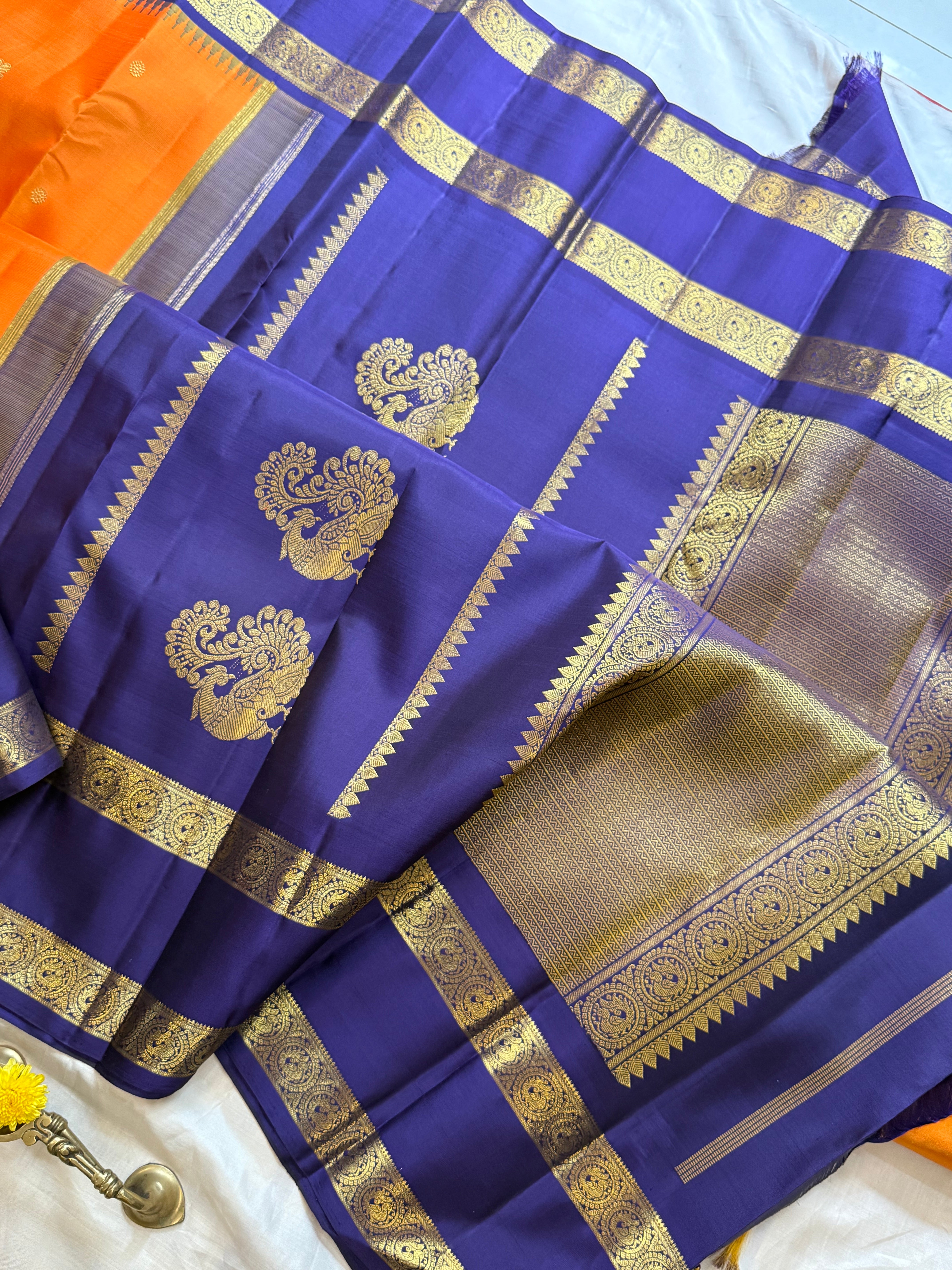 The body is carrot orange color with blue border Kai Korvai with pillayar Moggu Korvai with retta pet round annam pet border and the body has annam chakram Butta and the Palla is a unique Palla with thogai peacock Butta in thindu portion and dense Palla and pure Zari.