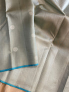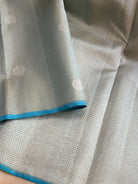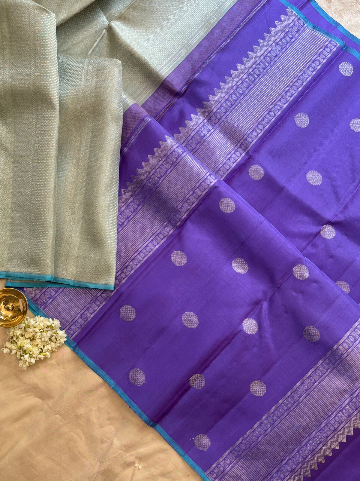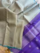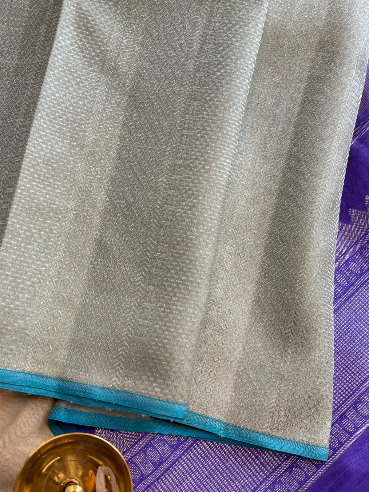 The saree is powder blue color with dense varisapet Zari towards the chest portion in silver Zari and the pleats have round coin style Butta and the Palla is lavender in silver Zari and blouse