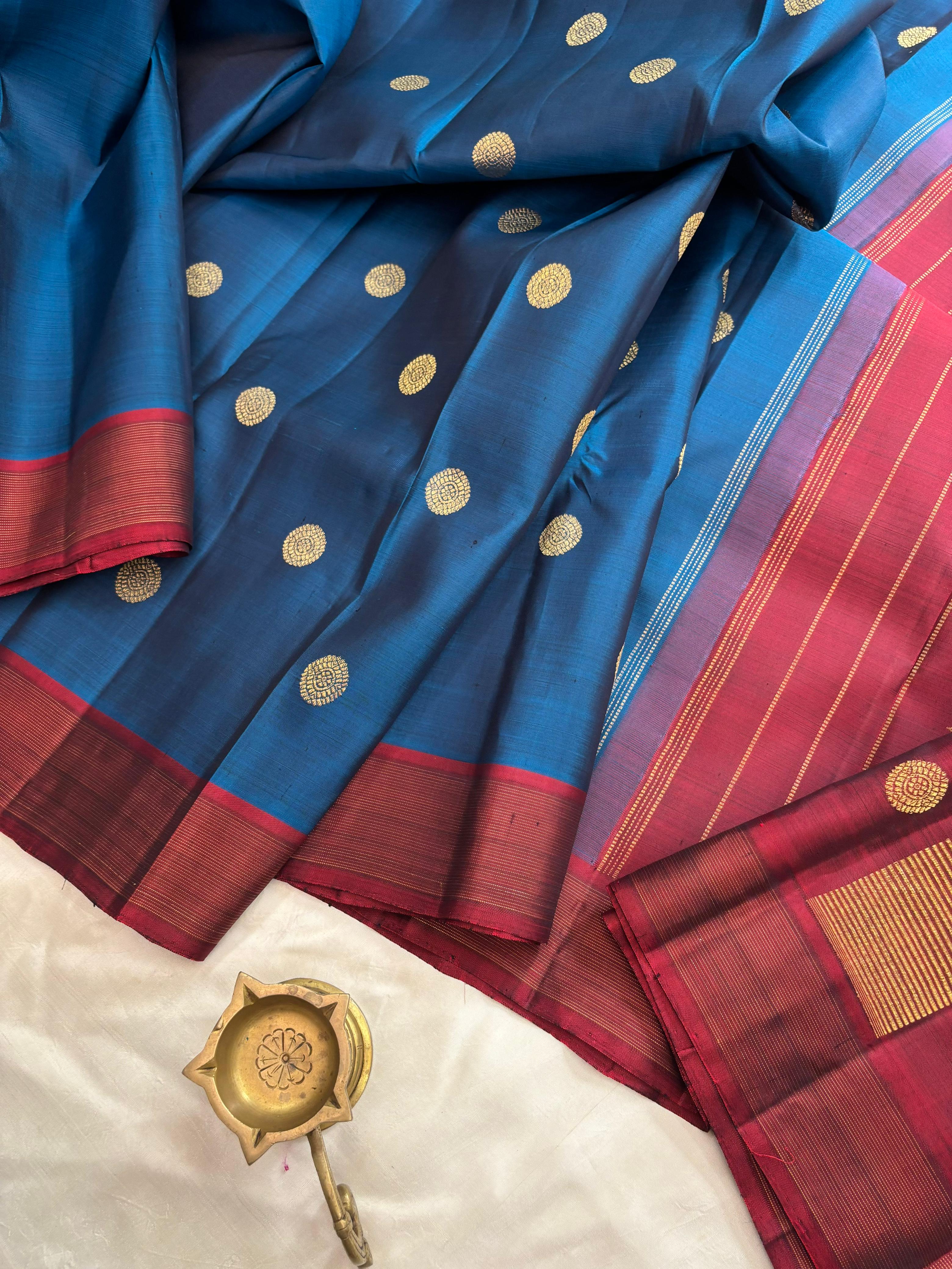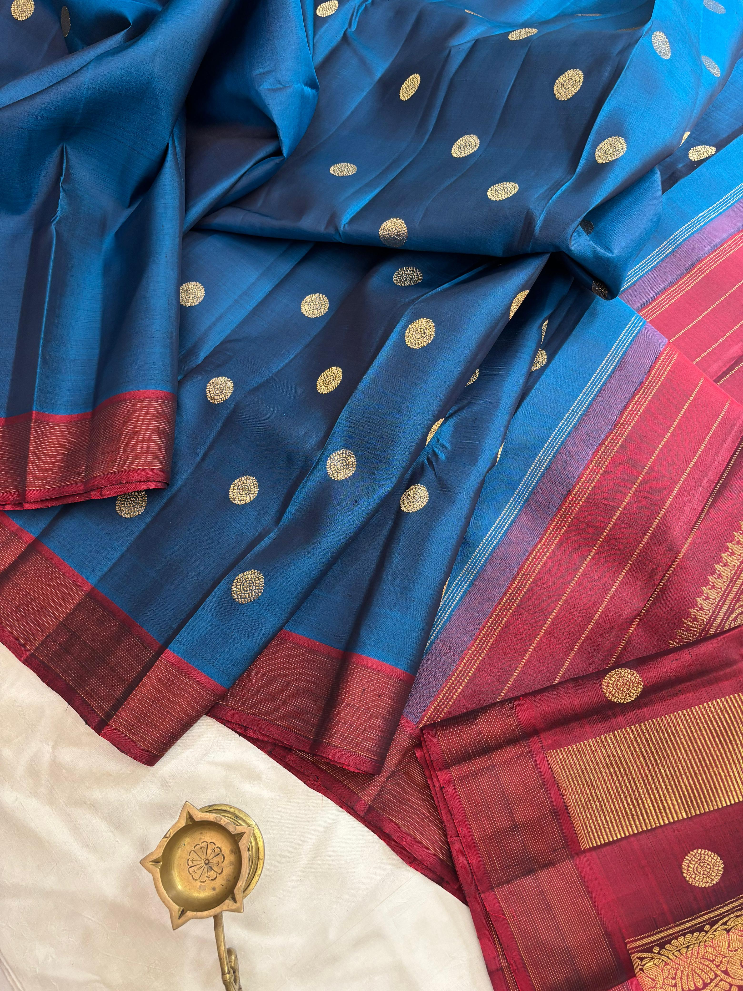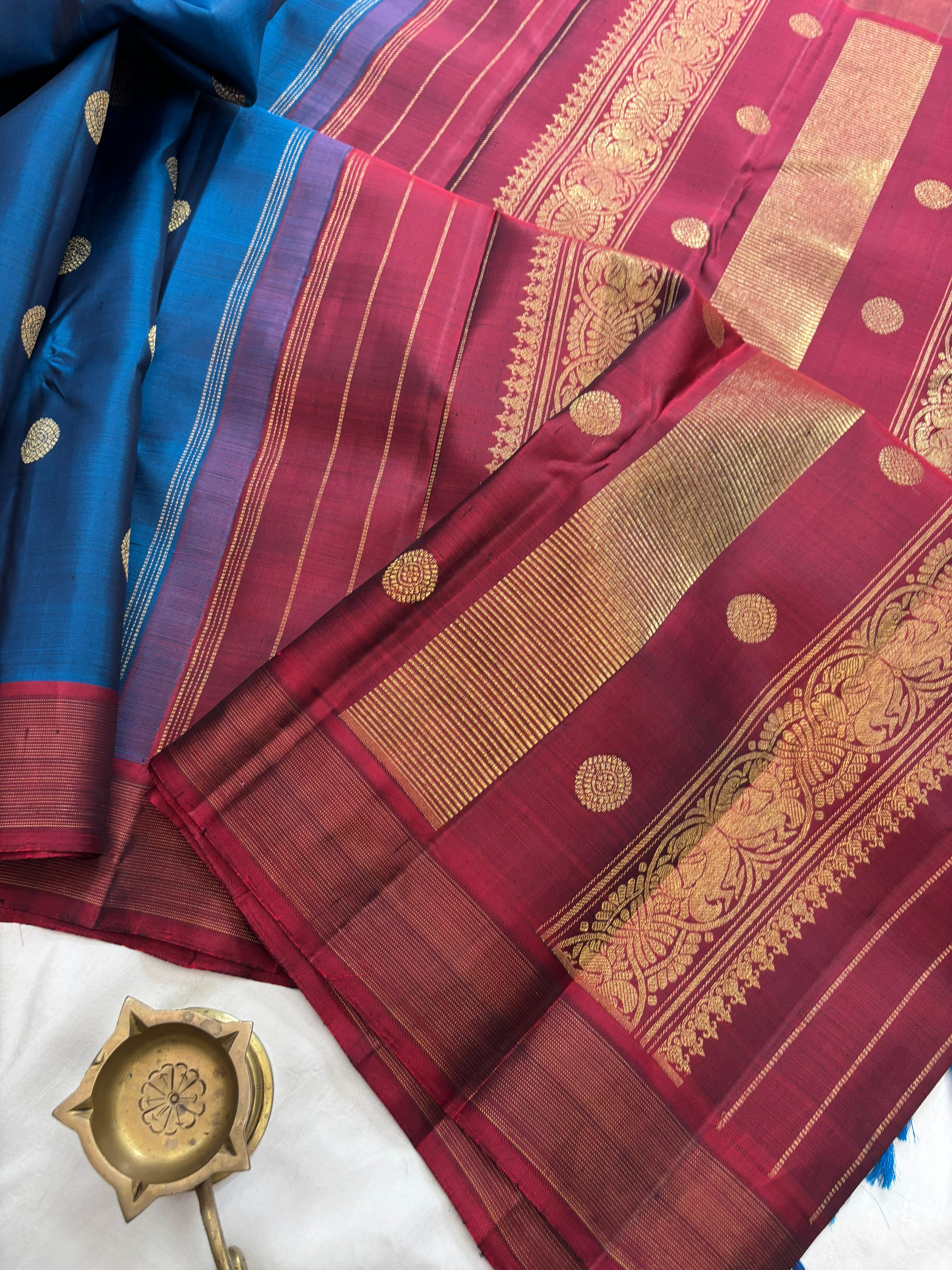 Such a lovely shade of teal peacock blue with annam chakram Butta and the border is brown vairaoosi border and rich dense pure zari Palla and blouse
