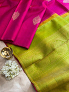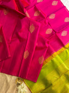 The body has pink with jodi kili butta , pallu in lime green in detailed with attached blouse