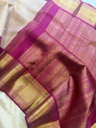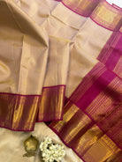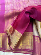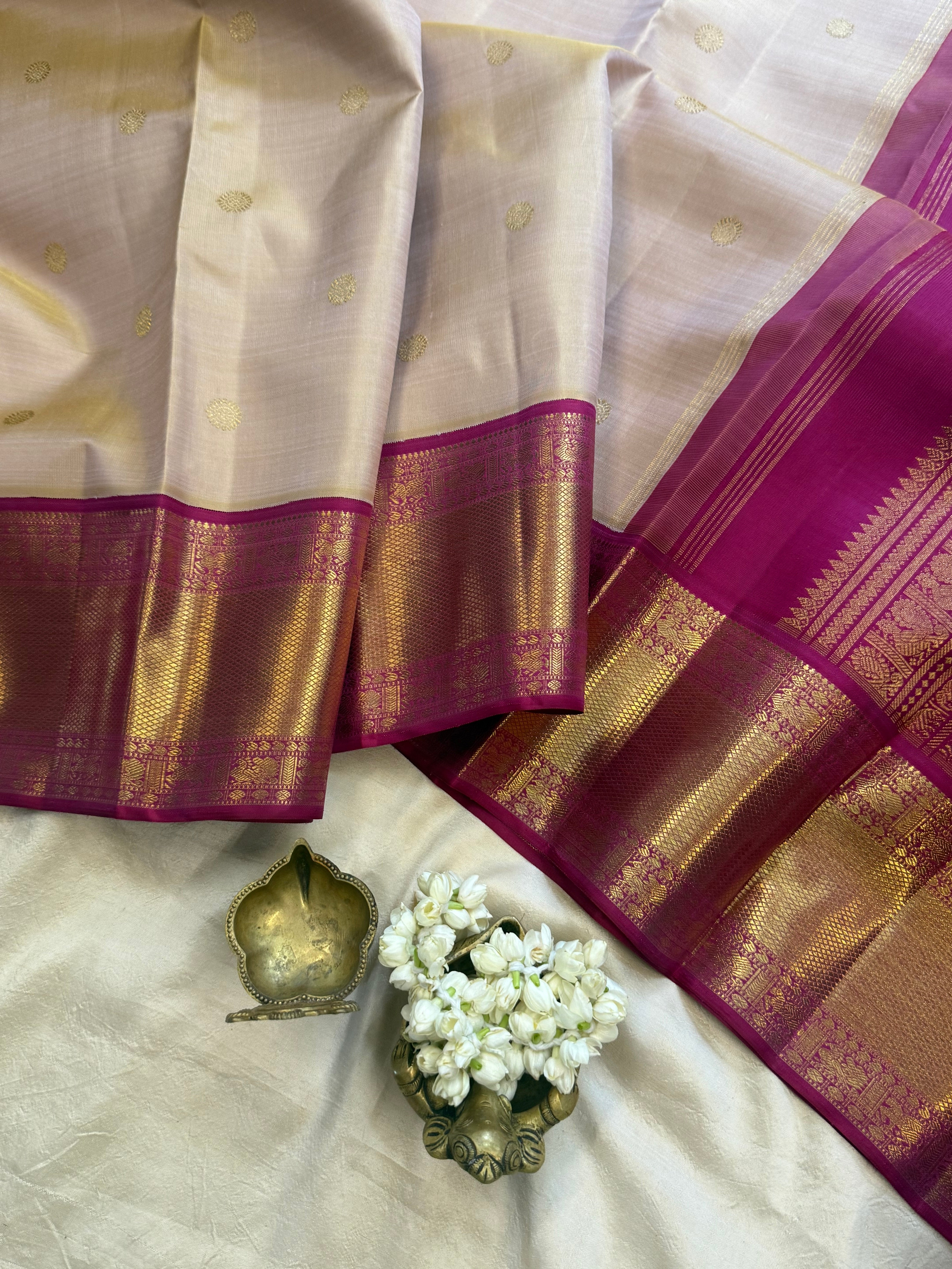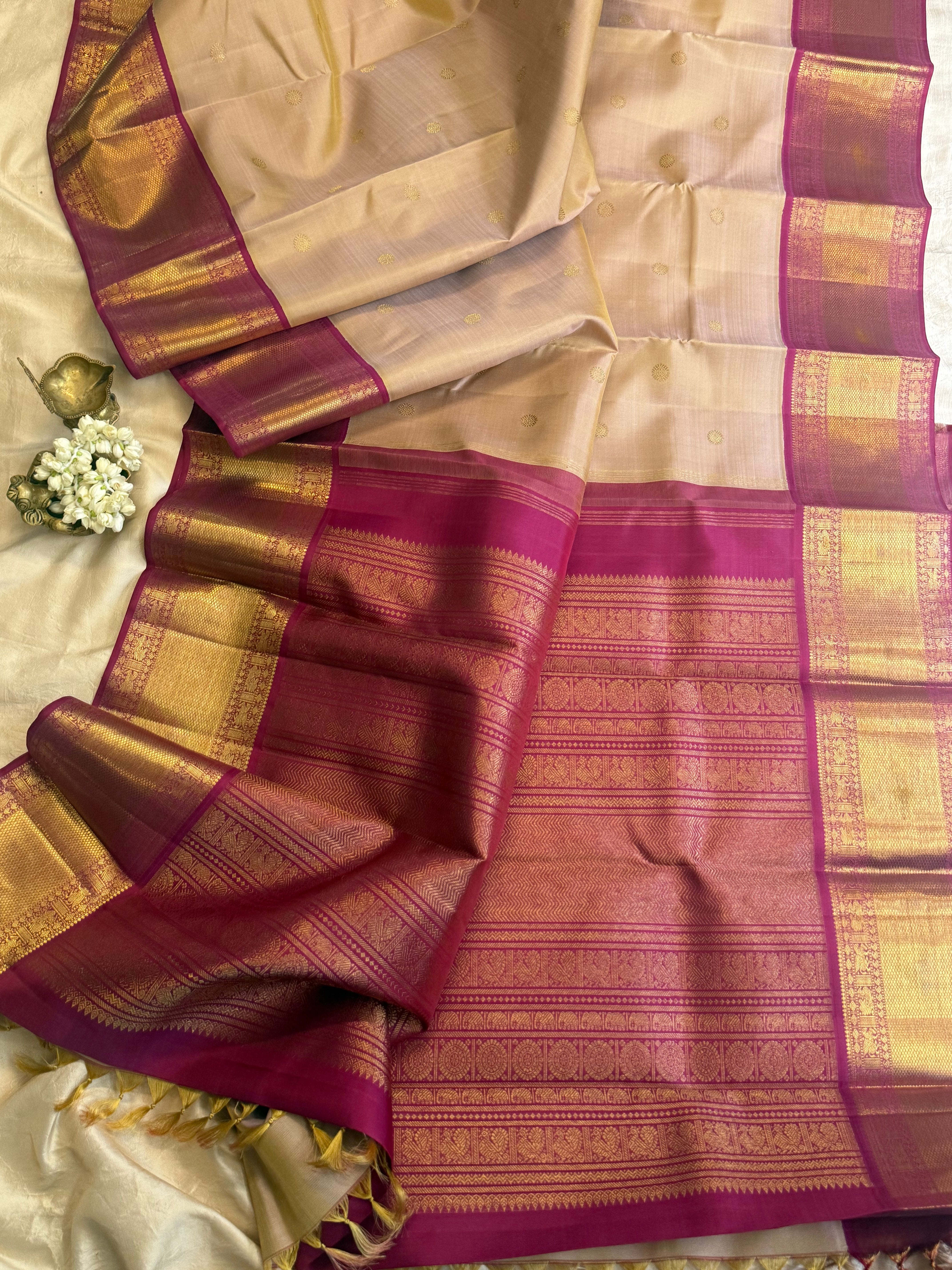The saree is geva colour ( light biscuit color with pink shot ) with body has Kamalam Butta and the border is unusual pink dense border with annam flying horse and Kuil kann pet and dense pure Zari Palla and blouse