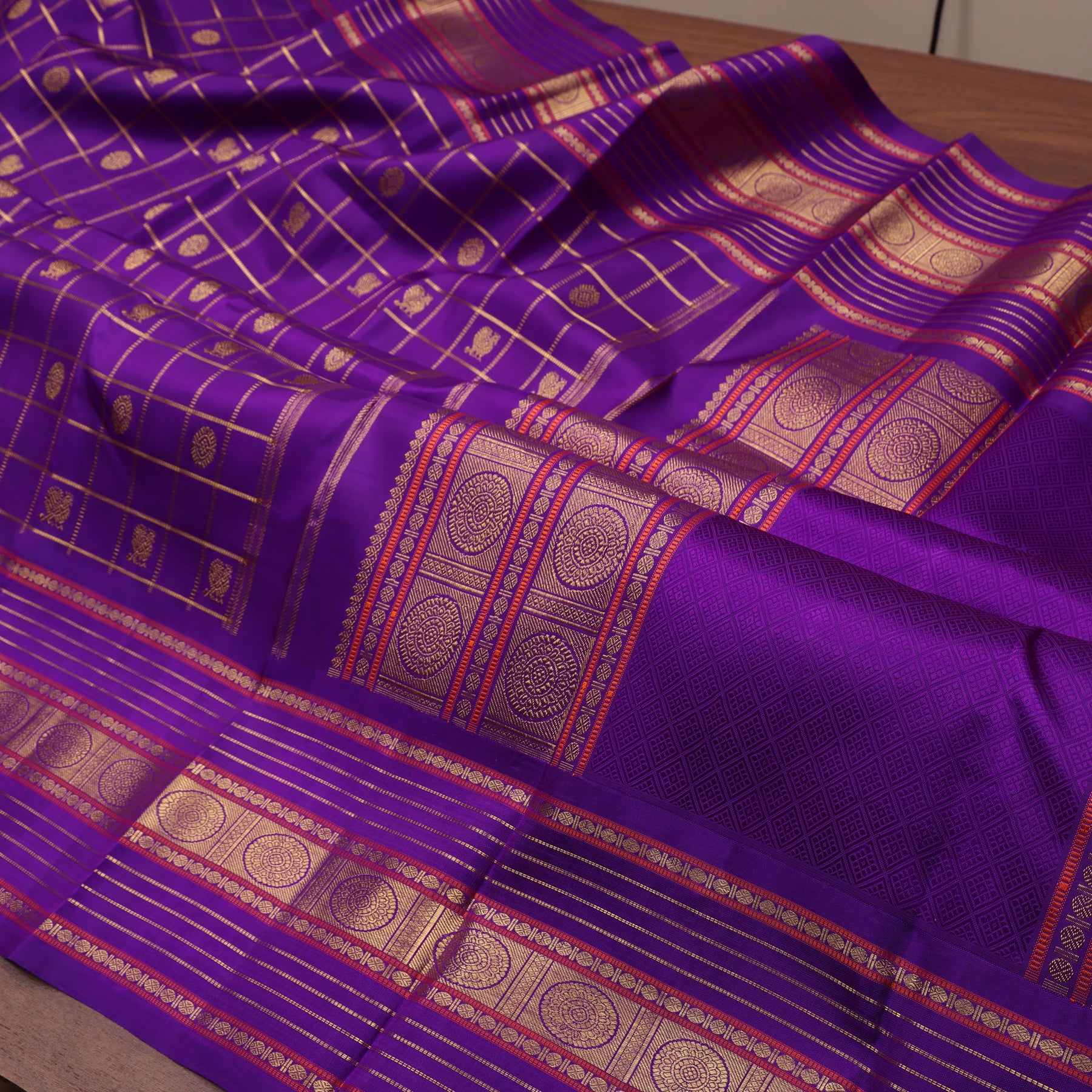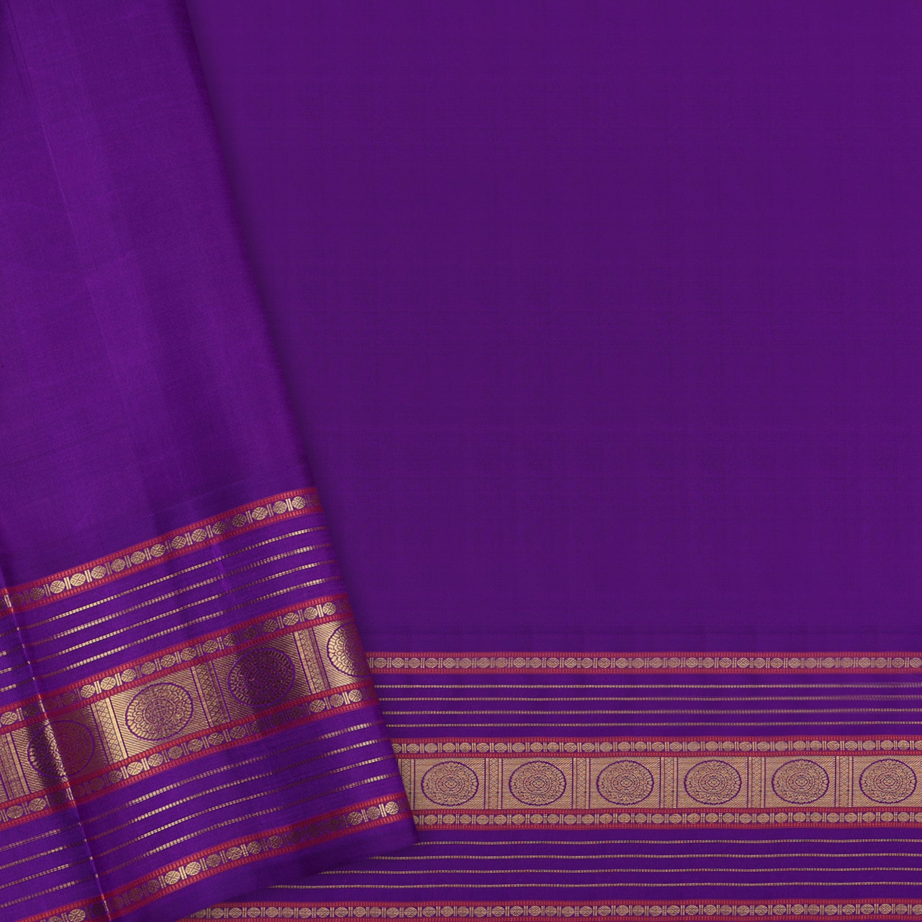 The body is dark purple  Zari Kattam in annam chakram Butta with thambalam thattu pet and green selvedge and dense pure Zari Palla and blouse