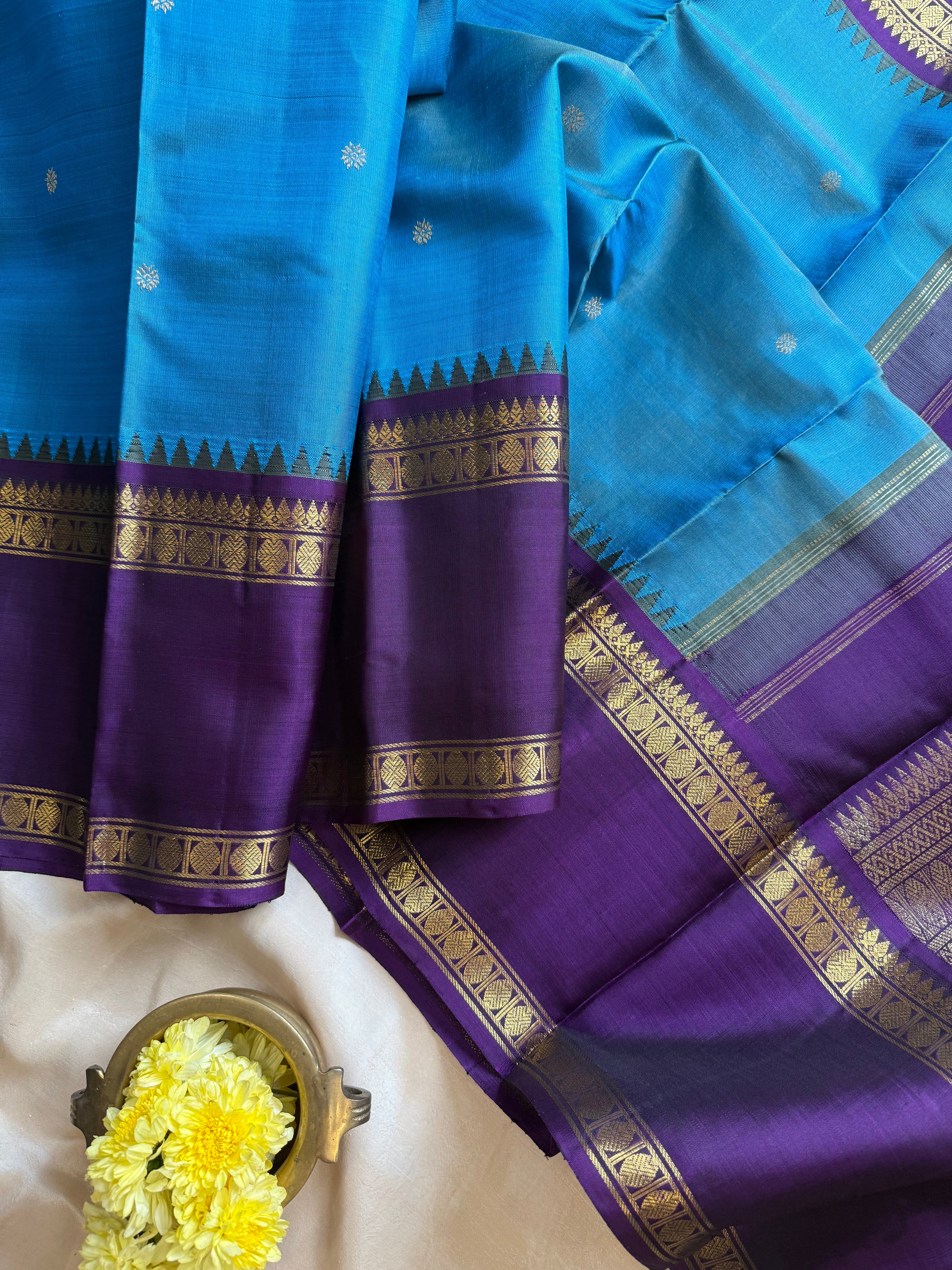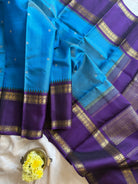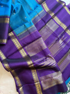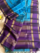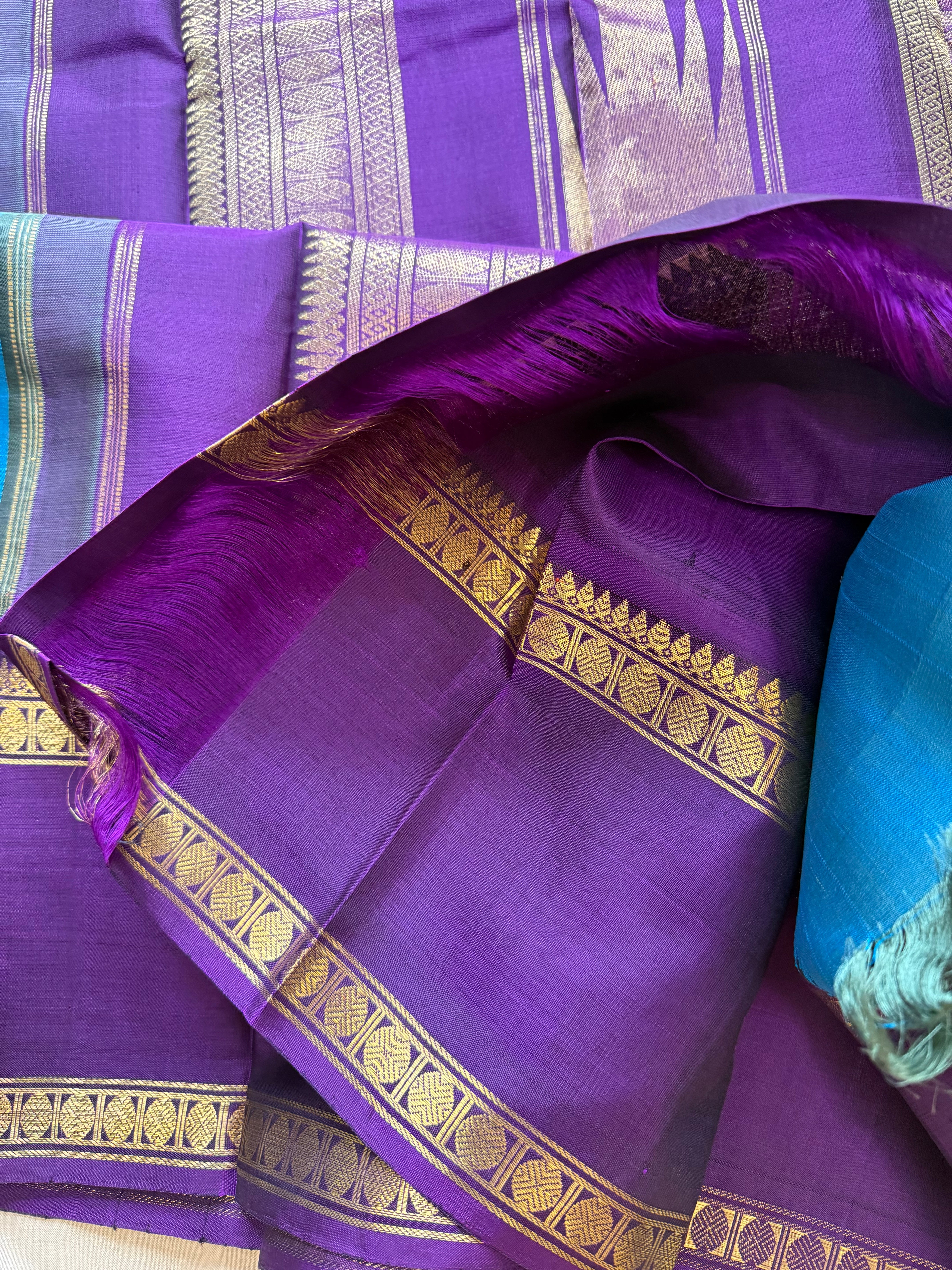 The saree is a unusual shot of olive green and blue the body has Rama blue body with Kamalam butta and the border is bluish purple Colour with dense pure zari Palla and blouse