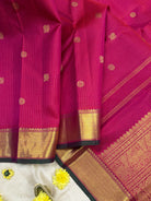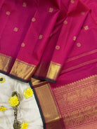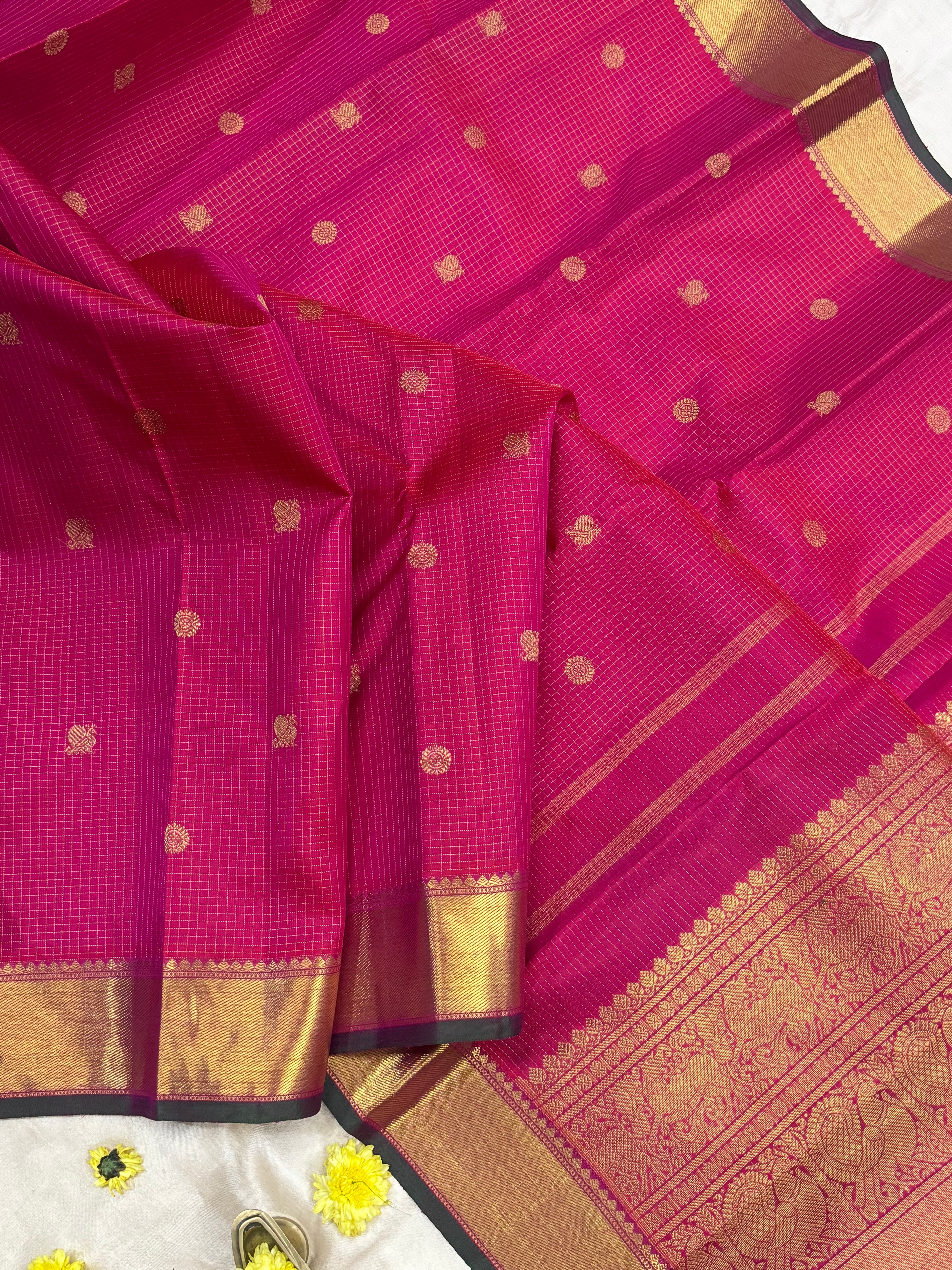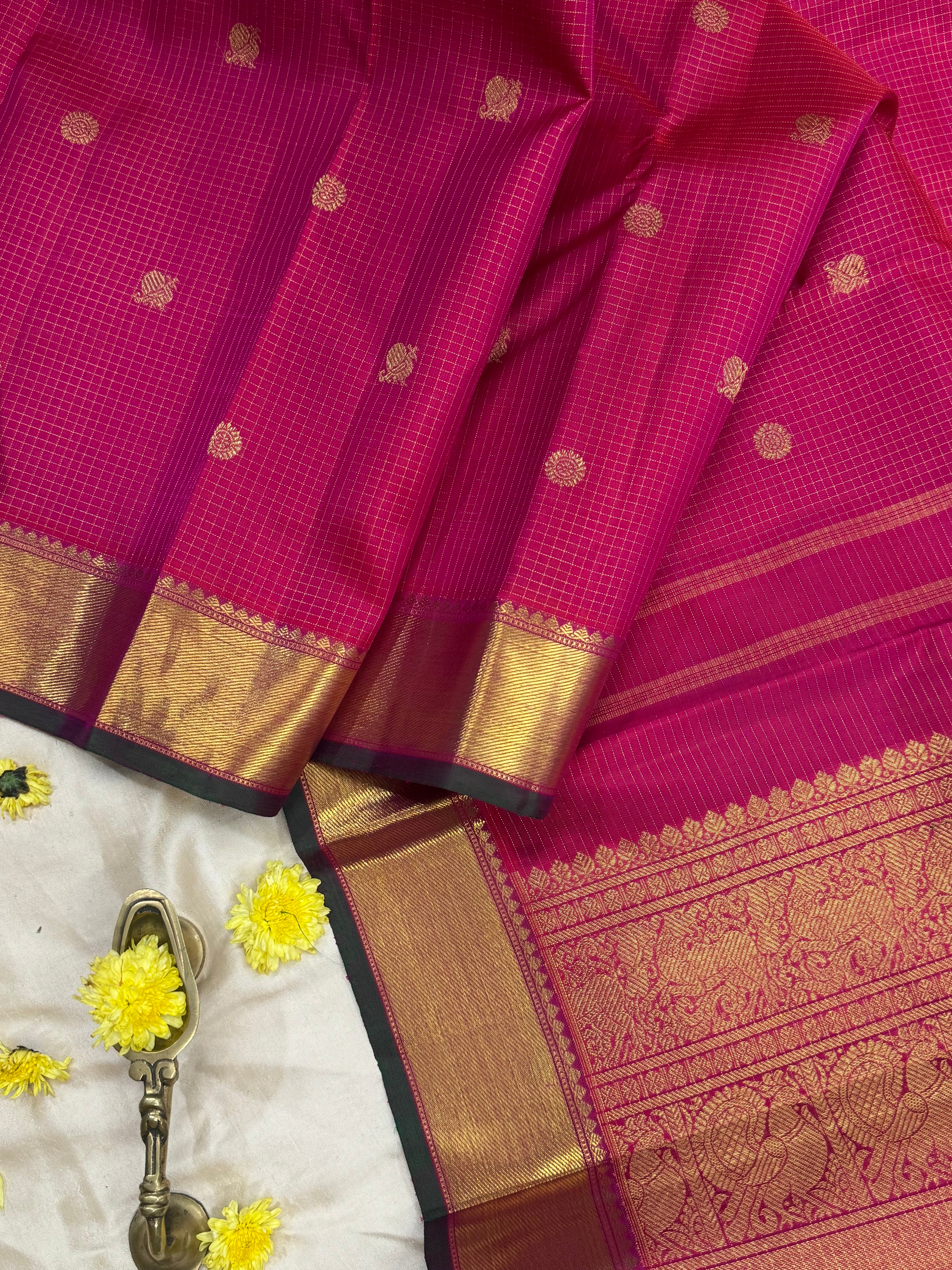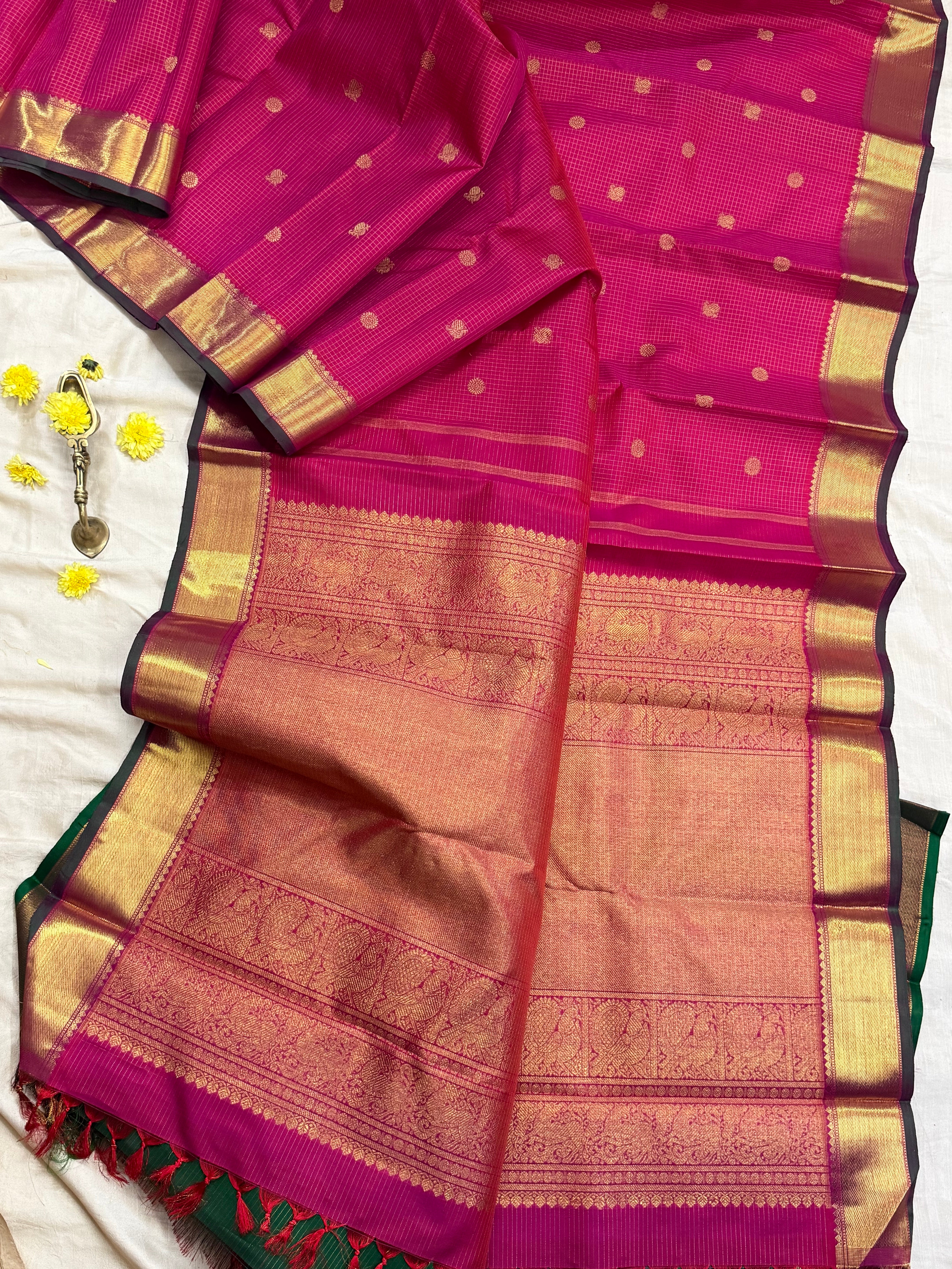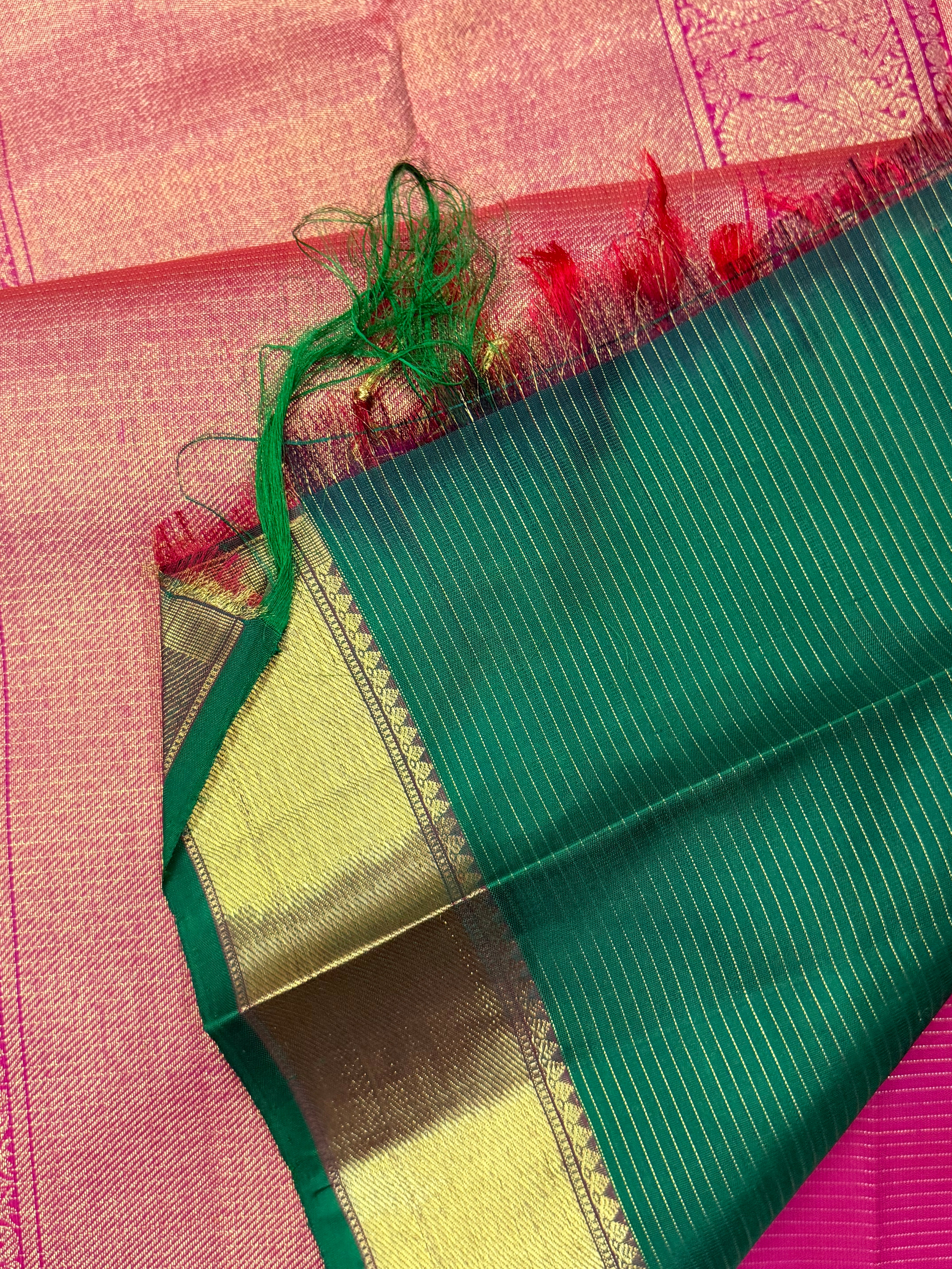 The body is Rani pink with Zari Kattam with annam chakram Butta and the border is Benars pet and dense pure Zari Palla and green blouse