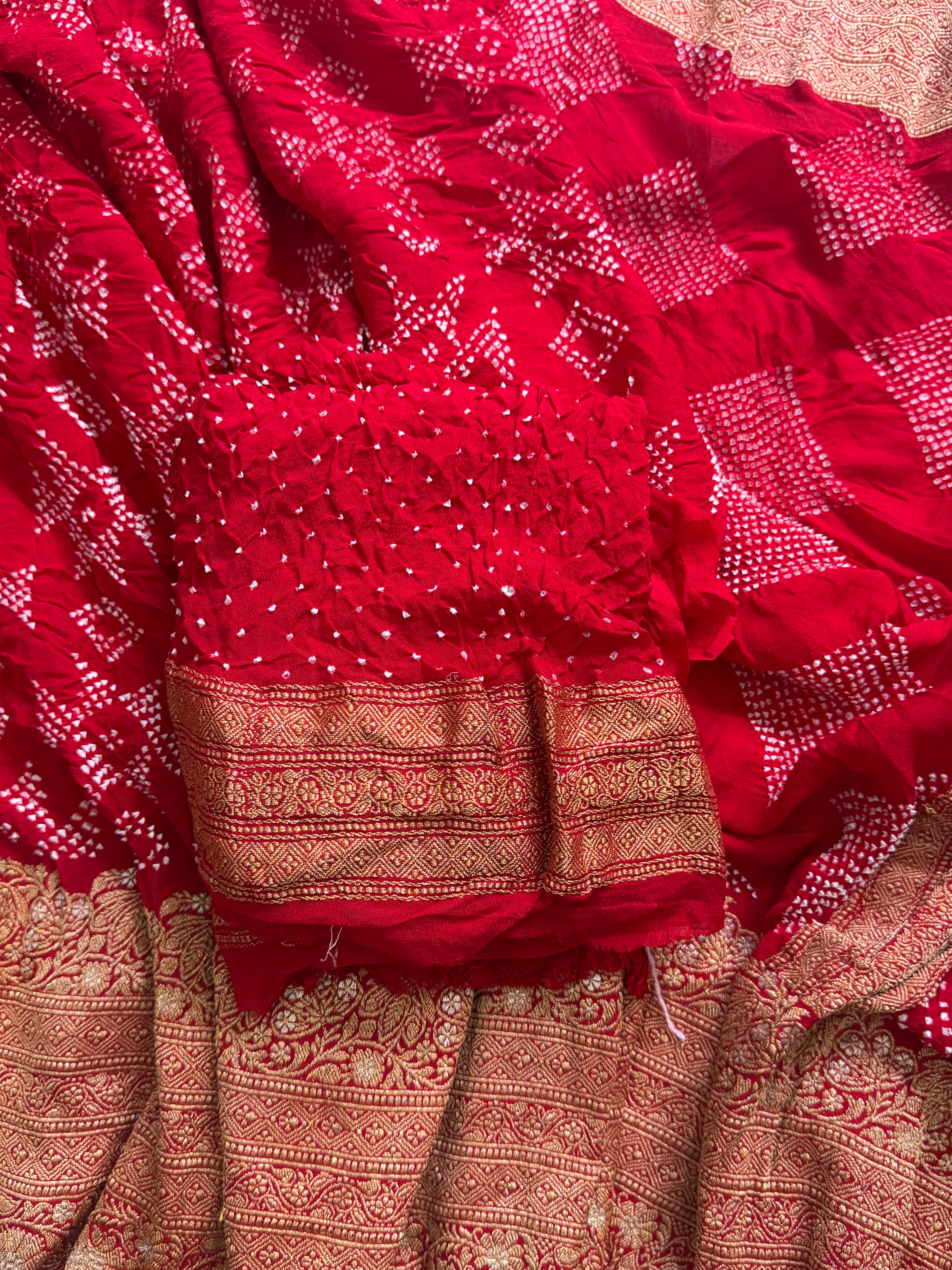 The saree is a pure georgette from benars and the saree is hand knotted in Kutch , fine work Bandhini with border zari work and Palla paisley , blouse attached