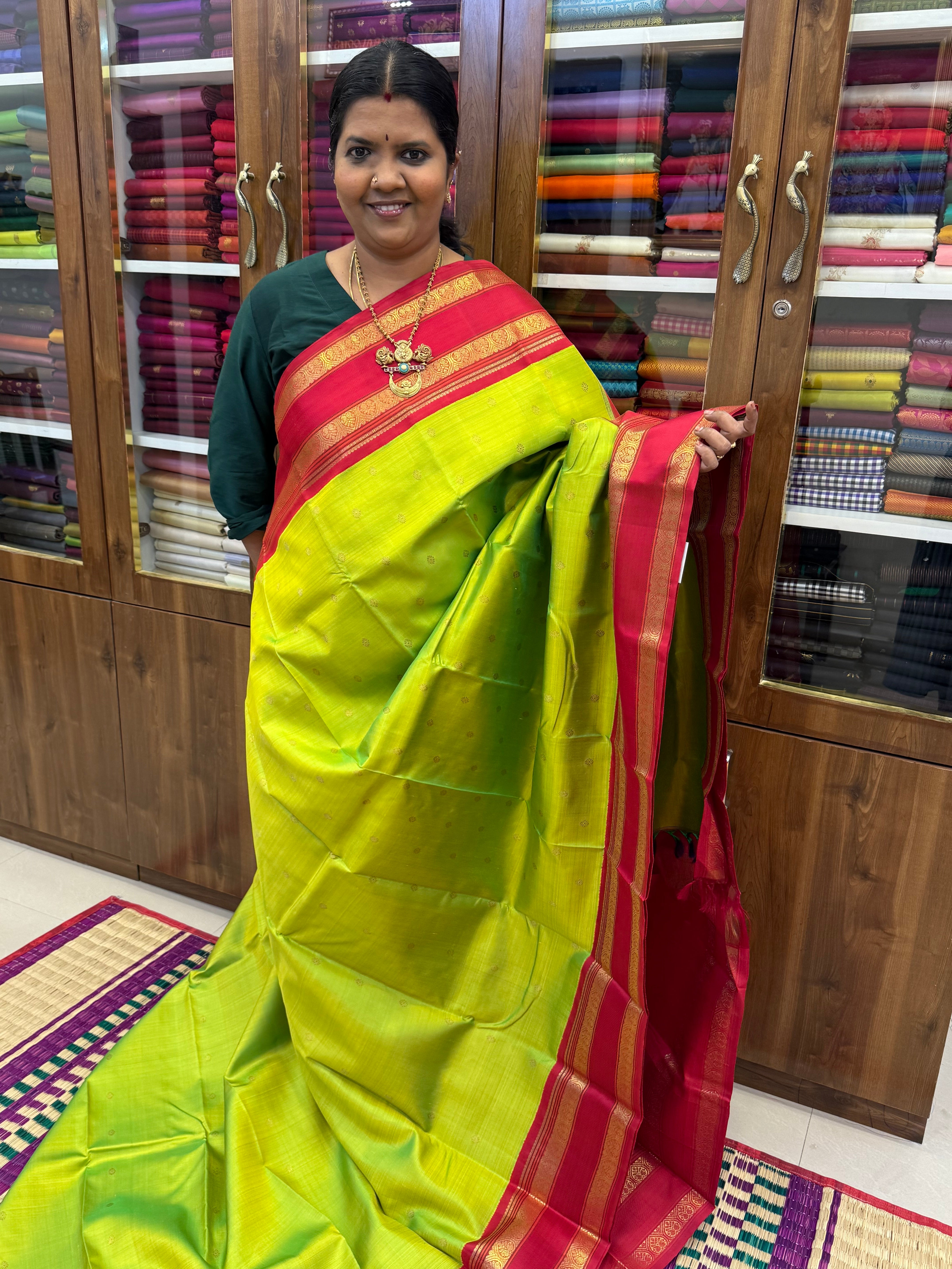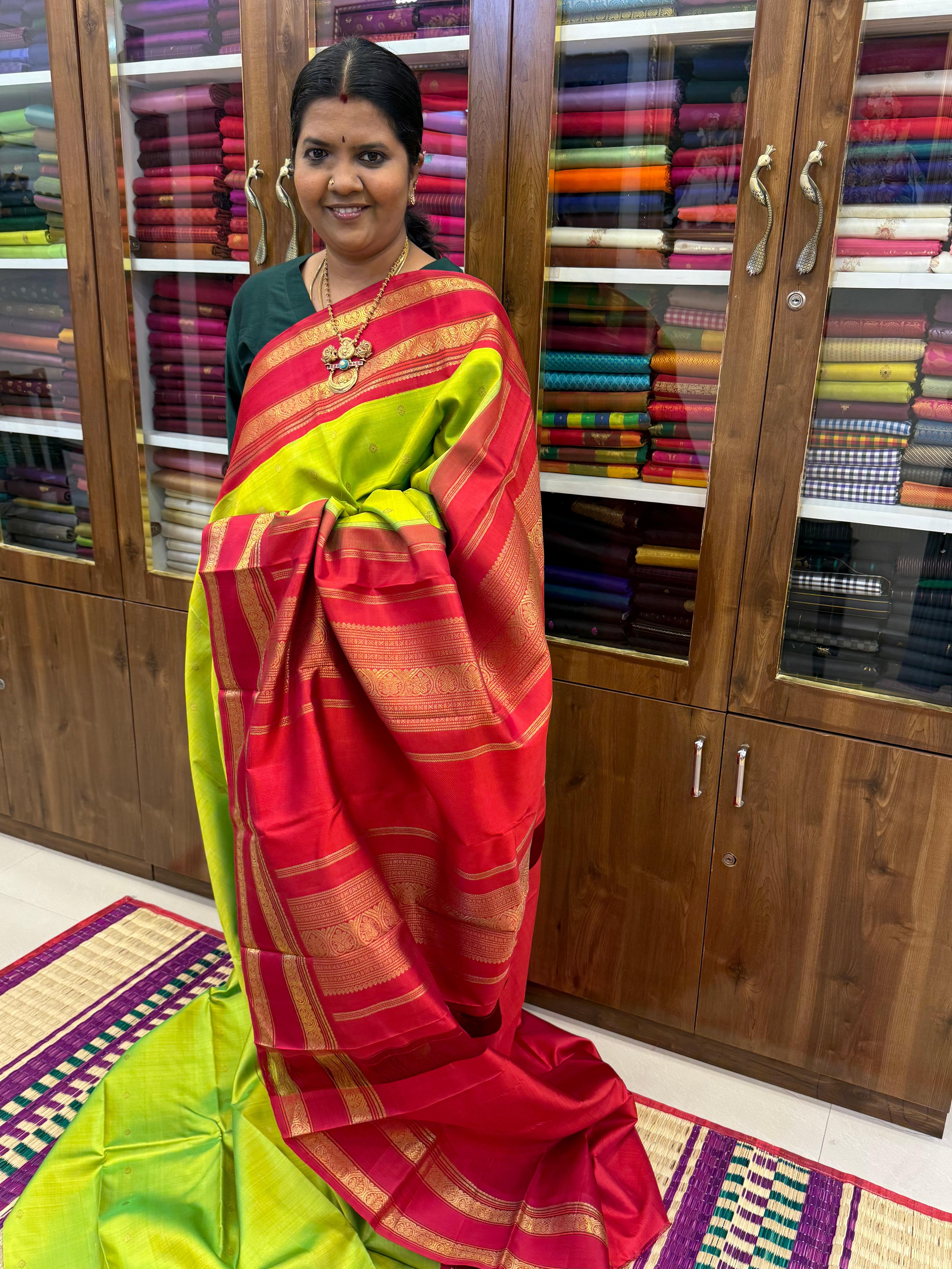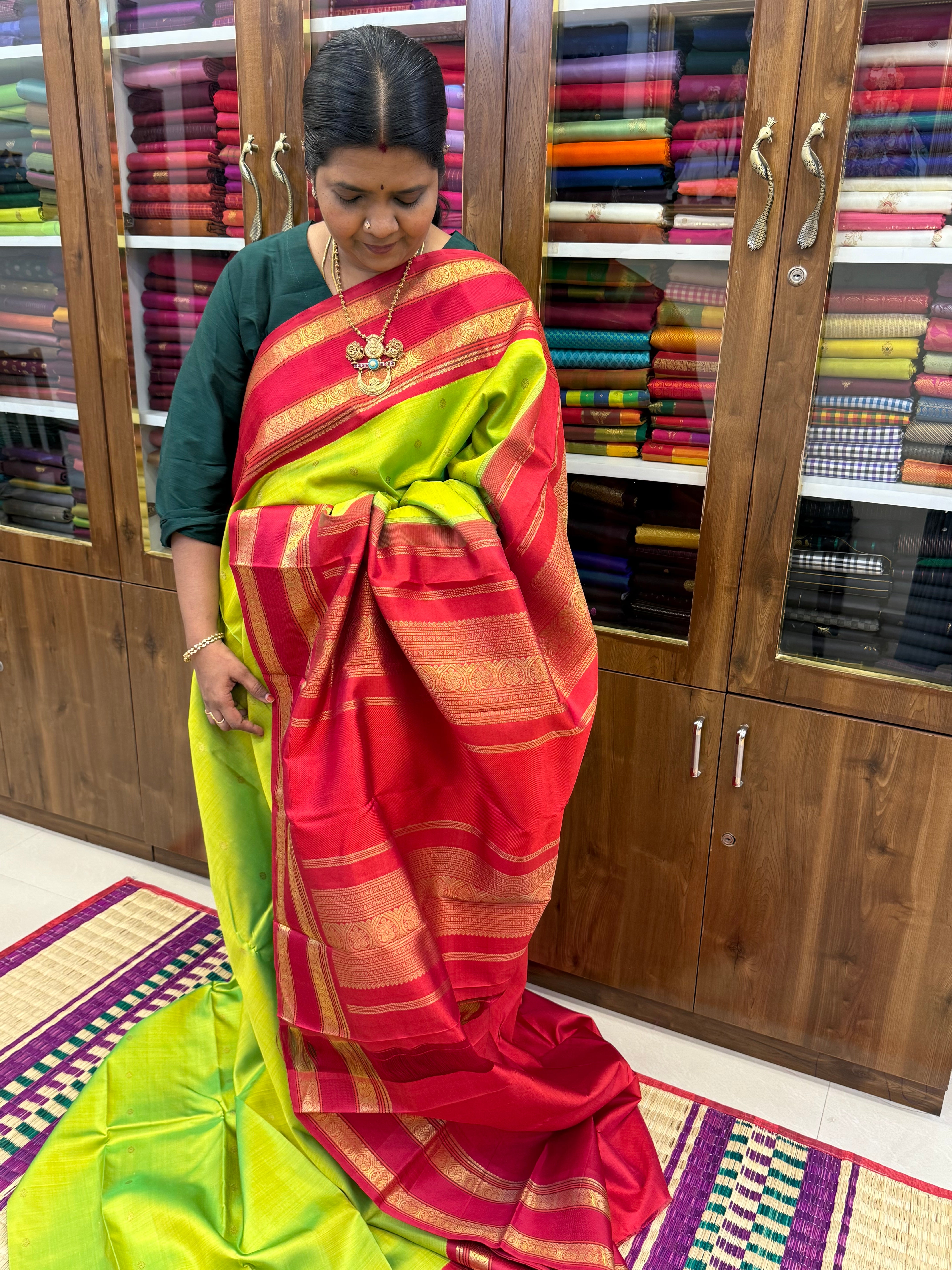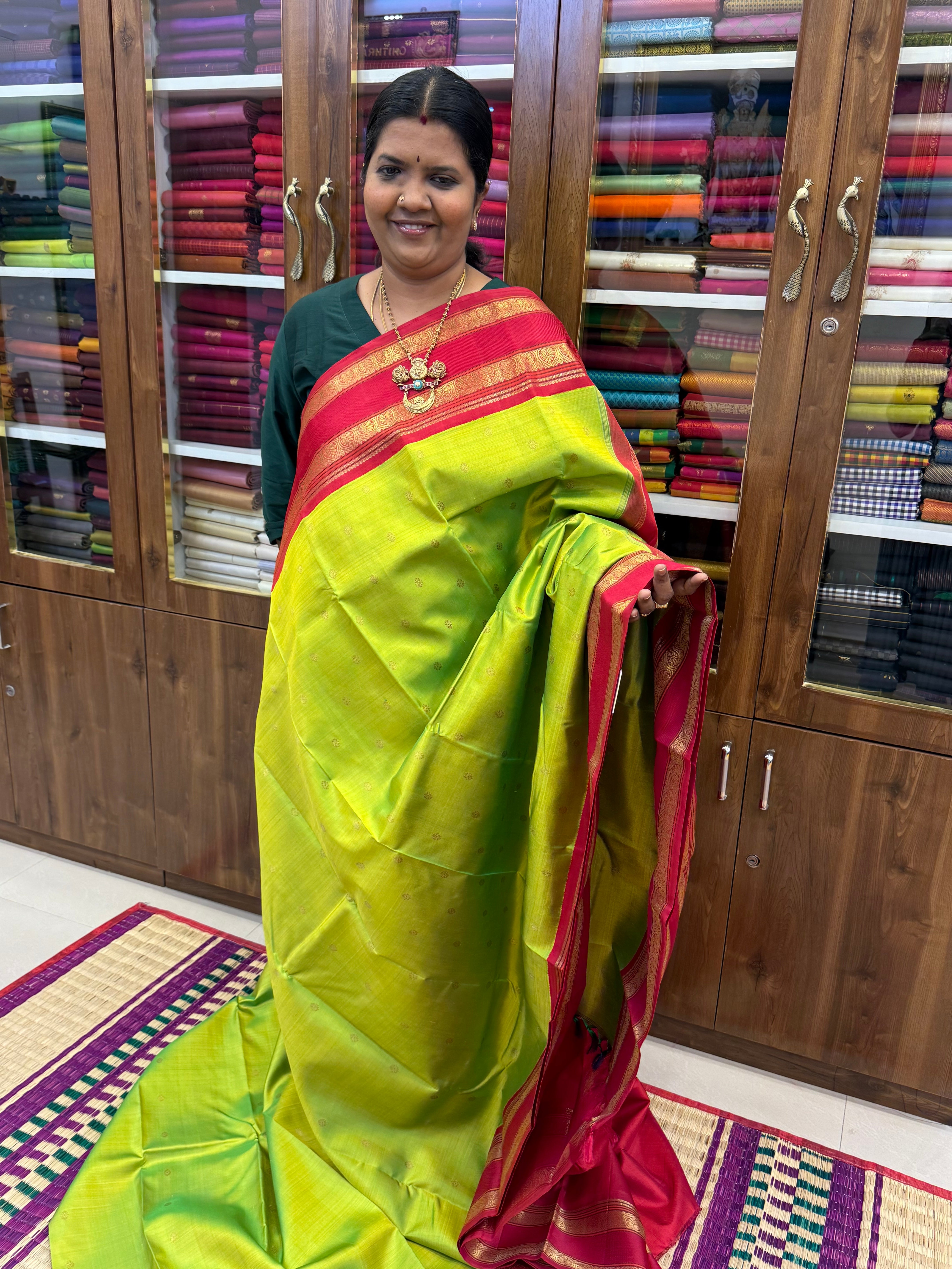 The saree is parrot green with Kamalam Butta and the border is red with retta jadanagam pet and dense Palla and blouse