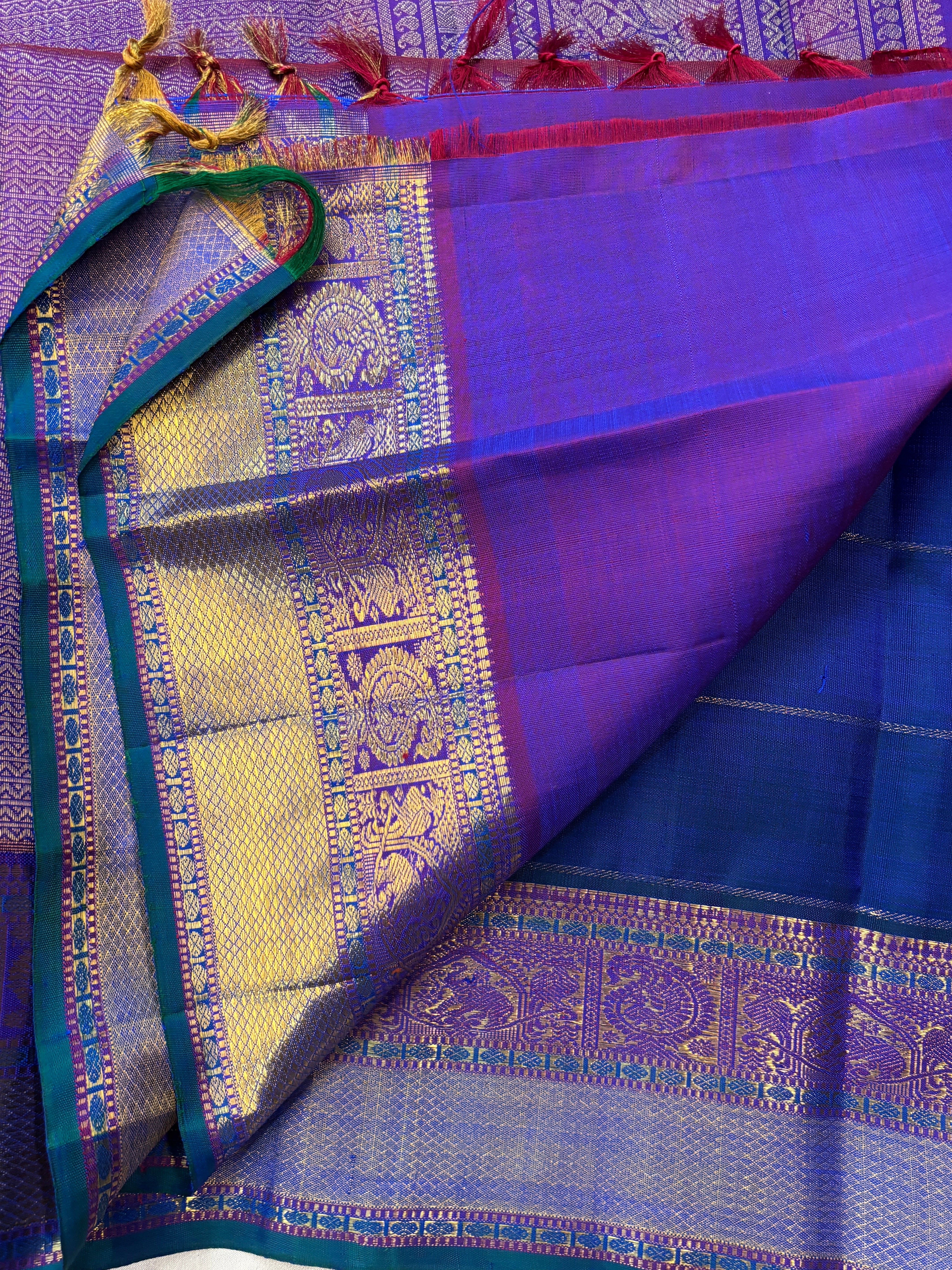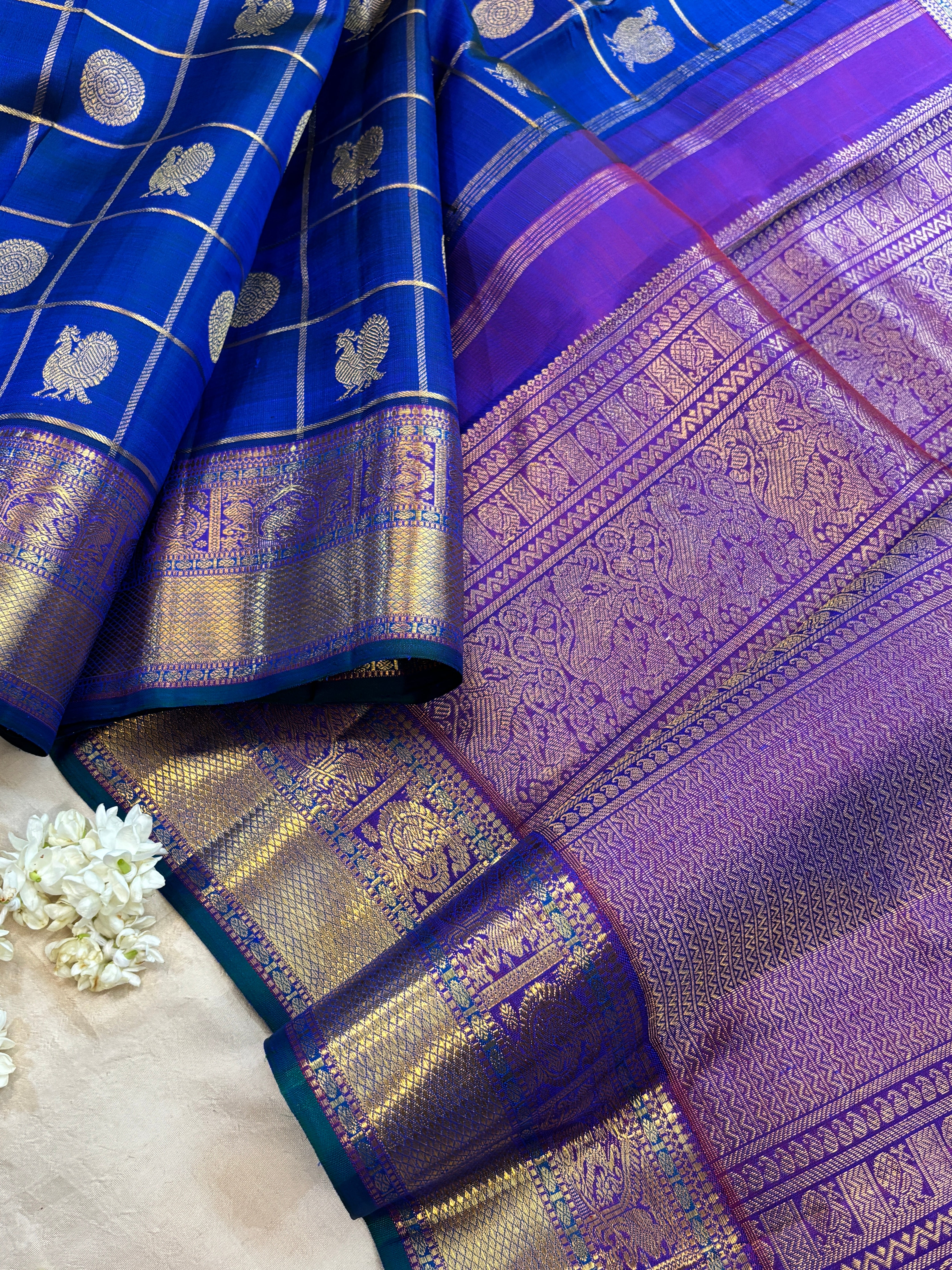 The body is dark royal blue with kattam annam chakram butta and the pet is pink with yaanai and peacock and paisley annam pet with bentwx border and dense pure zari Palla and blouse . 3gms pure zari