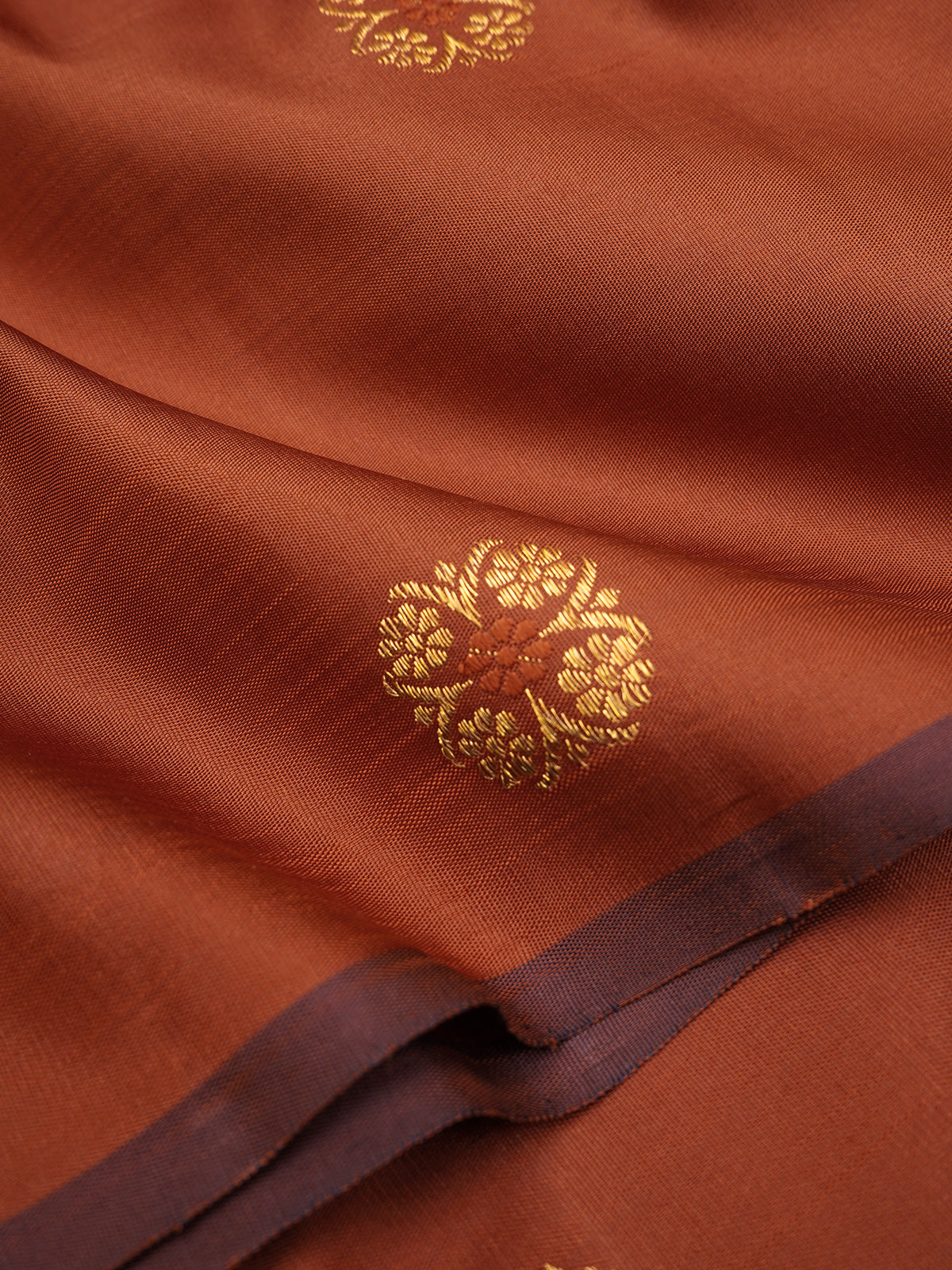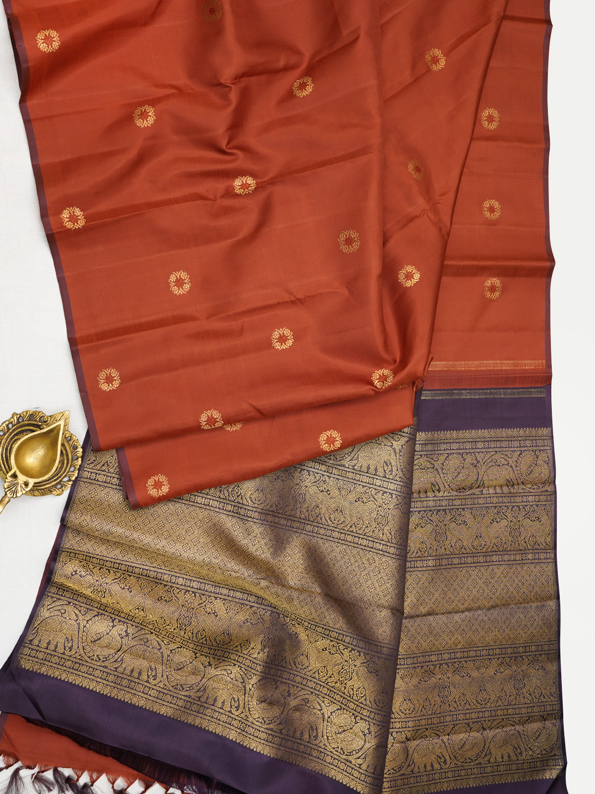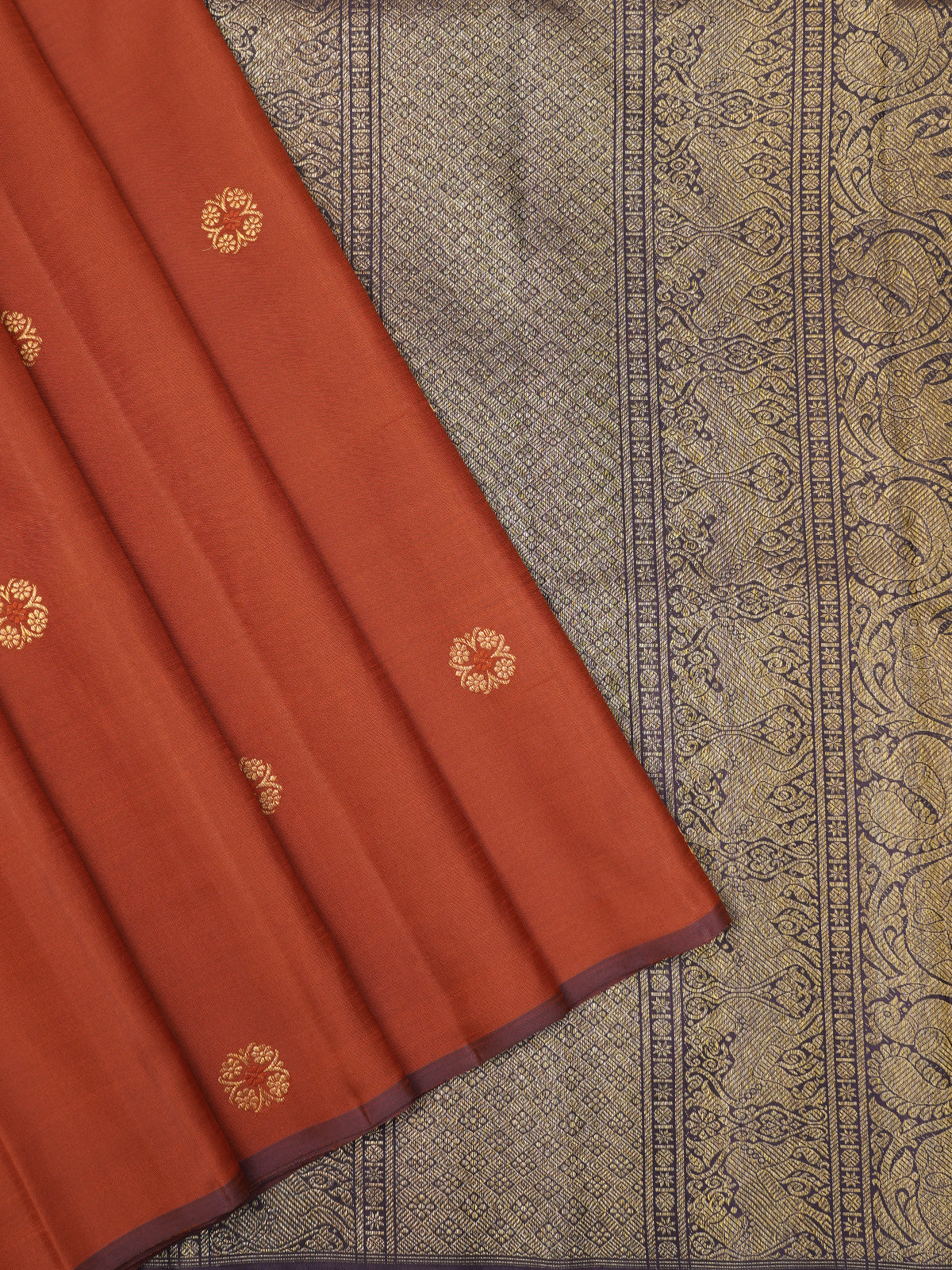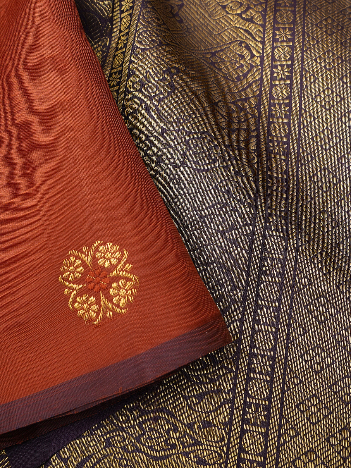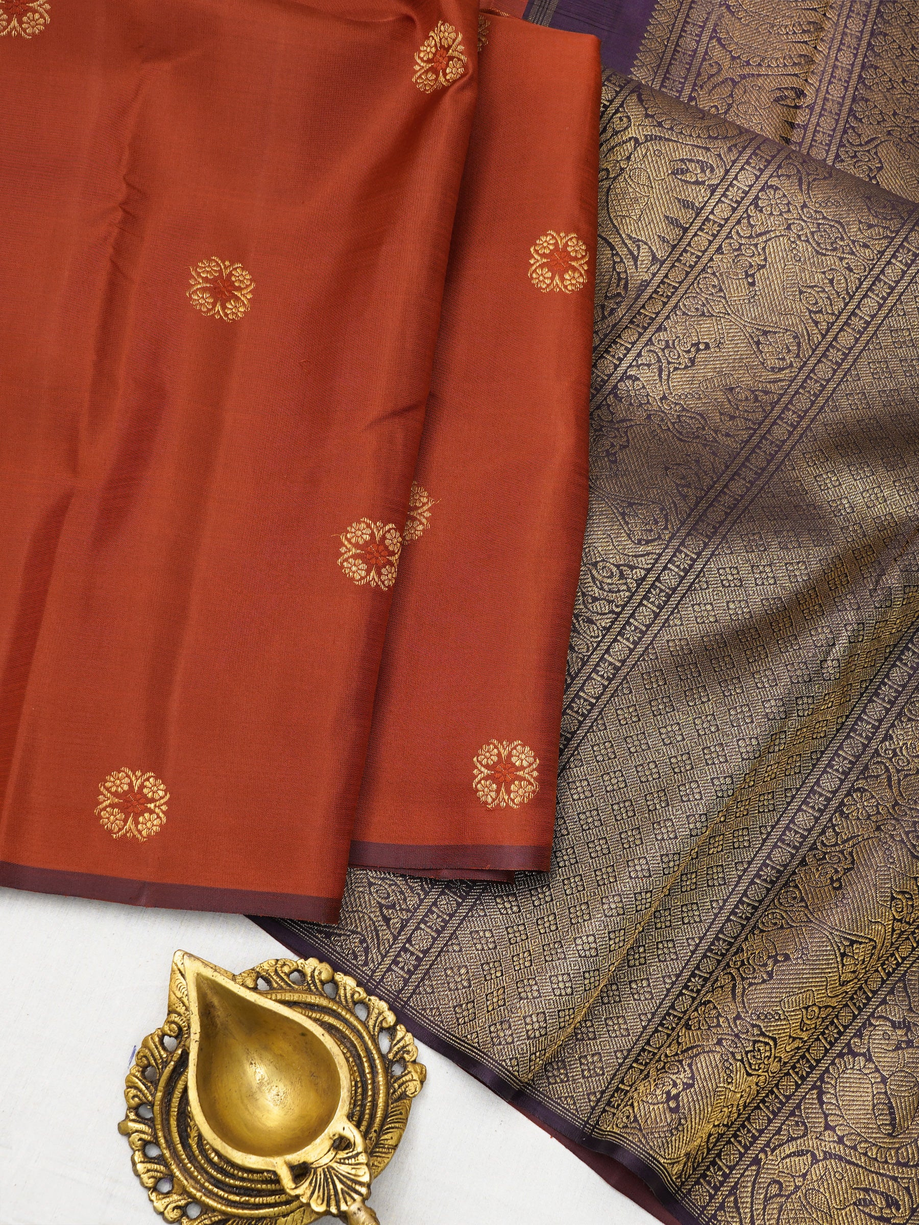 The body is rust color with floral Kamalam Butta and the Palla is dense pure zaro Palla in Kanchana blue color and blouse