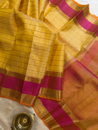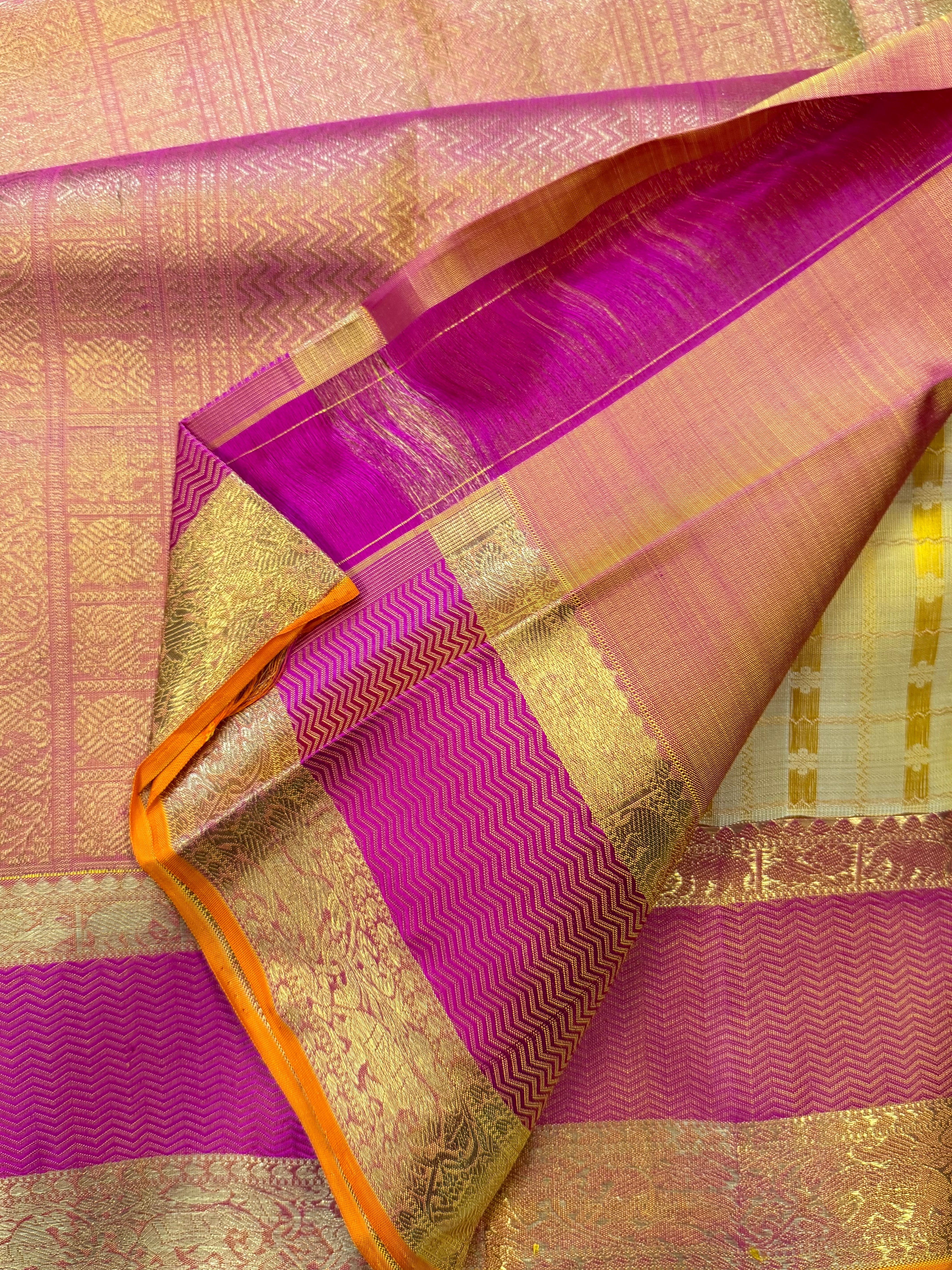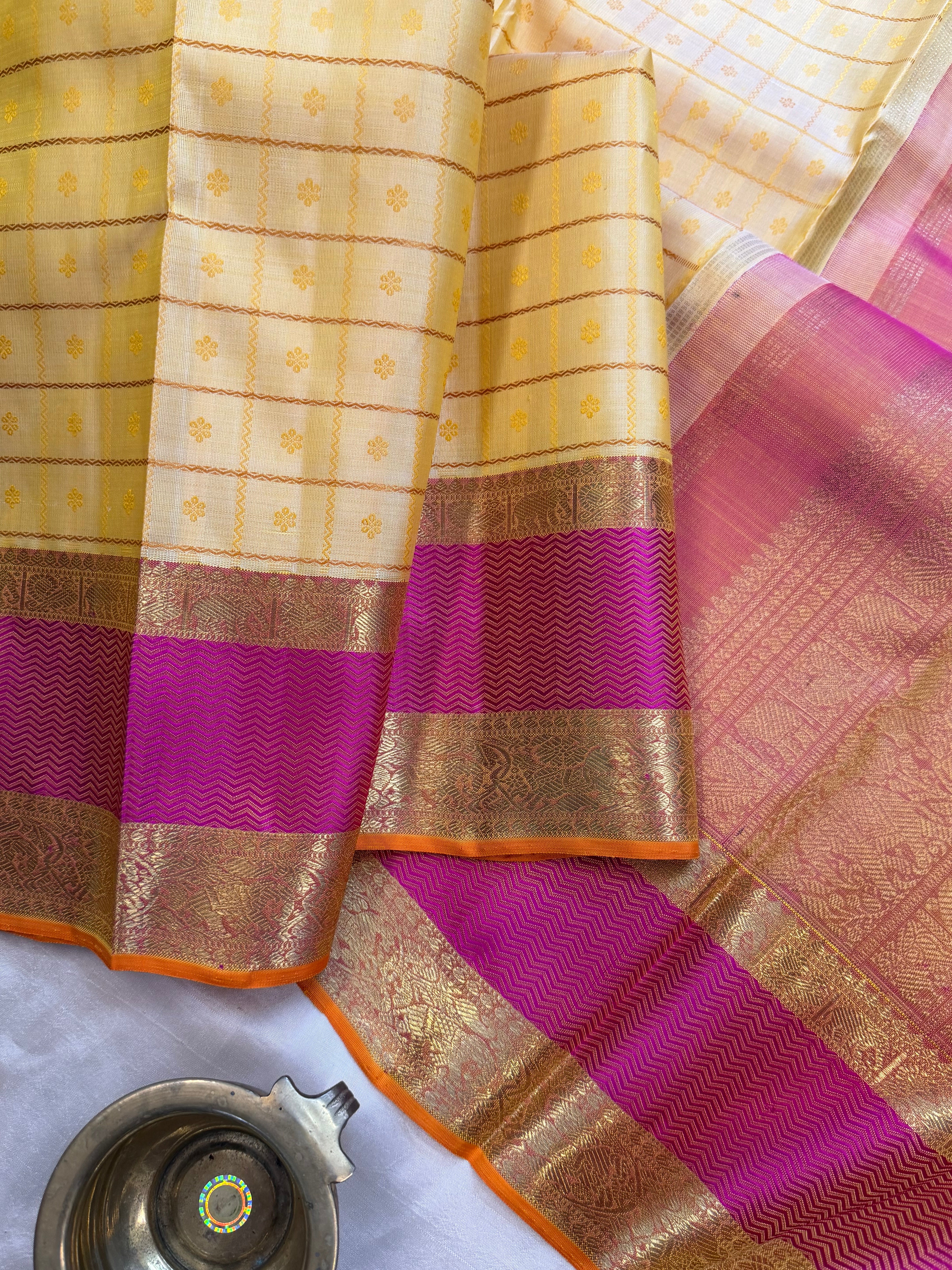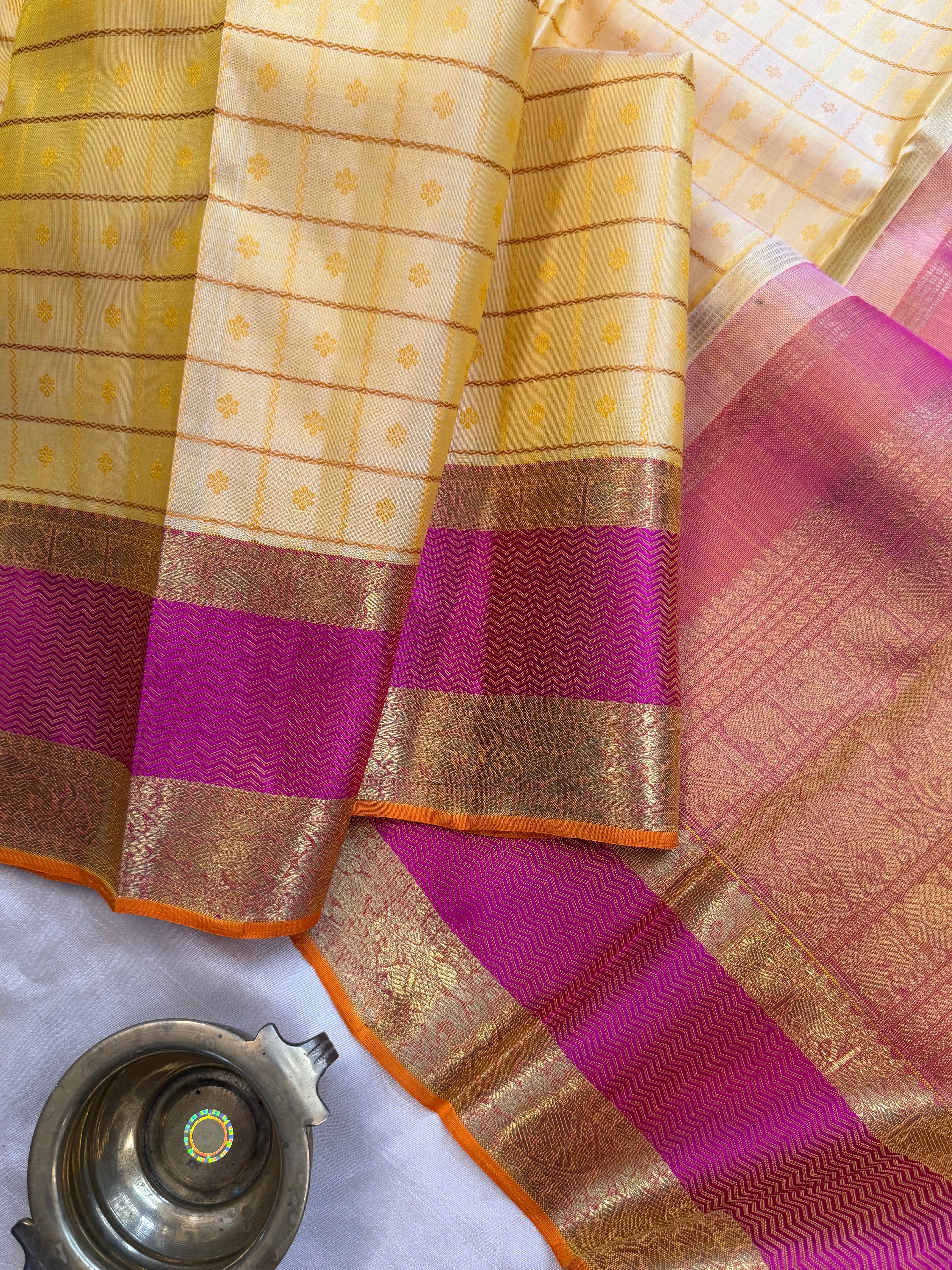 The body is sandana Manjal colour with retta pet zari border and body has laksham butta and dense pure zari Palla and blouse