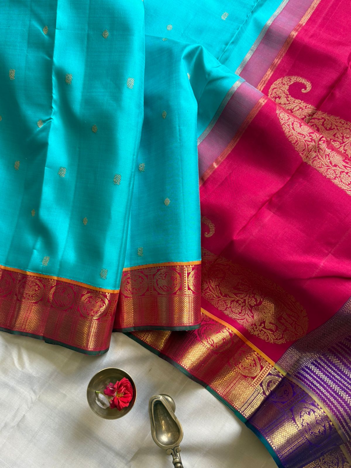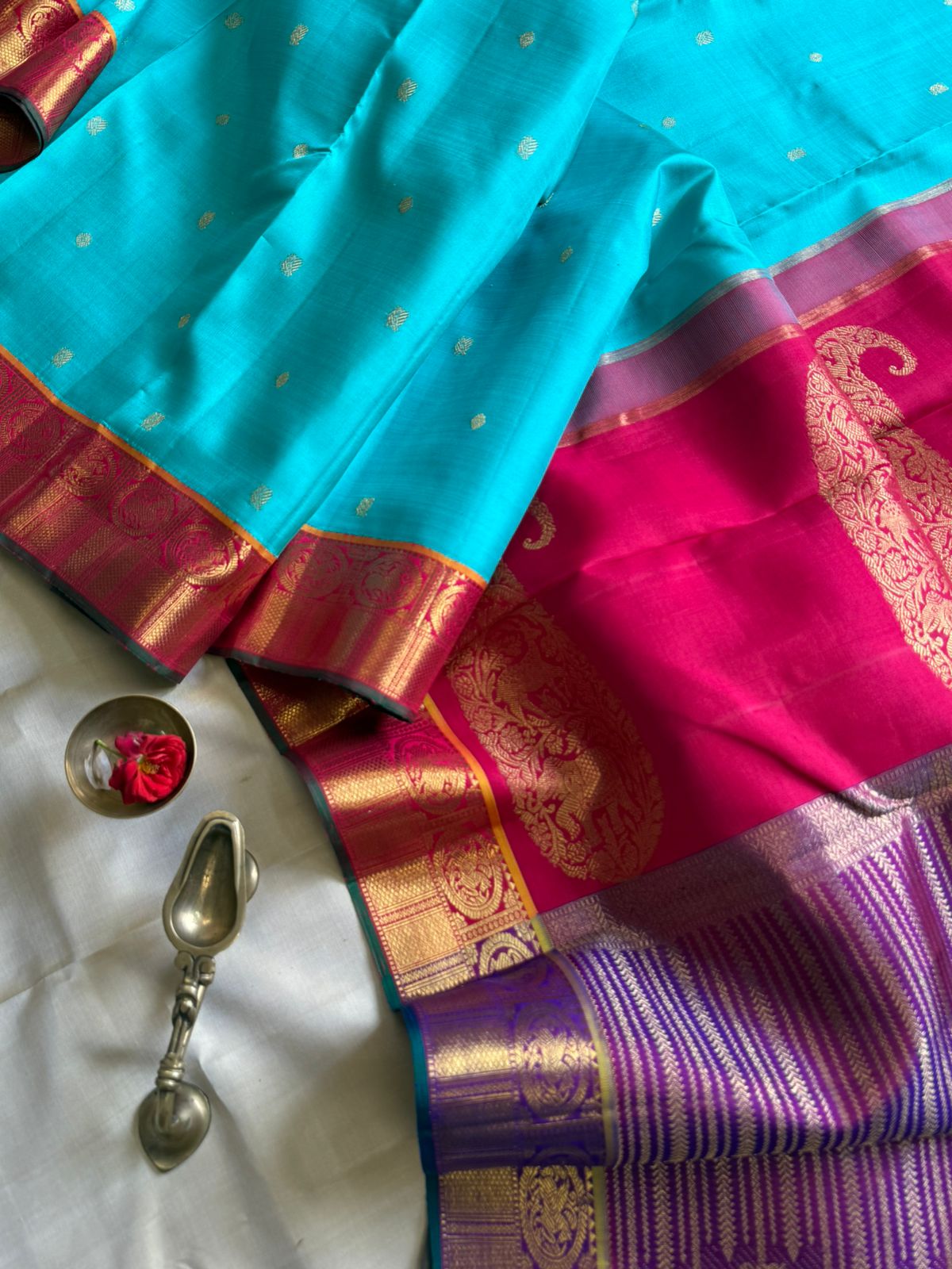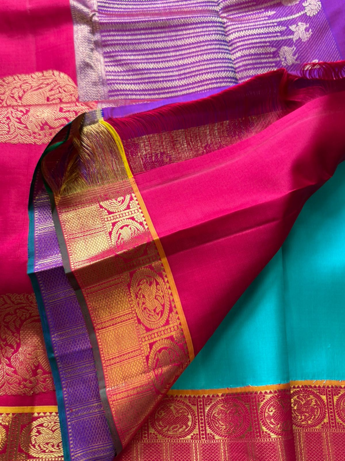 Sea blue and pink and purple double color unique pallu / kanjipuram silk