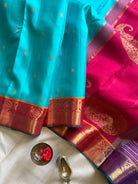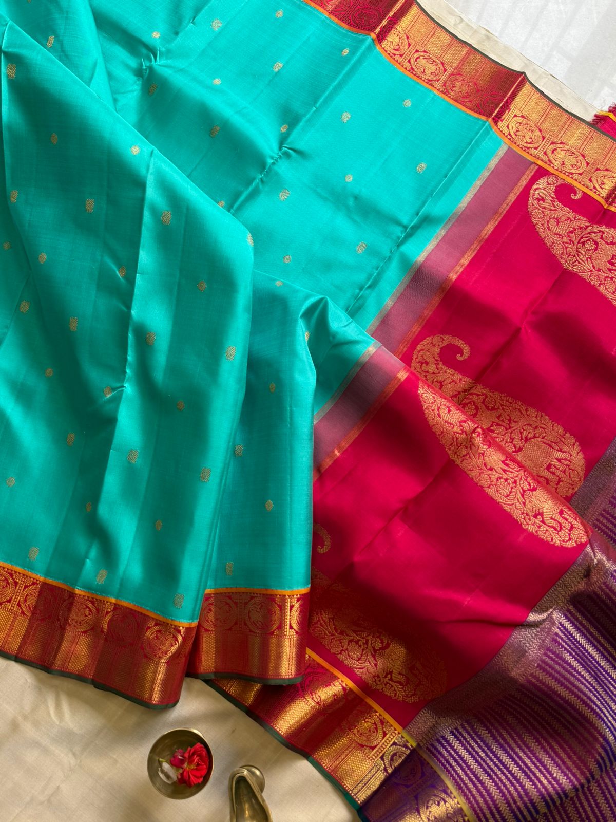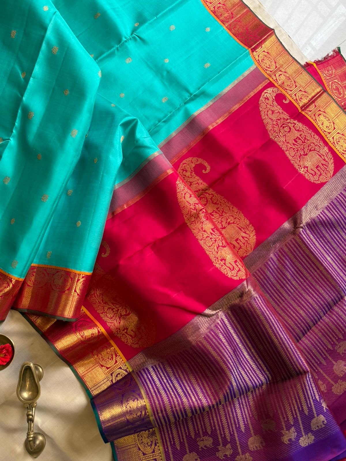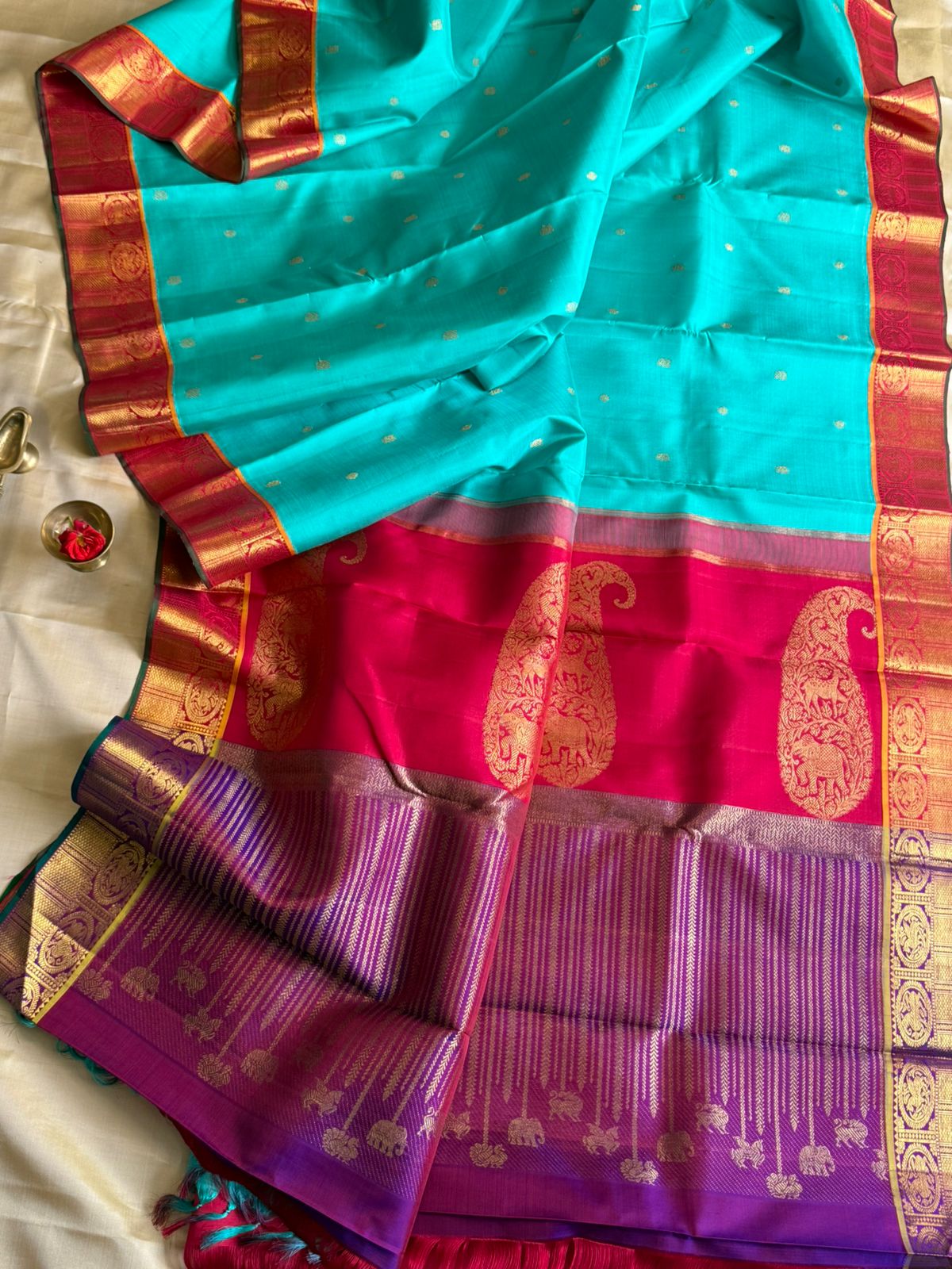 Sea blue and pink and purple double color unique pallu / kanjipuram silk