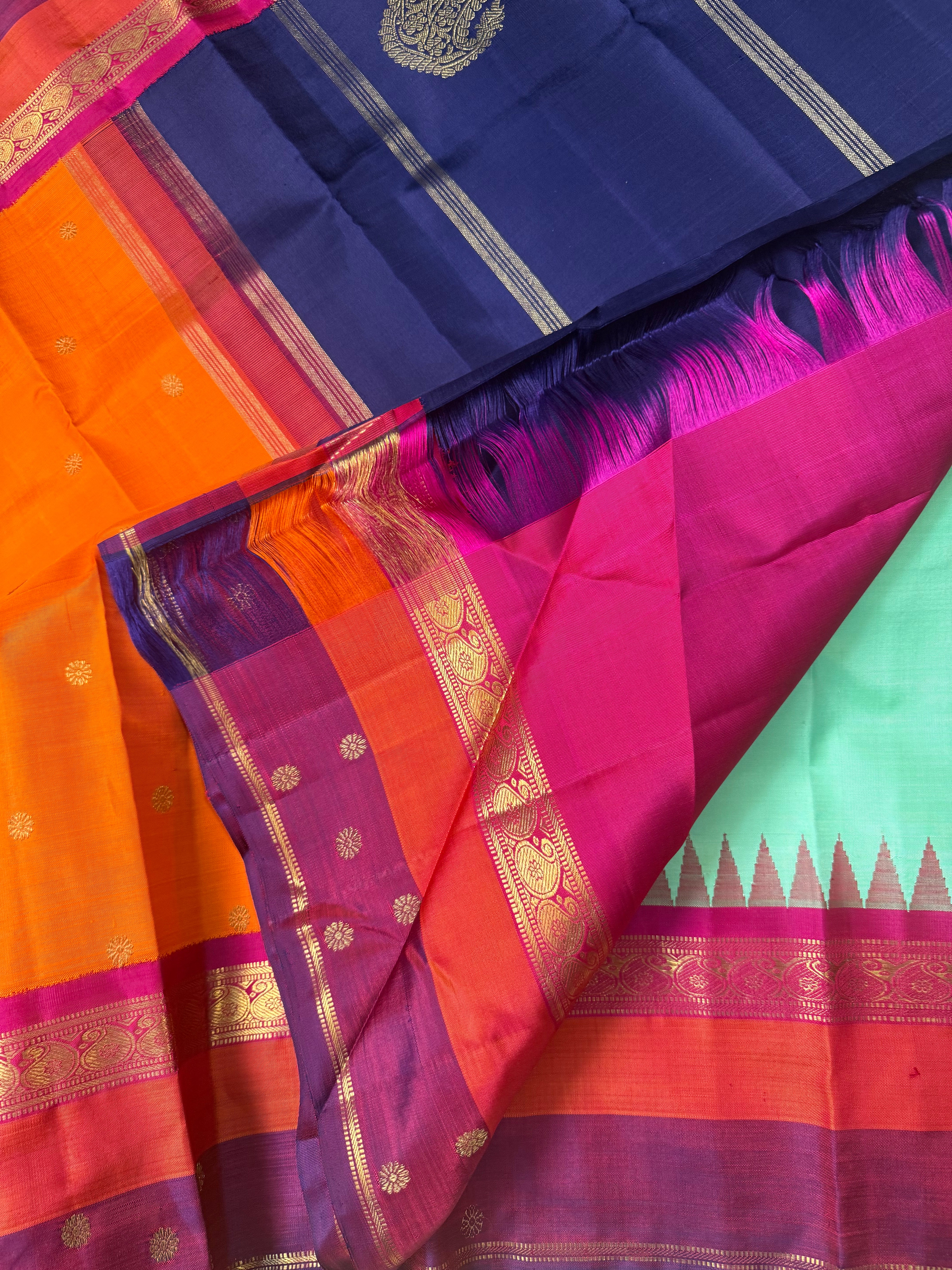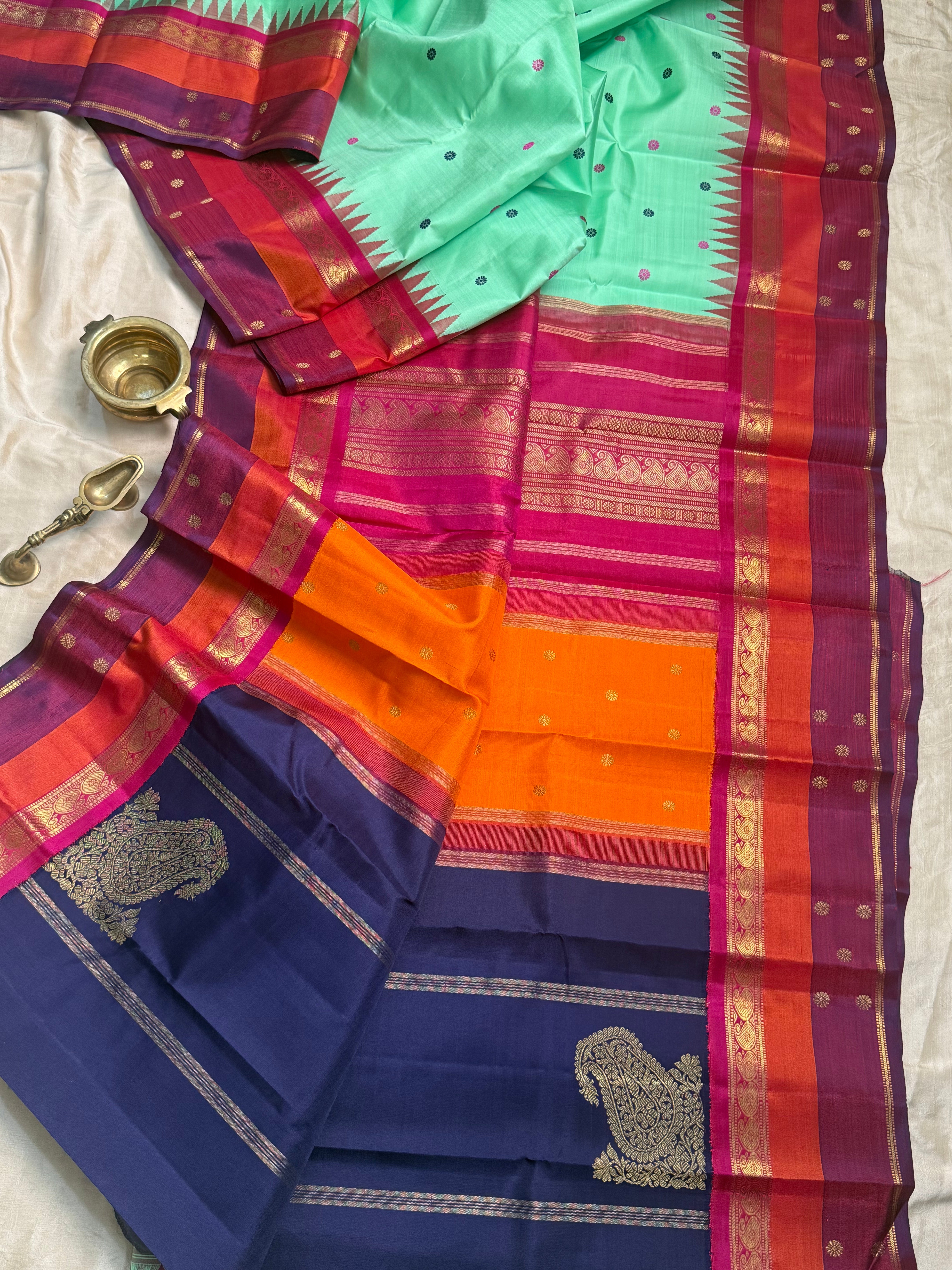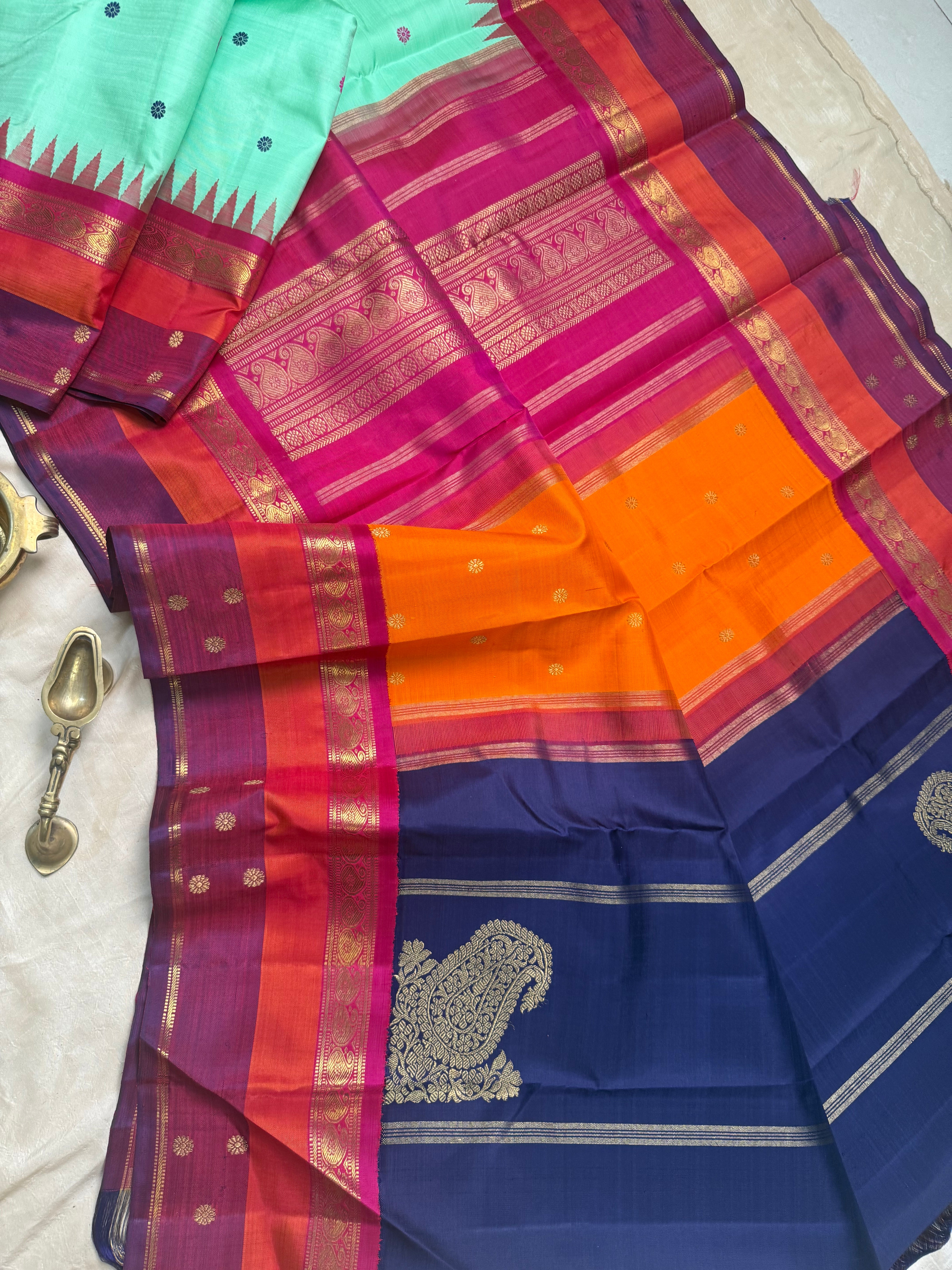 The saree is apple green with multicolour Butta in body and the border is Kai Korvai with tri colour purple , pink and Ornage and the border is Butta , manga pet and the Palla is triple Palla in pink , Ornage and blue . The blue has corner pet and Ornage has Butta and the pink has paisley pet and blouse attached