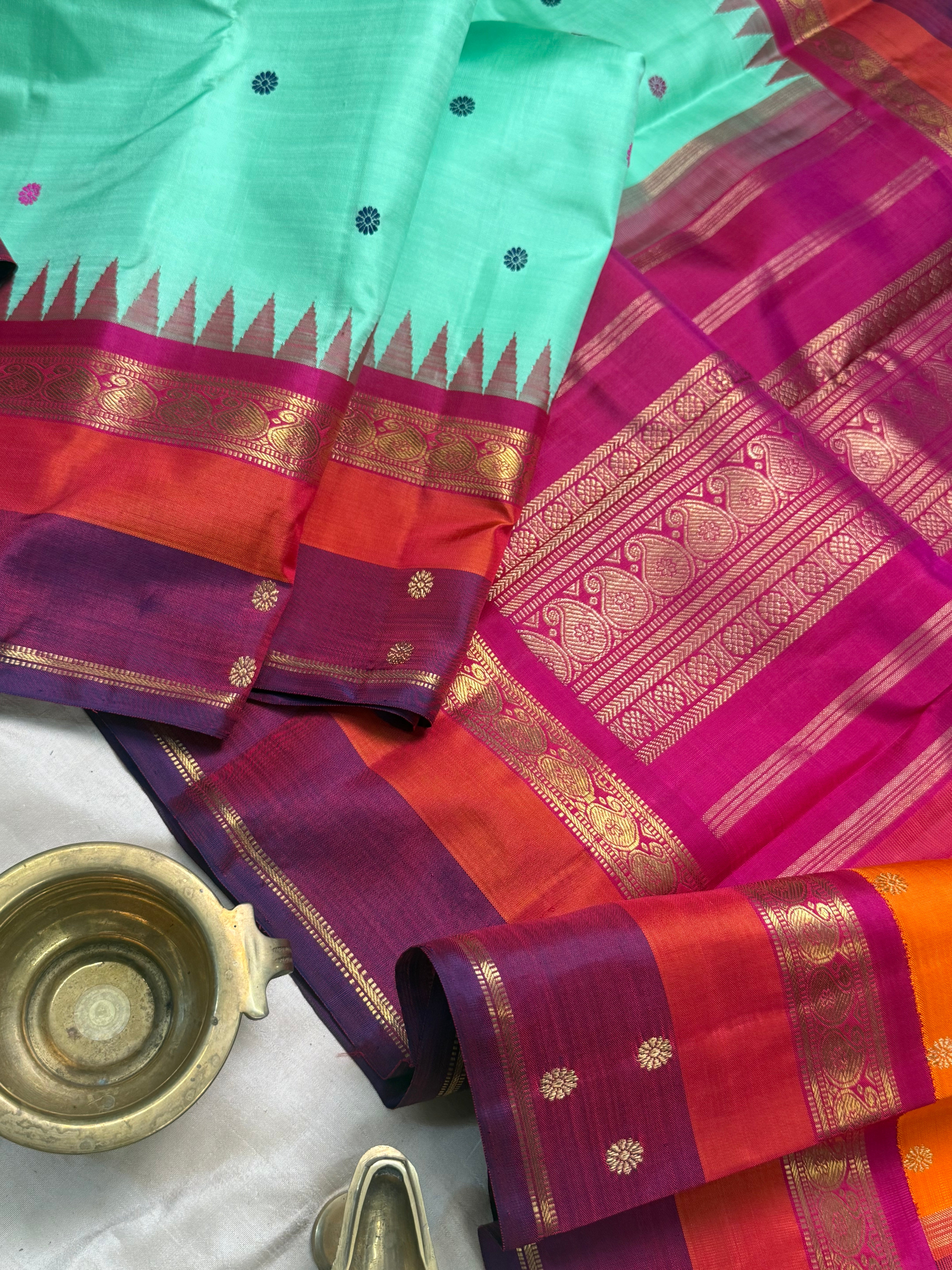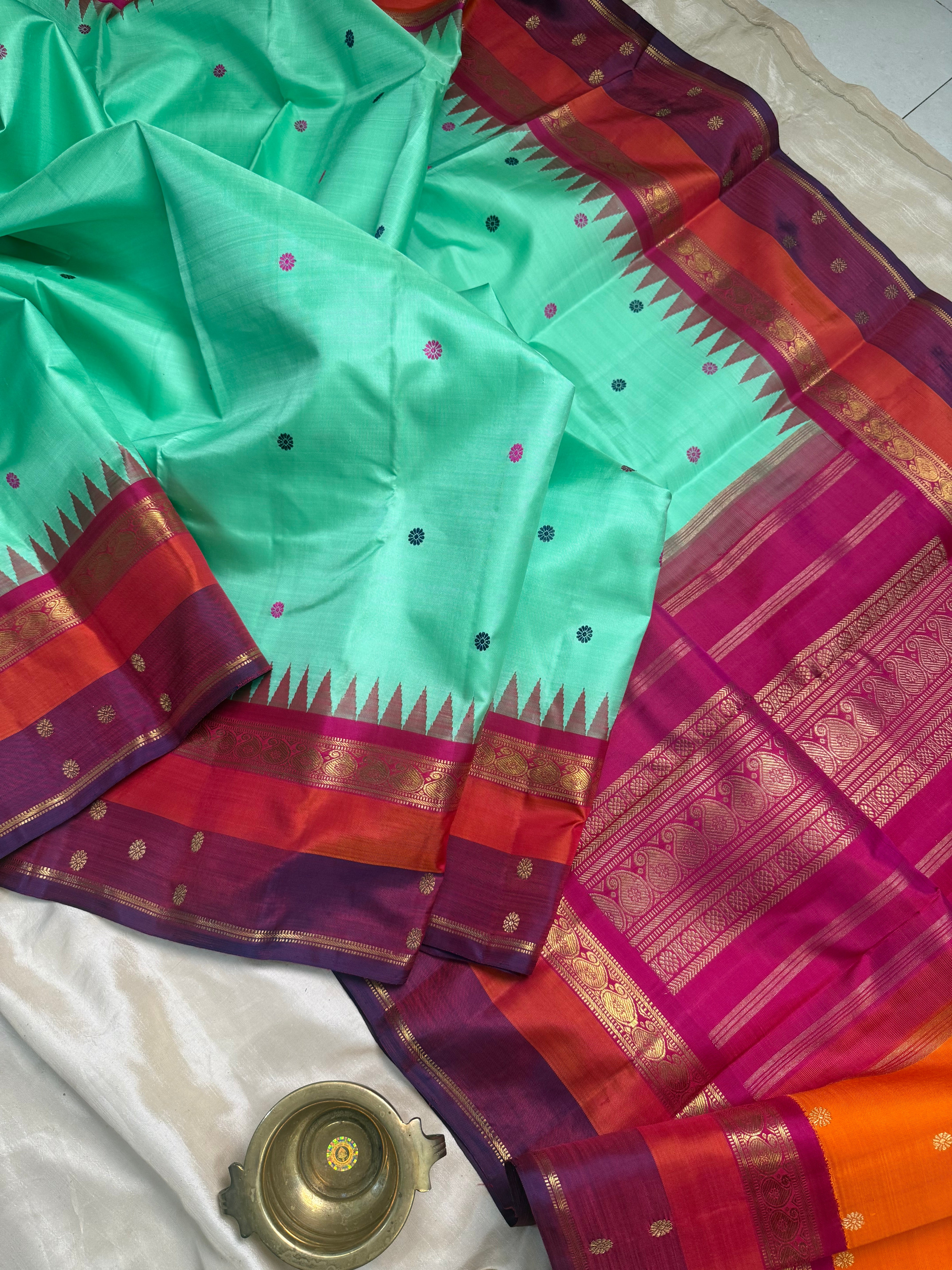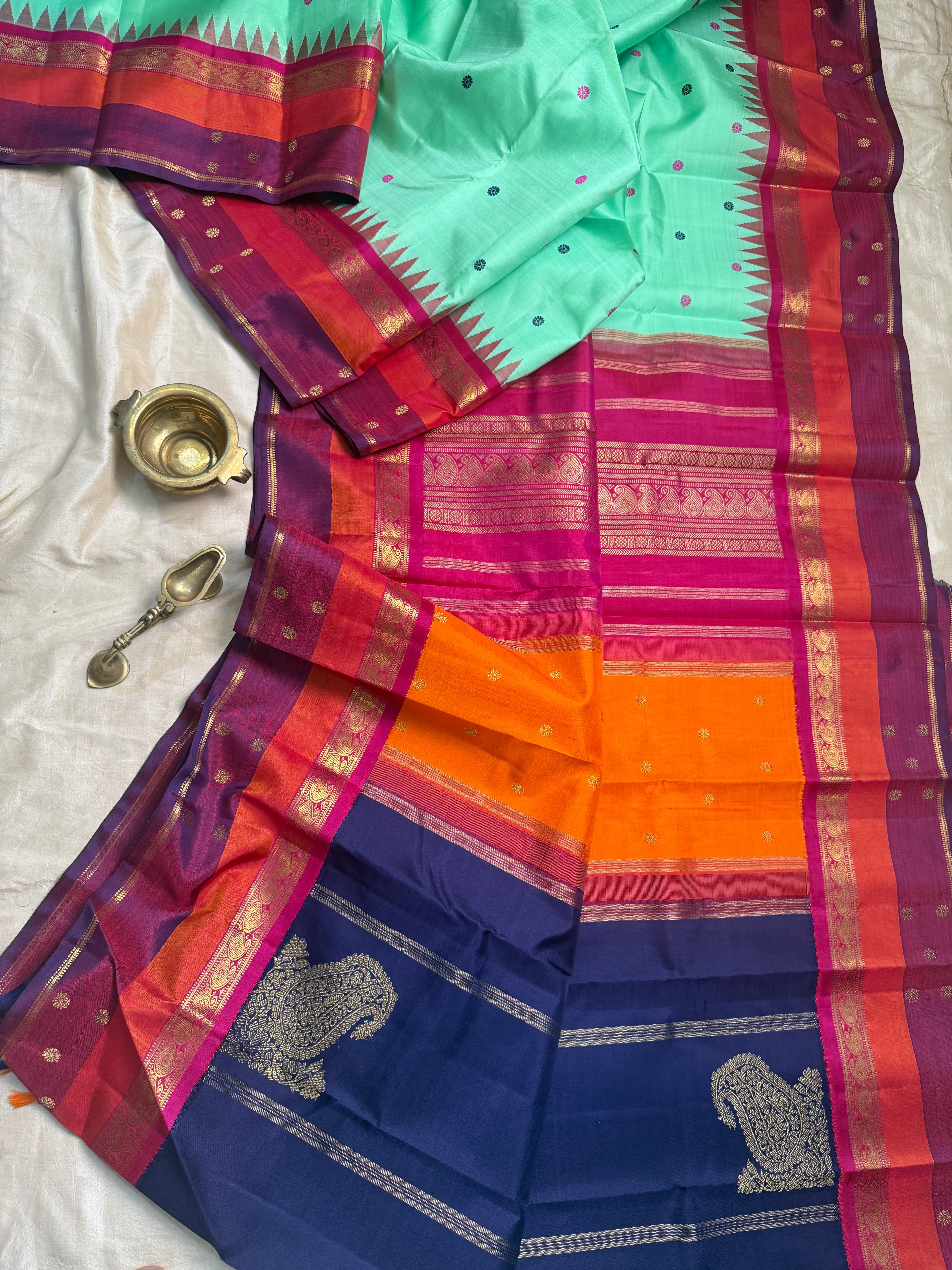 The saree is apple green with multicolour Butta in body and the border is Kai Korvai with tri colour purple , pink and Ornage and the border is Butta , manga pet and the Palla is triple Palla in pink , Ornage and blue . The blue has corner pet and Ornage has Butta and the pink has paisley pet and blouse attached