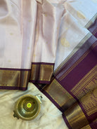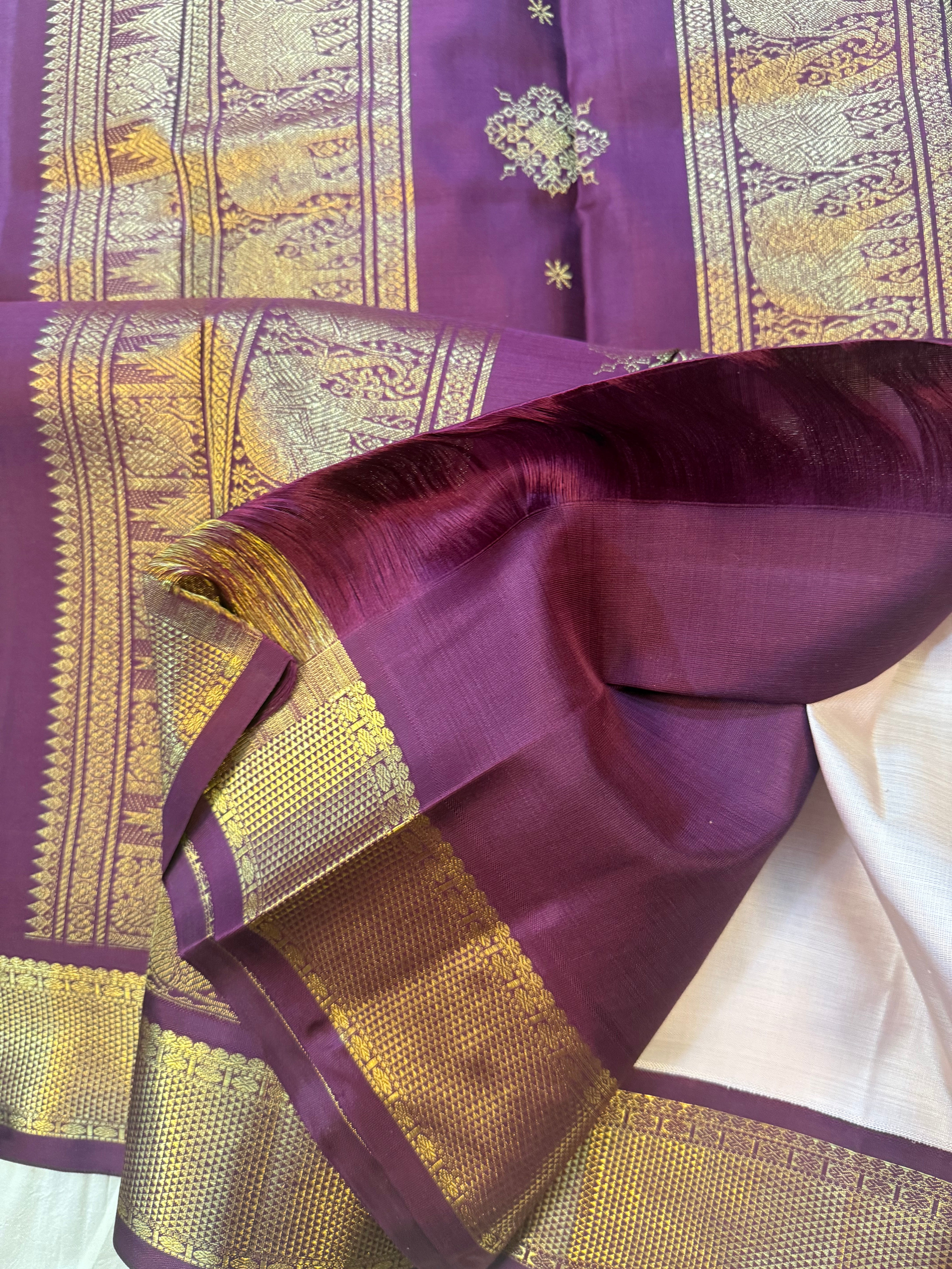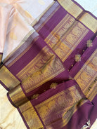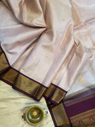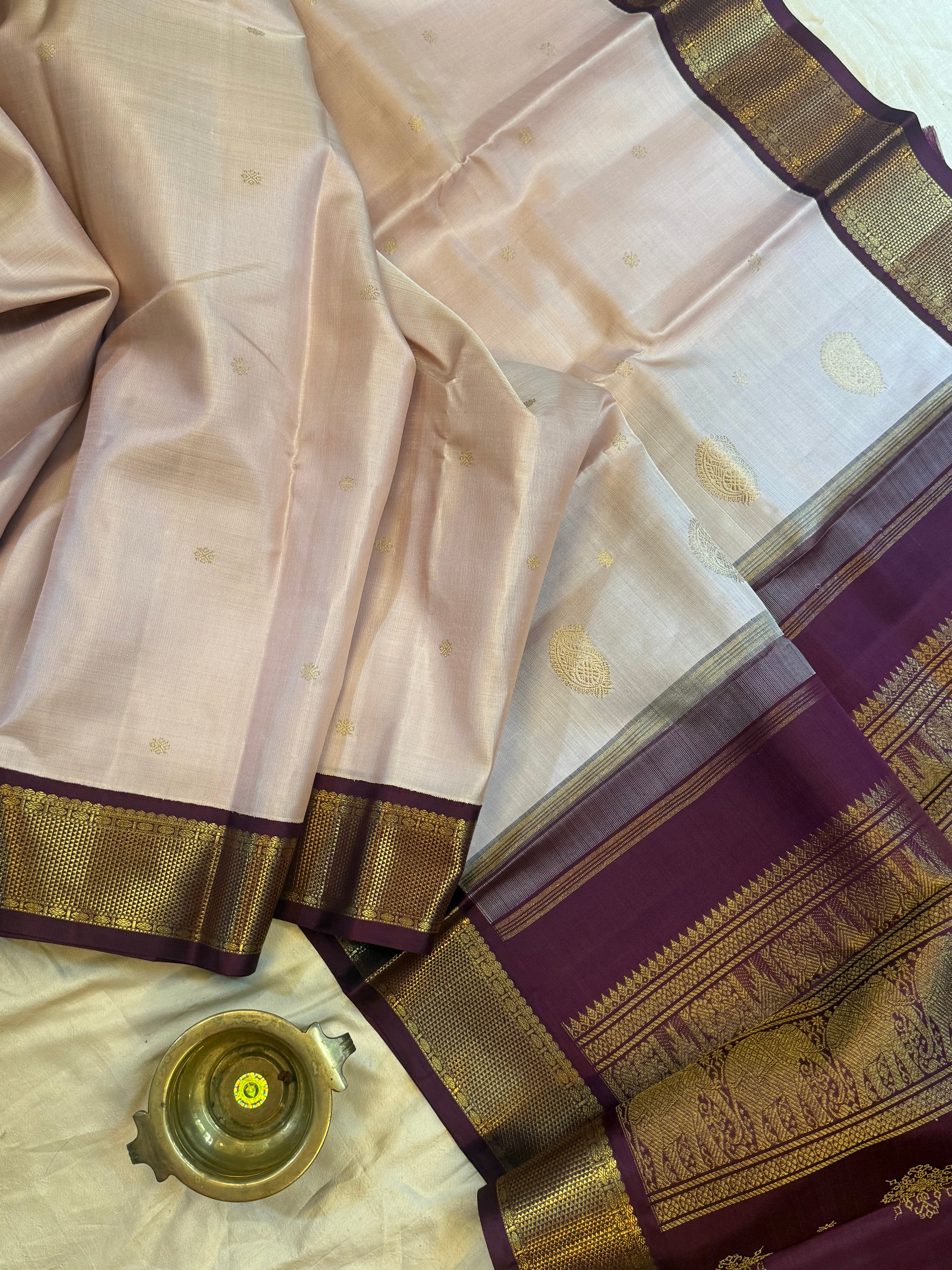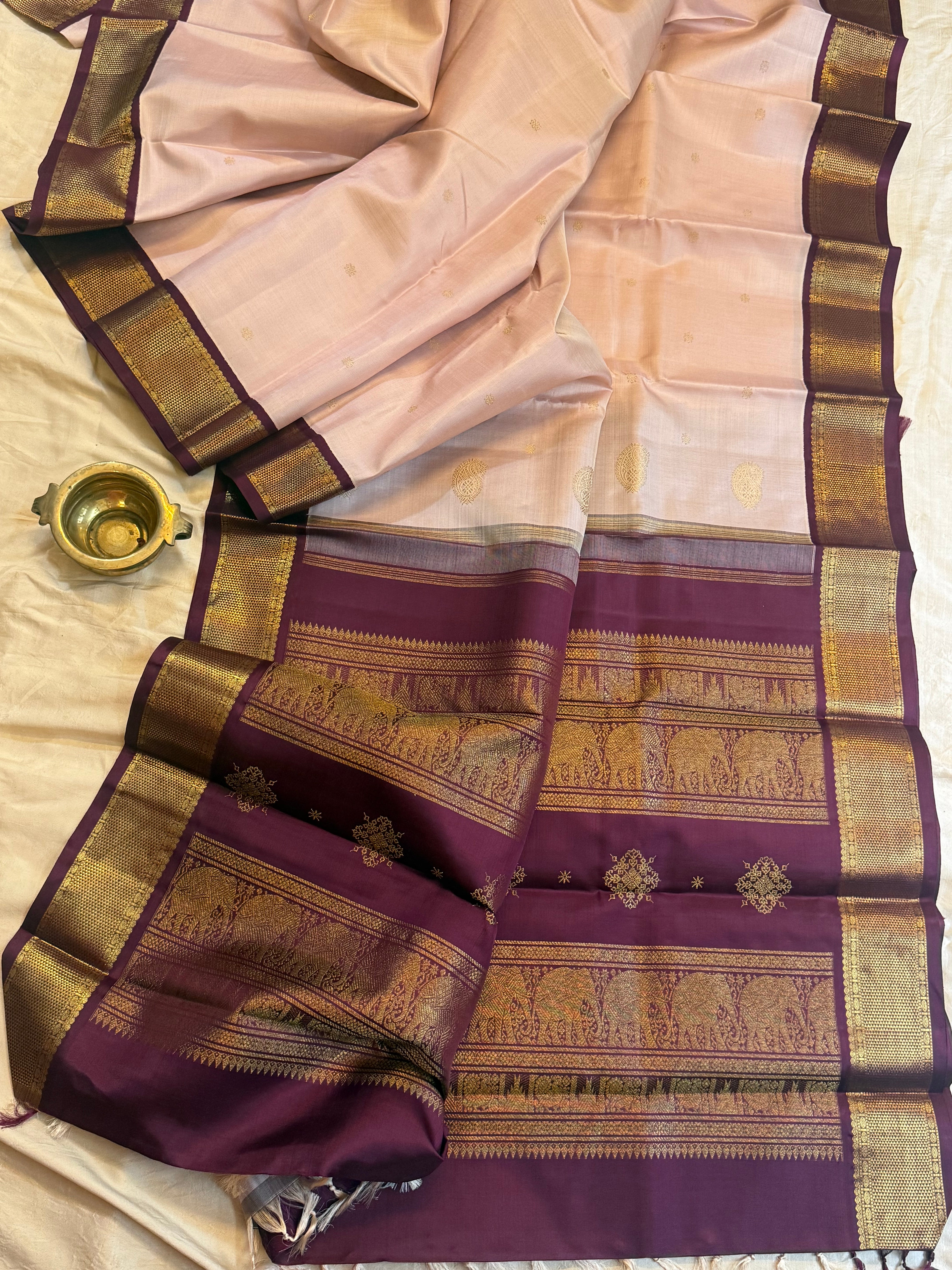 The body is blush pink shot with small Kamalam Butta and the border is dark brown with araimadam pet and the Palla has manga thindu Butta and rich dense pure Zari Palla with Kasuti Butta in centre