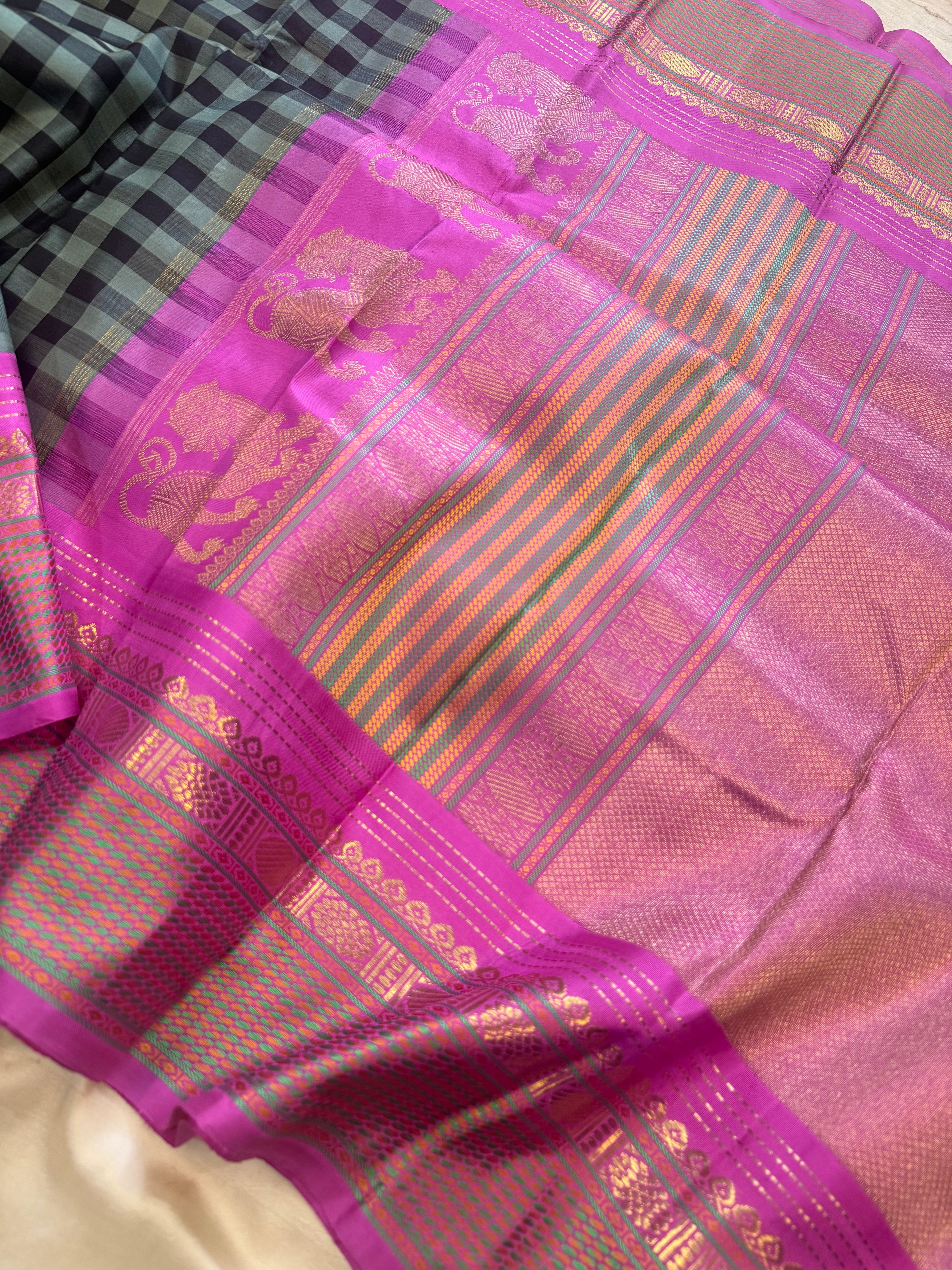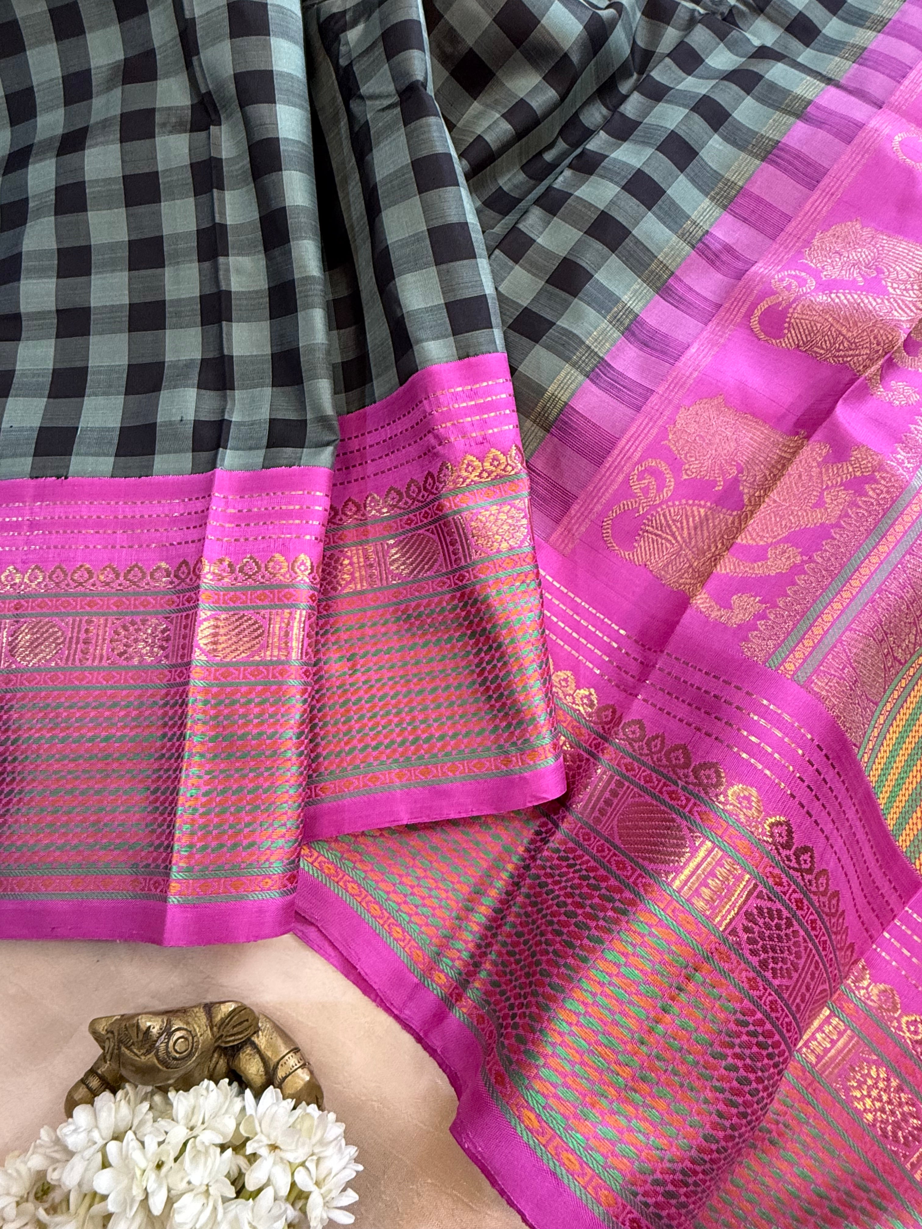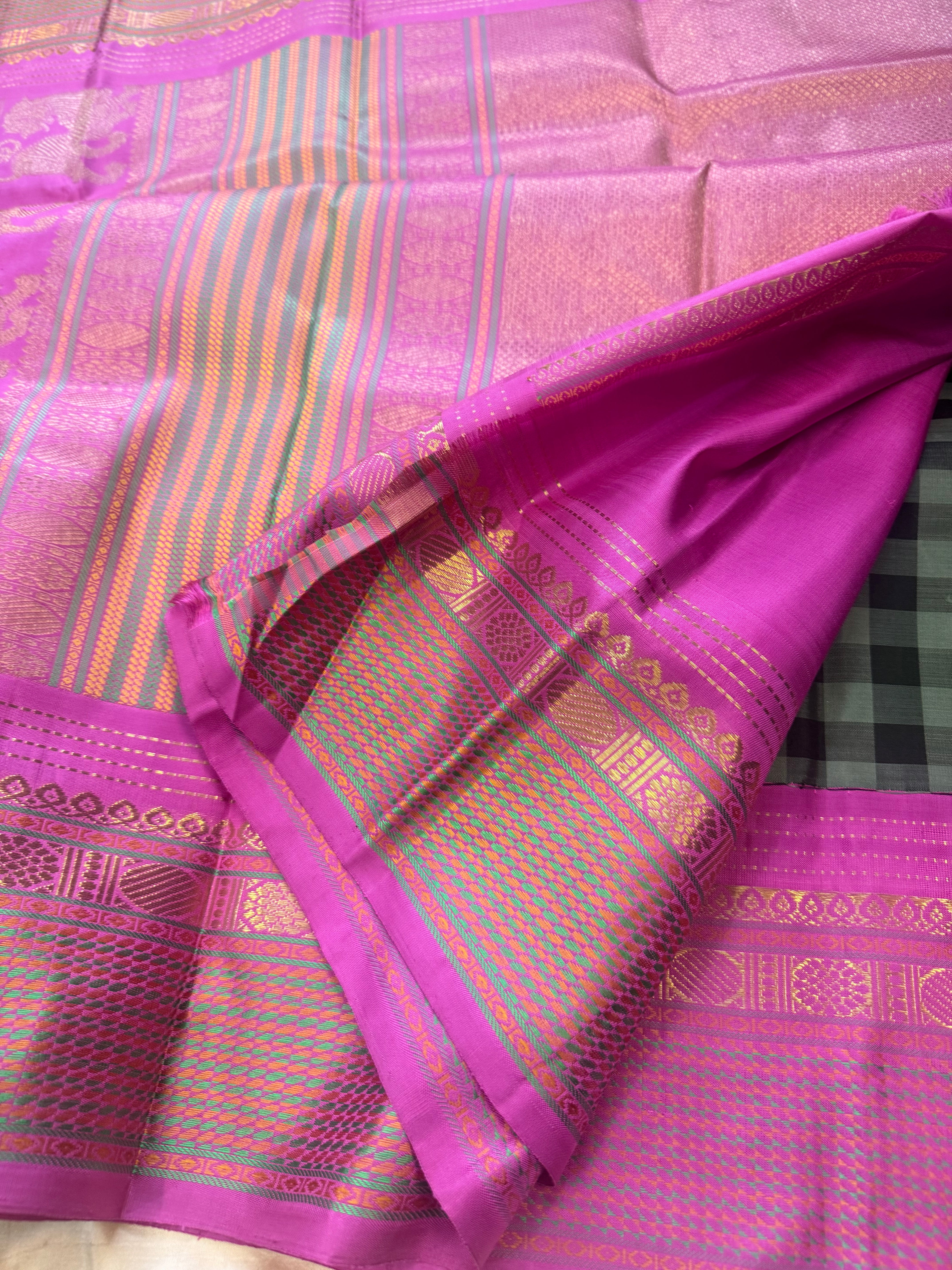The saree is teal green and black Kattam in body with Roja pink Kai Korvai border with pulinegam motifs and singam in Palla as thindu Butta and blouse