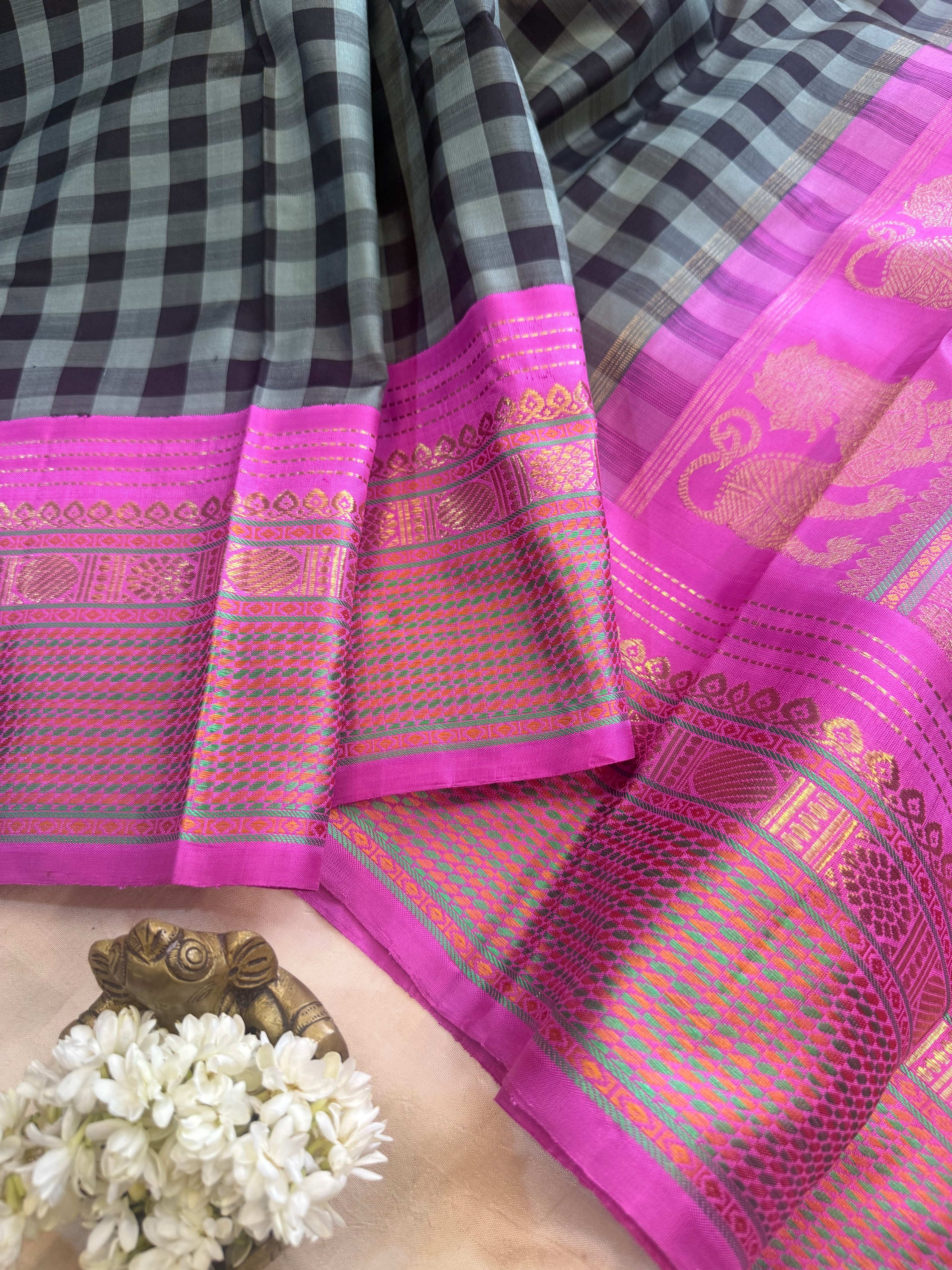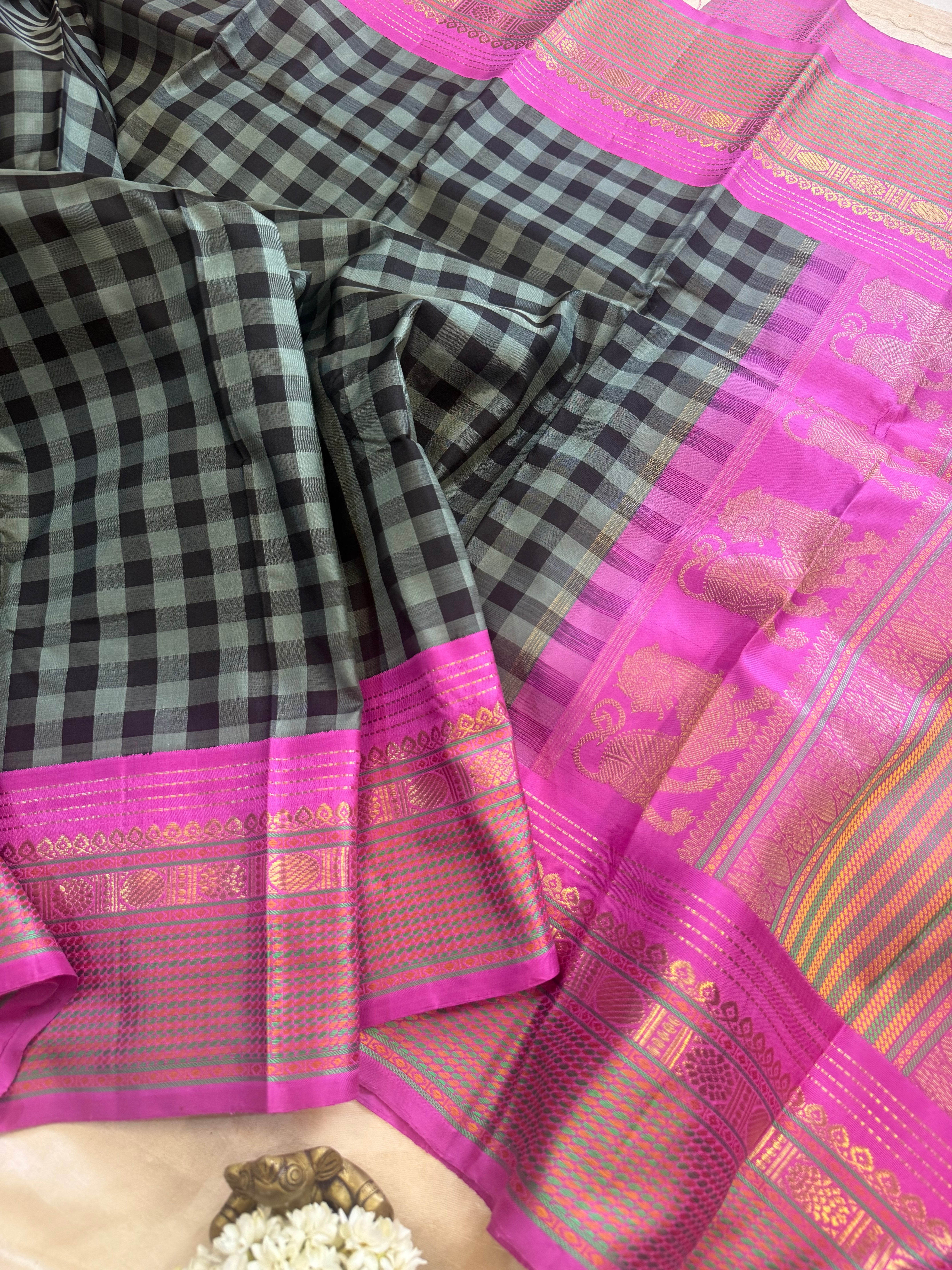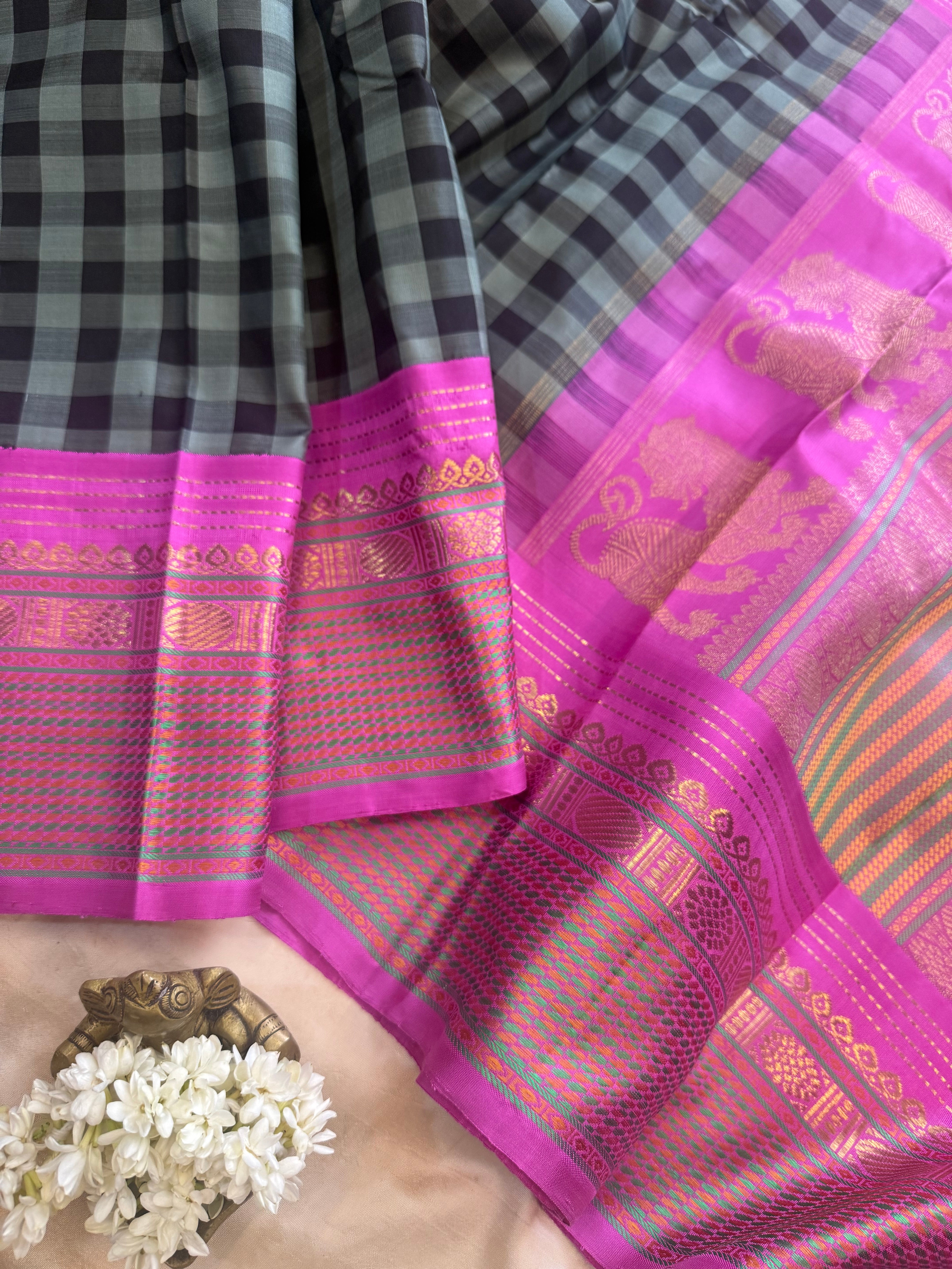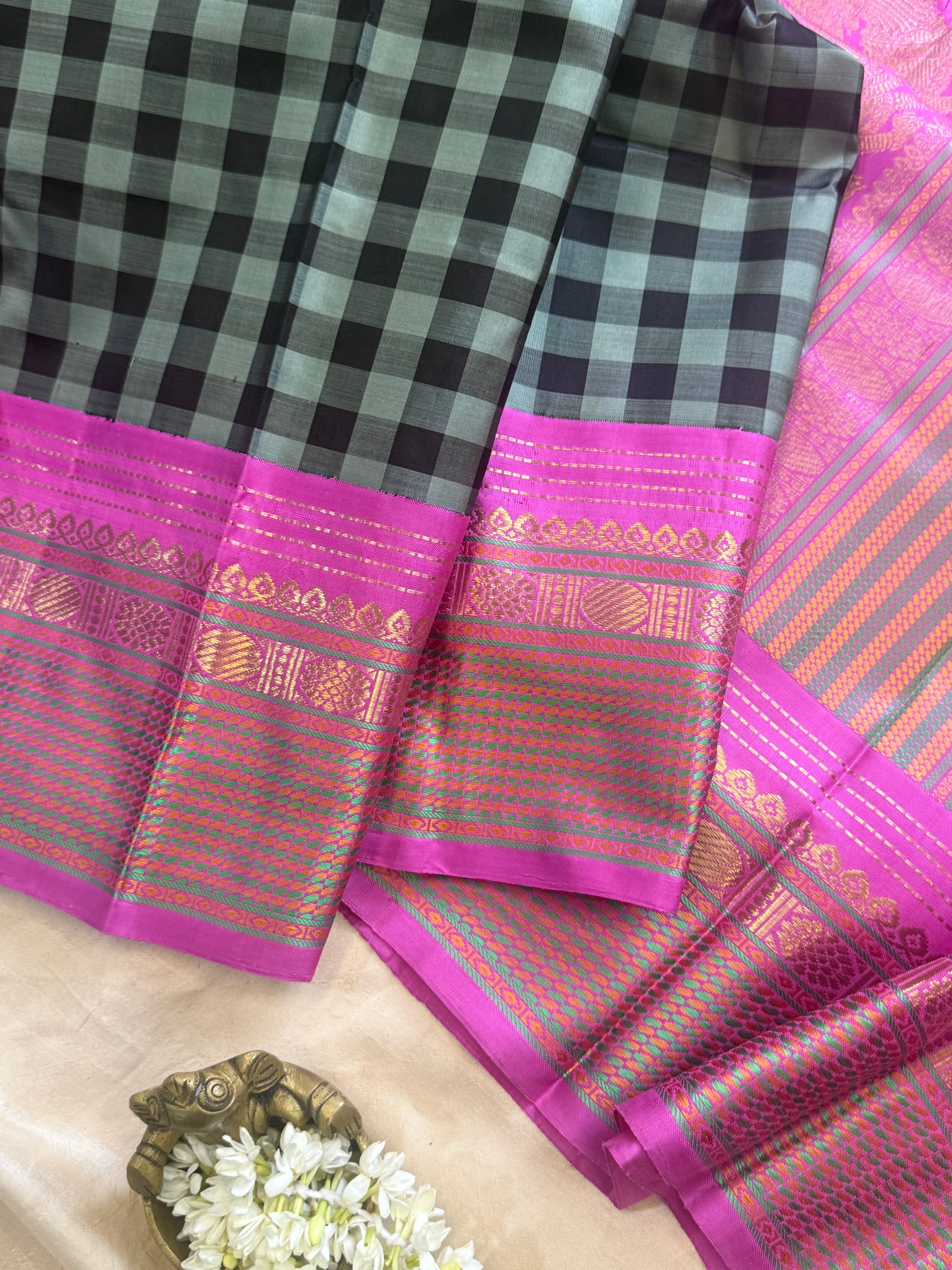 The saree is teal green and black Kattam in body with Roja pink Kai Korvai border with pulinegam motifs and singam in Palla as thindu Butta and blouse