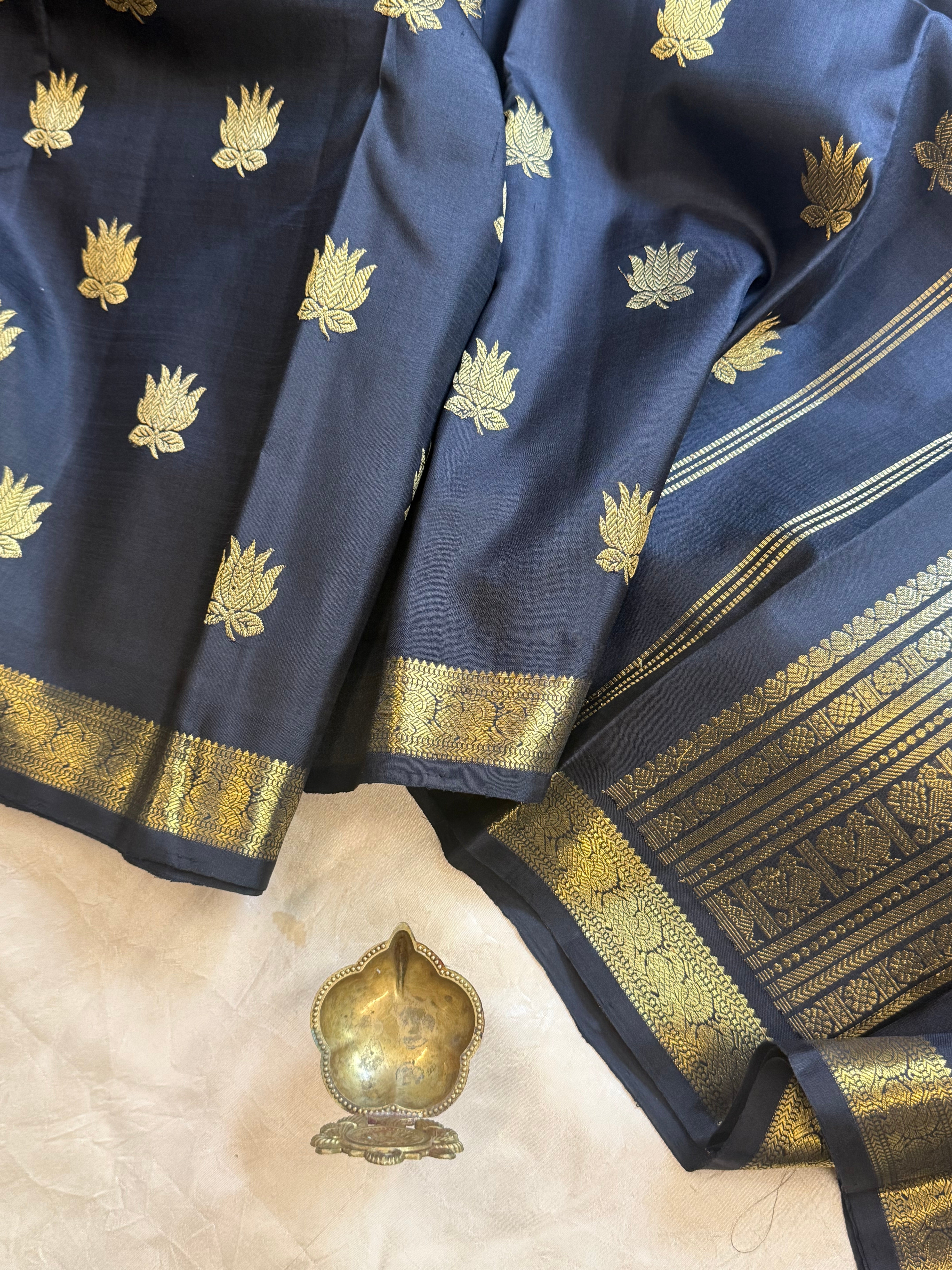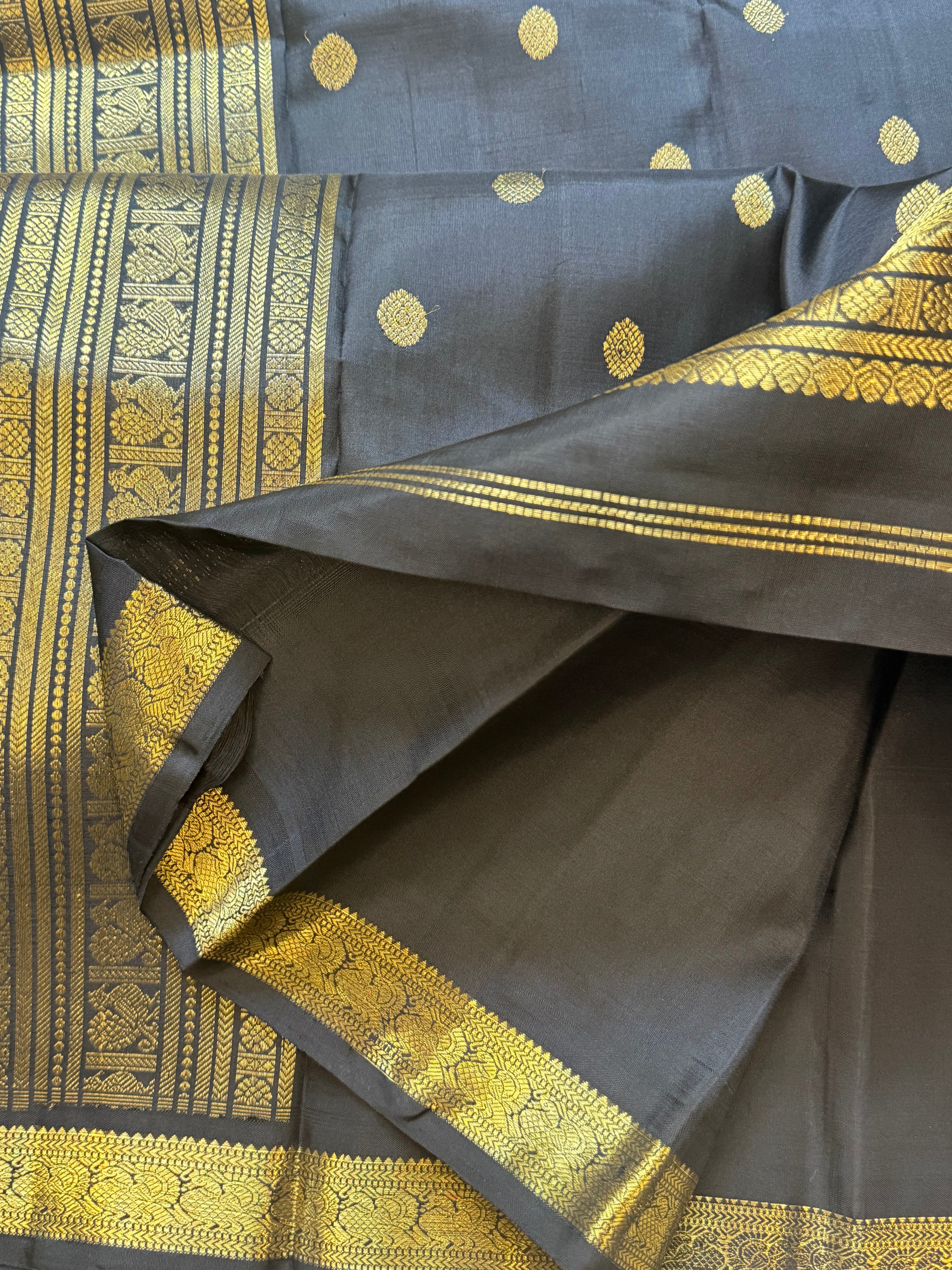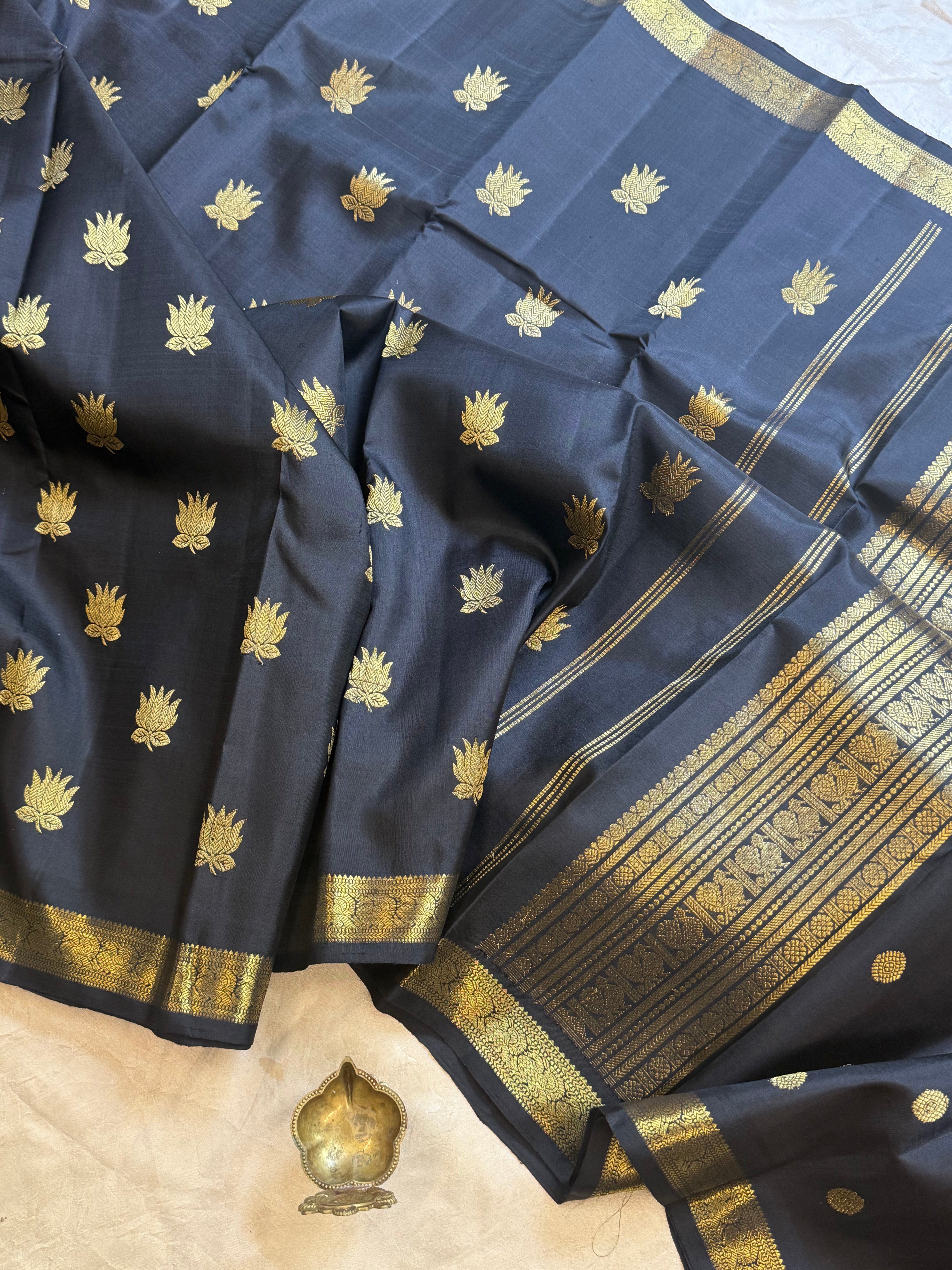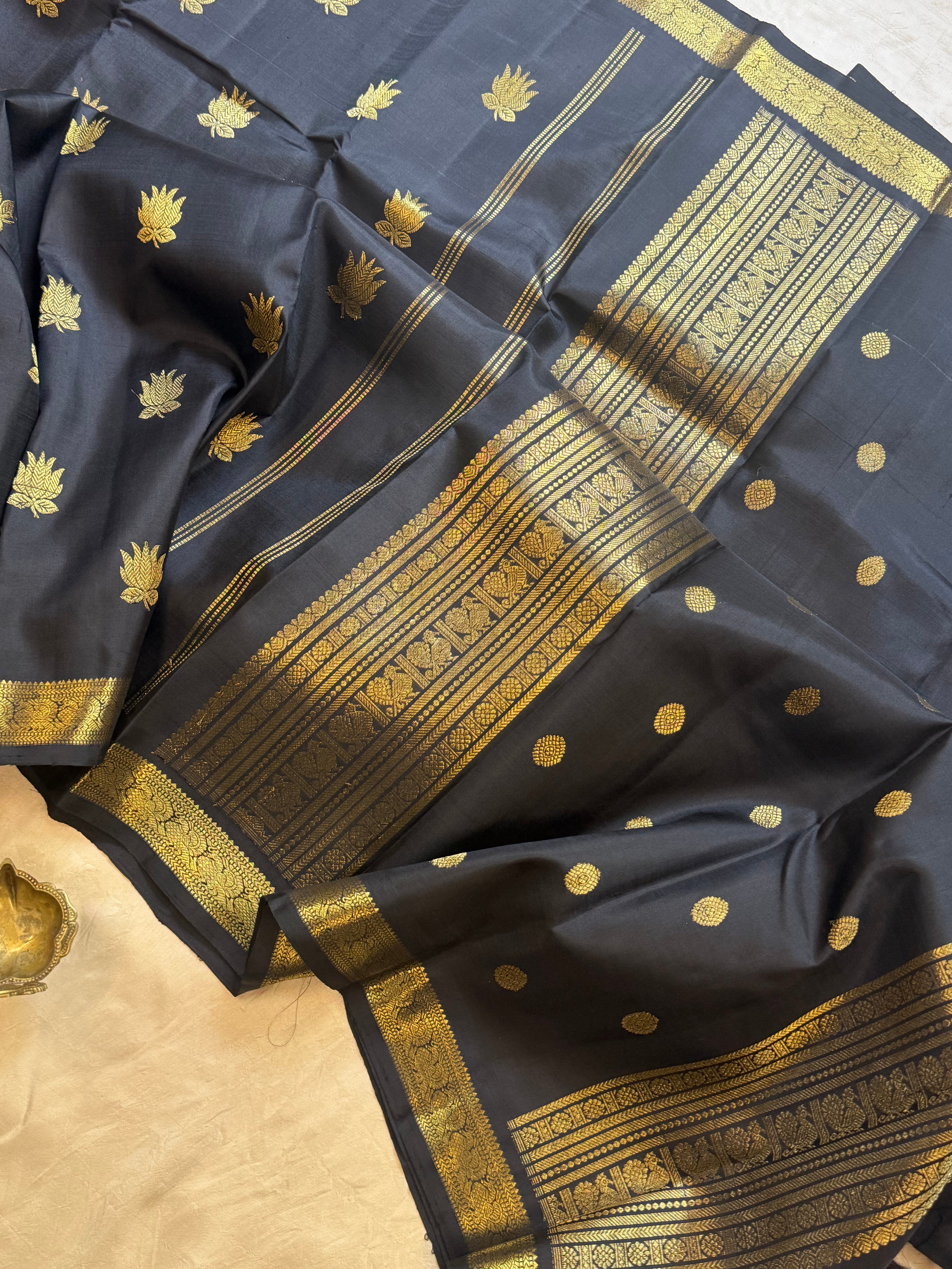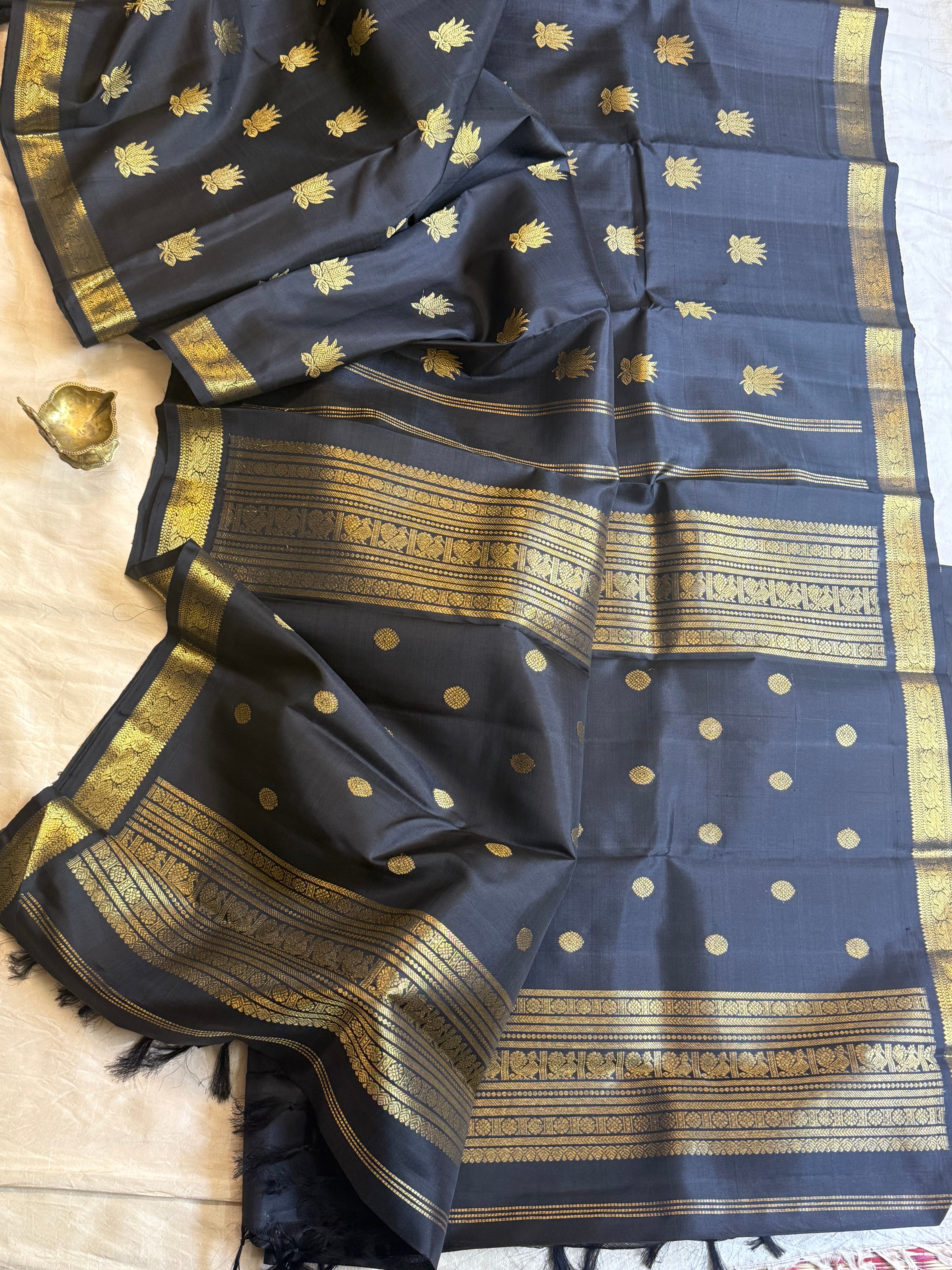 The body is black color with small lOtis Butta and the border is annam pet and dense pure Zari Palla and blouse