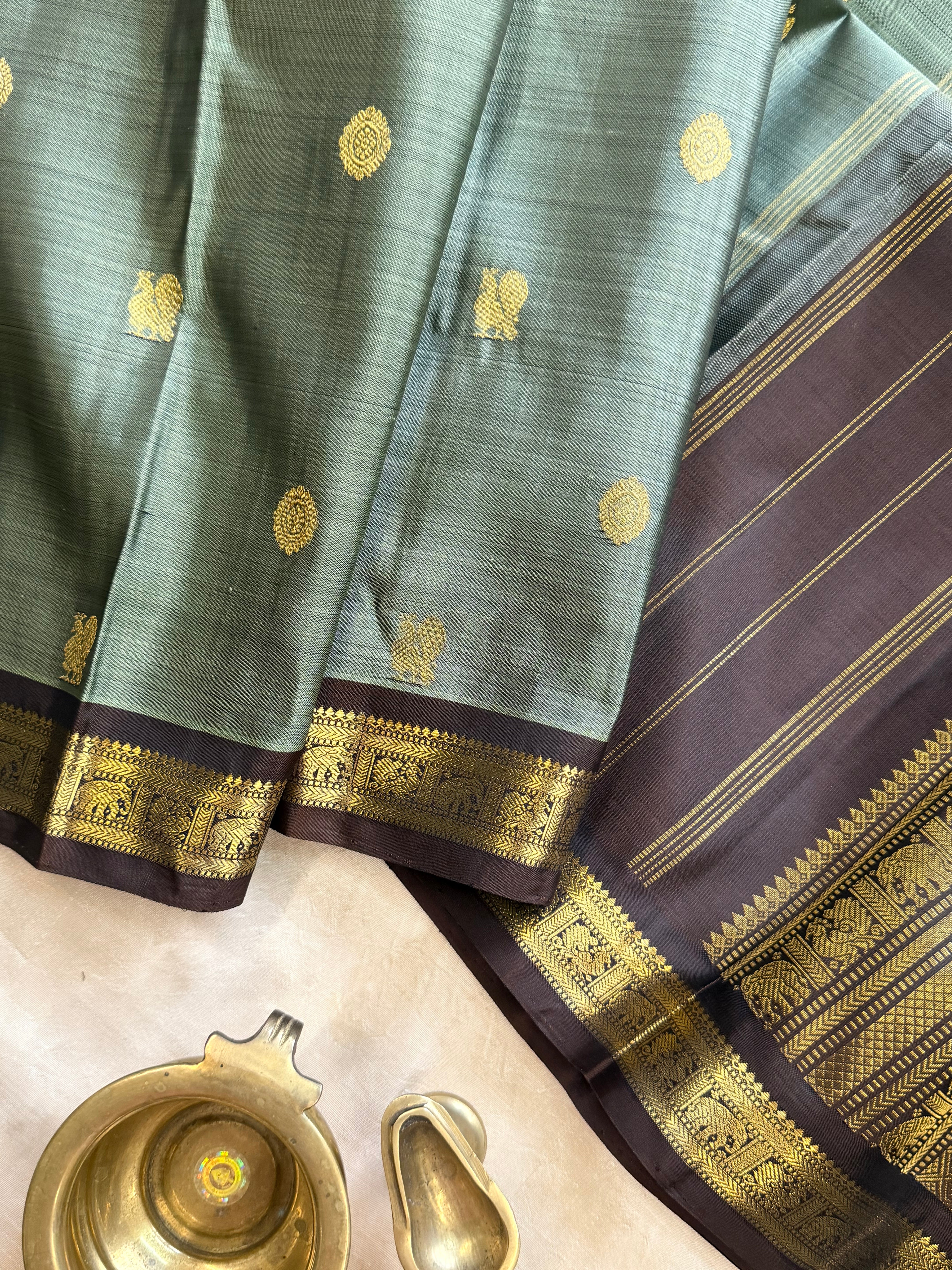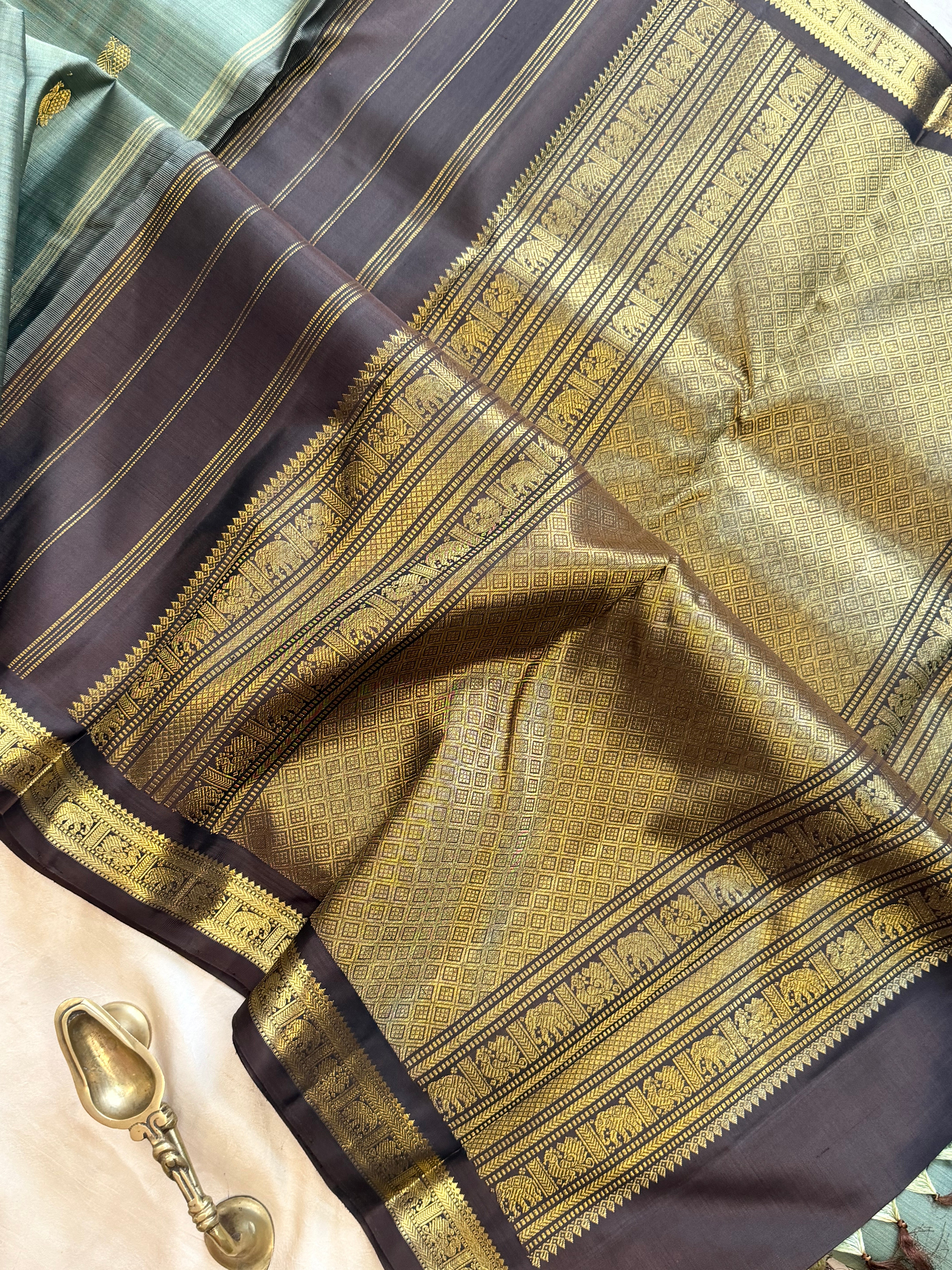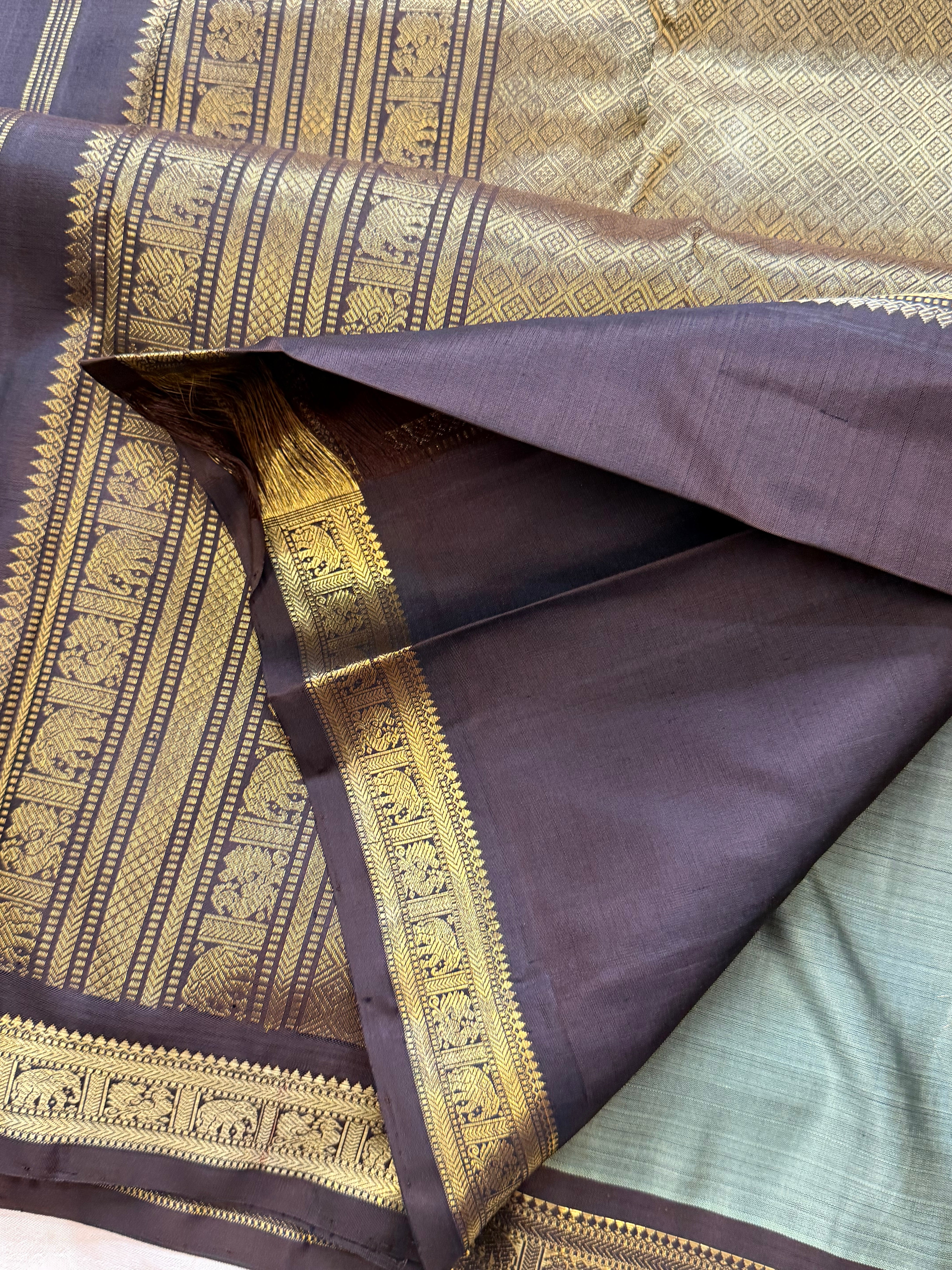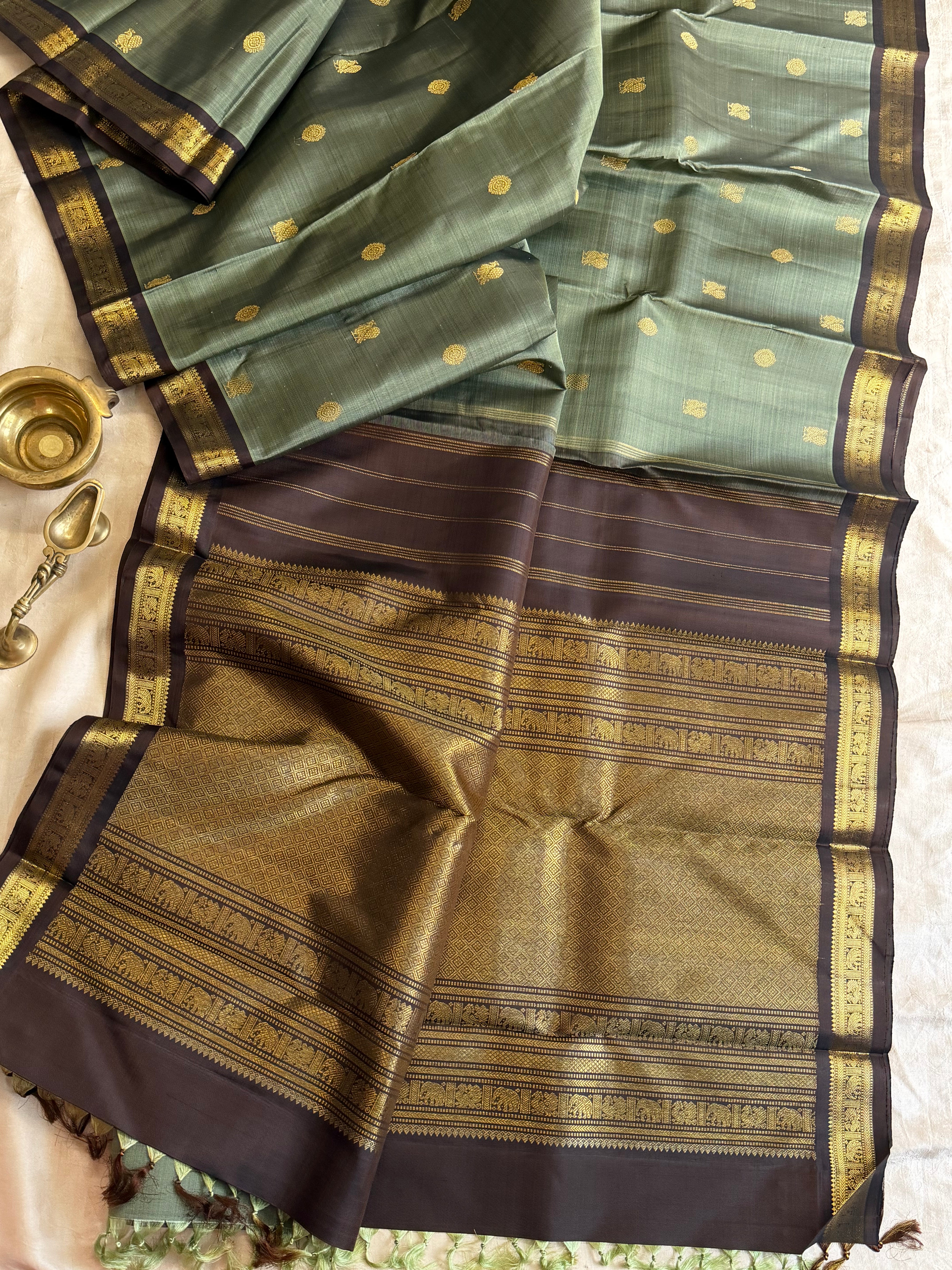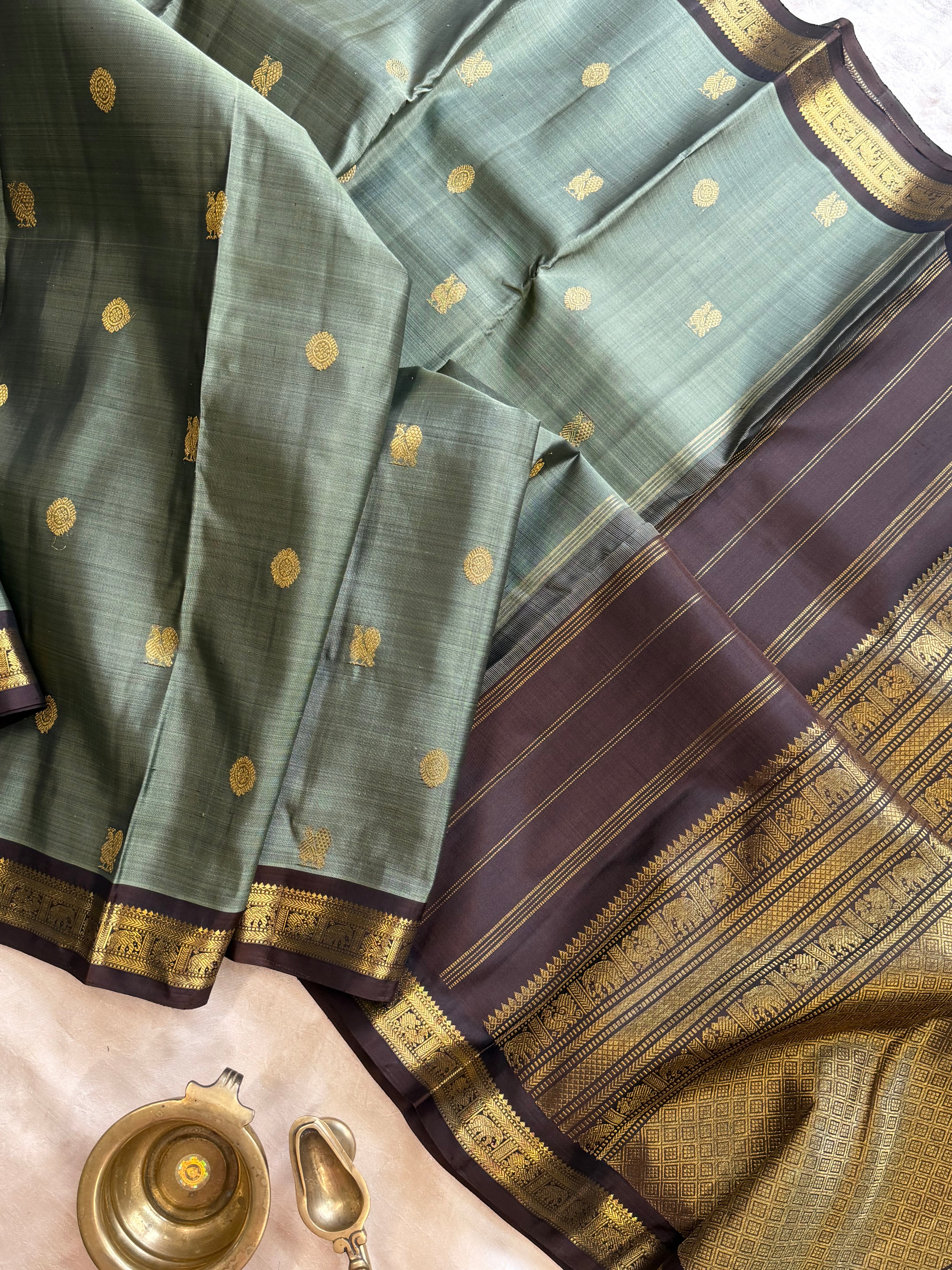 The body is pastel green with Annam chakram Butta and the border is paaku colour annam yaanai pet and dense pure Zari palla and Blouse