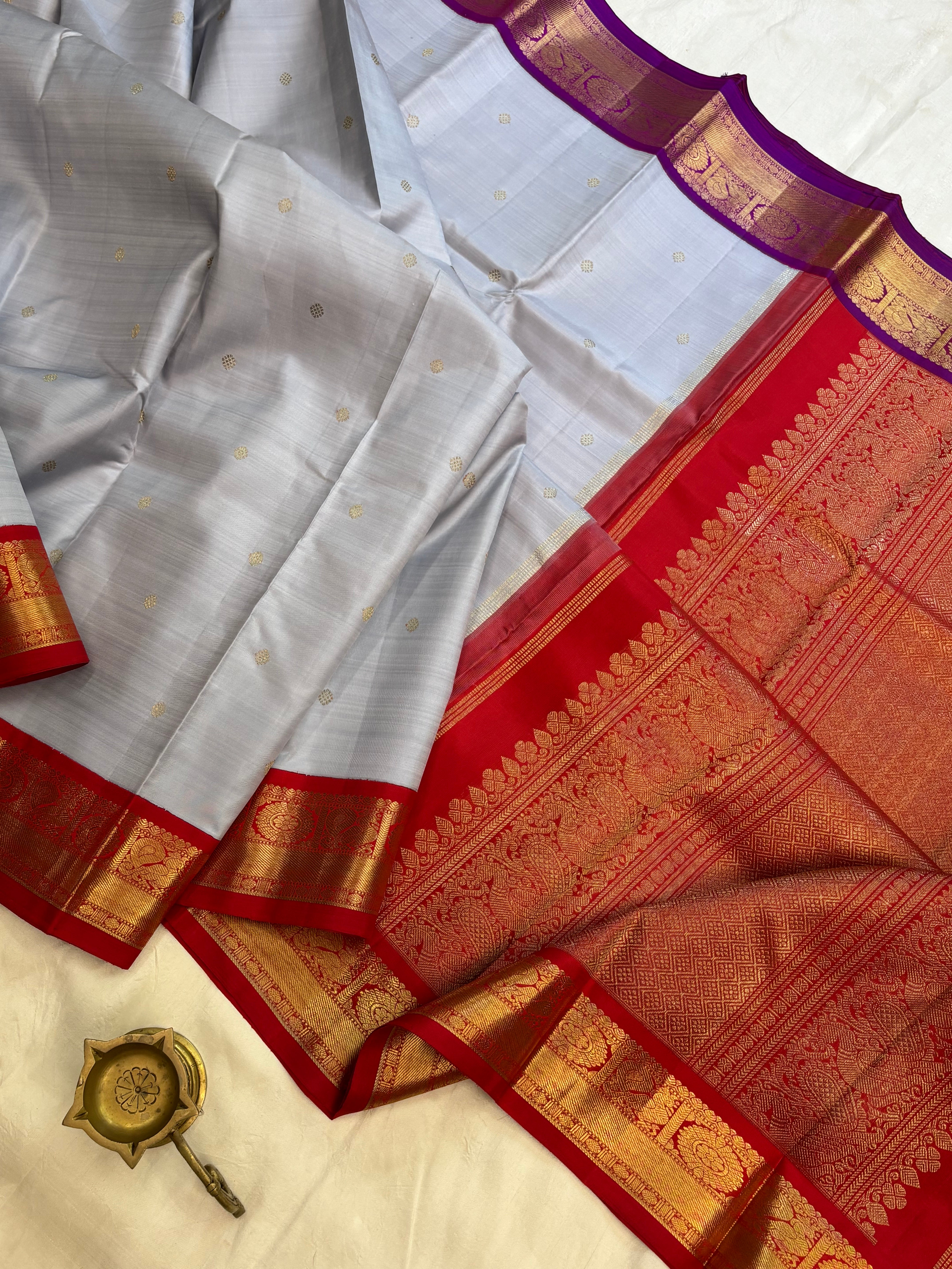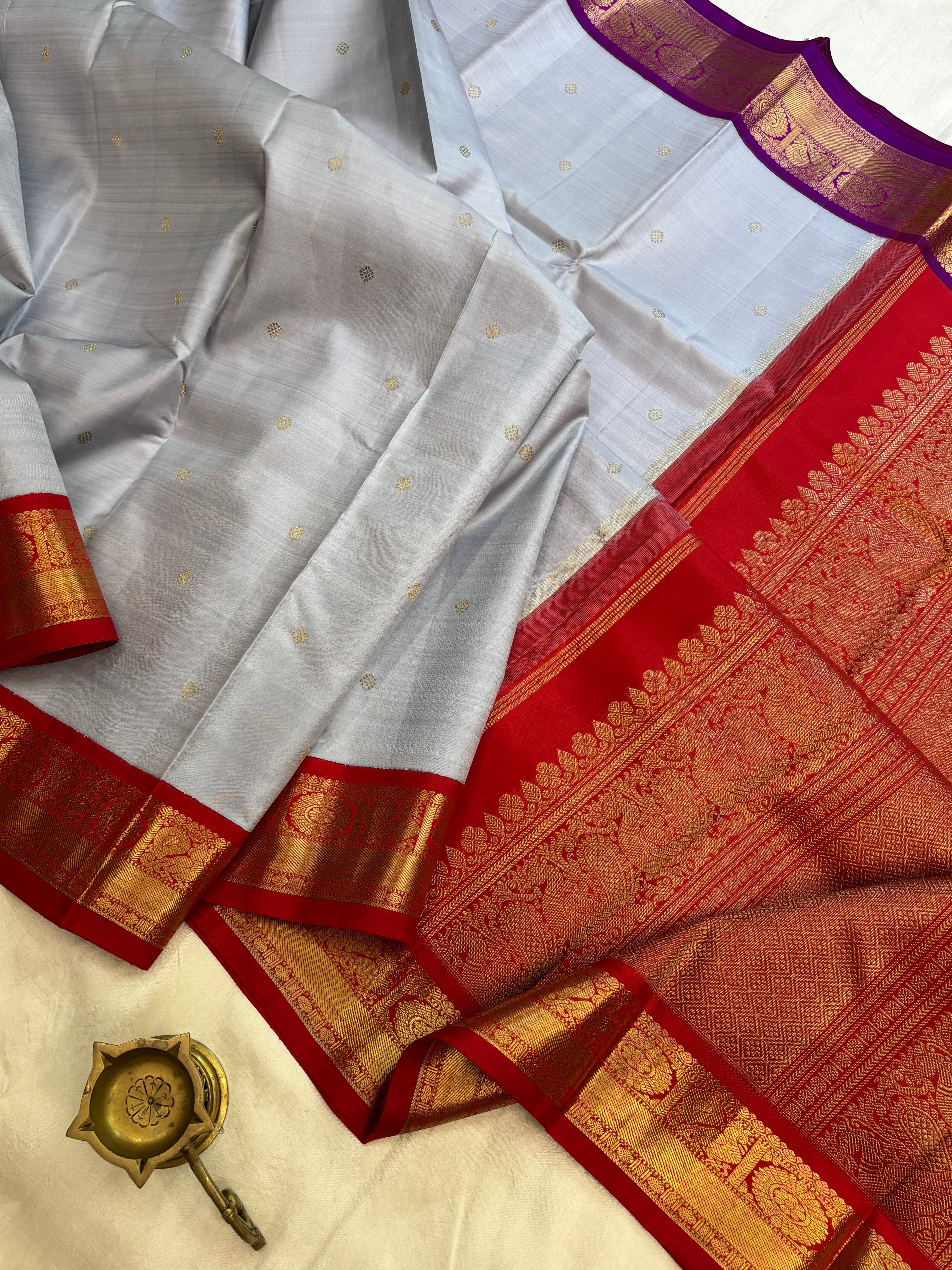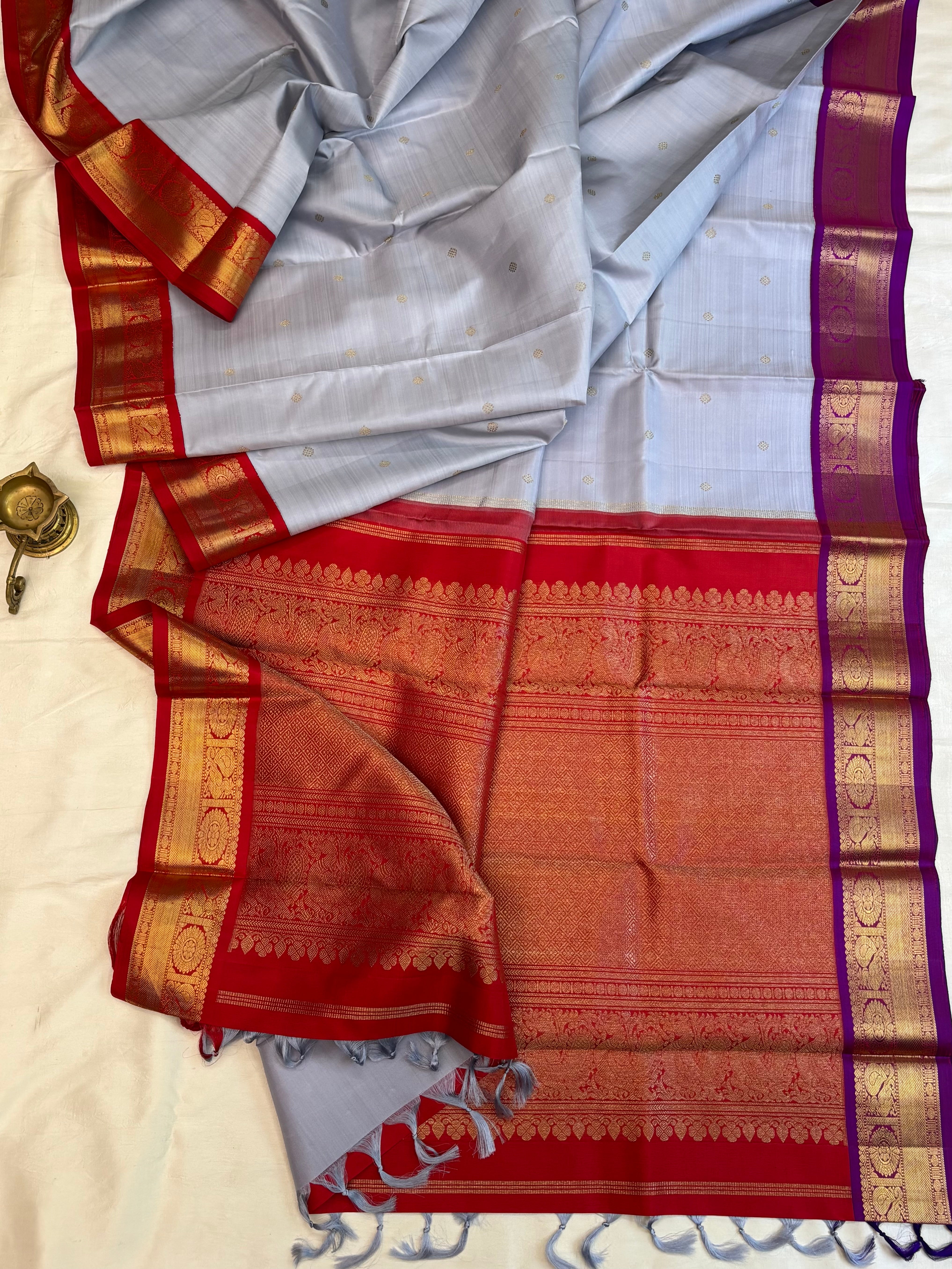 The body has steel grey with Rudraksham butta , and the border has Ganga Jamuna top border has purple and bottom has red with detailed pallu and attached blouse