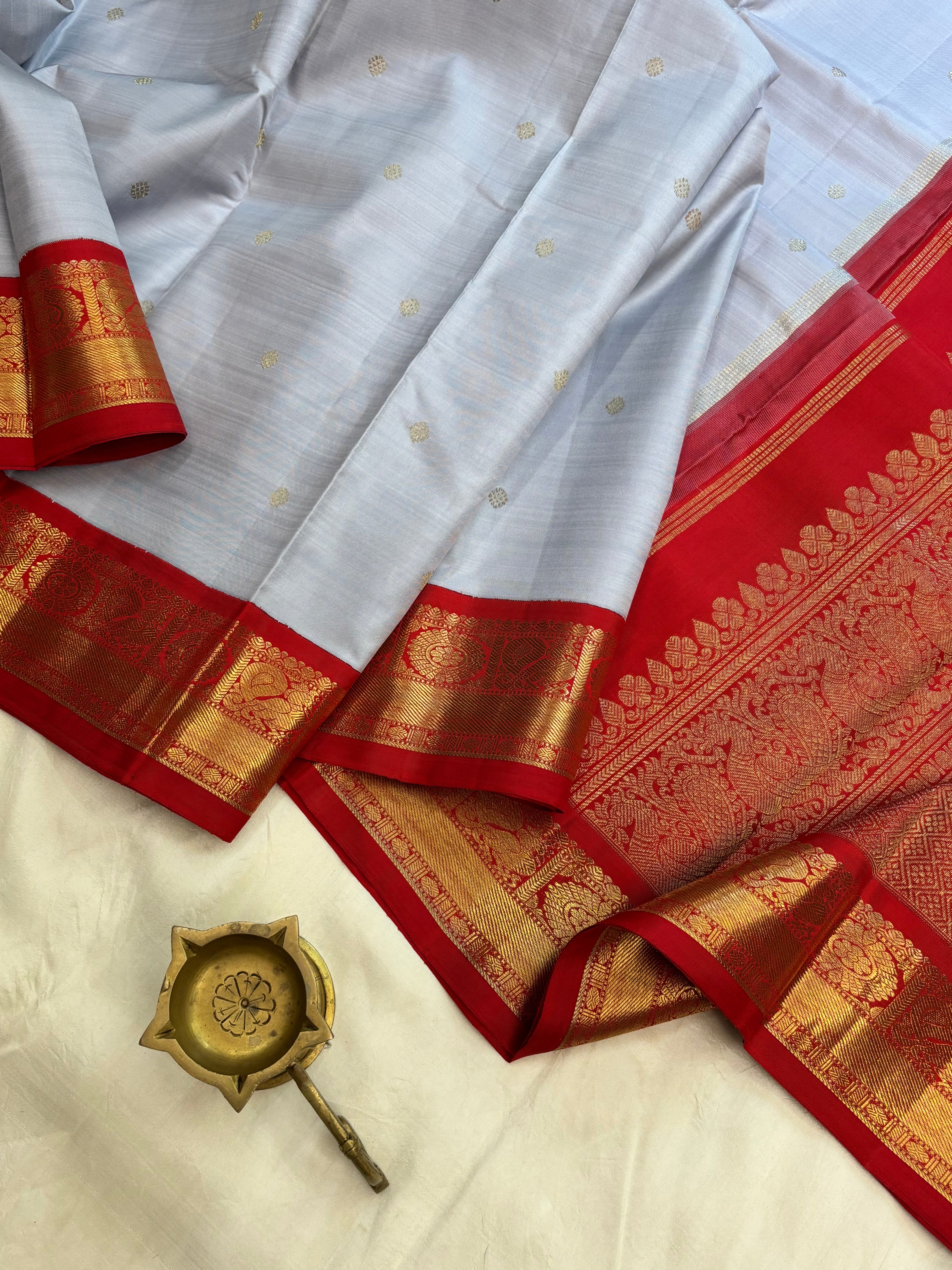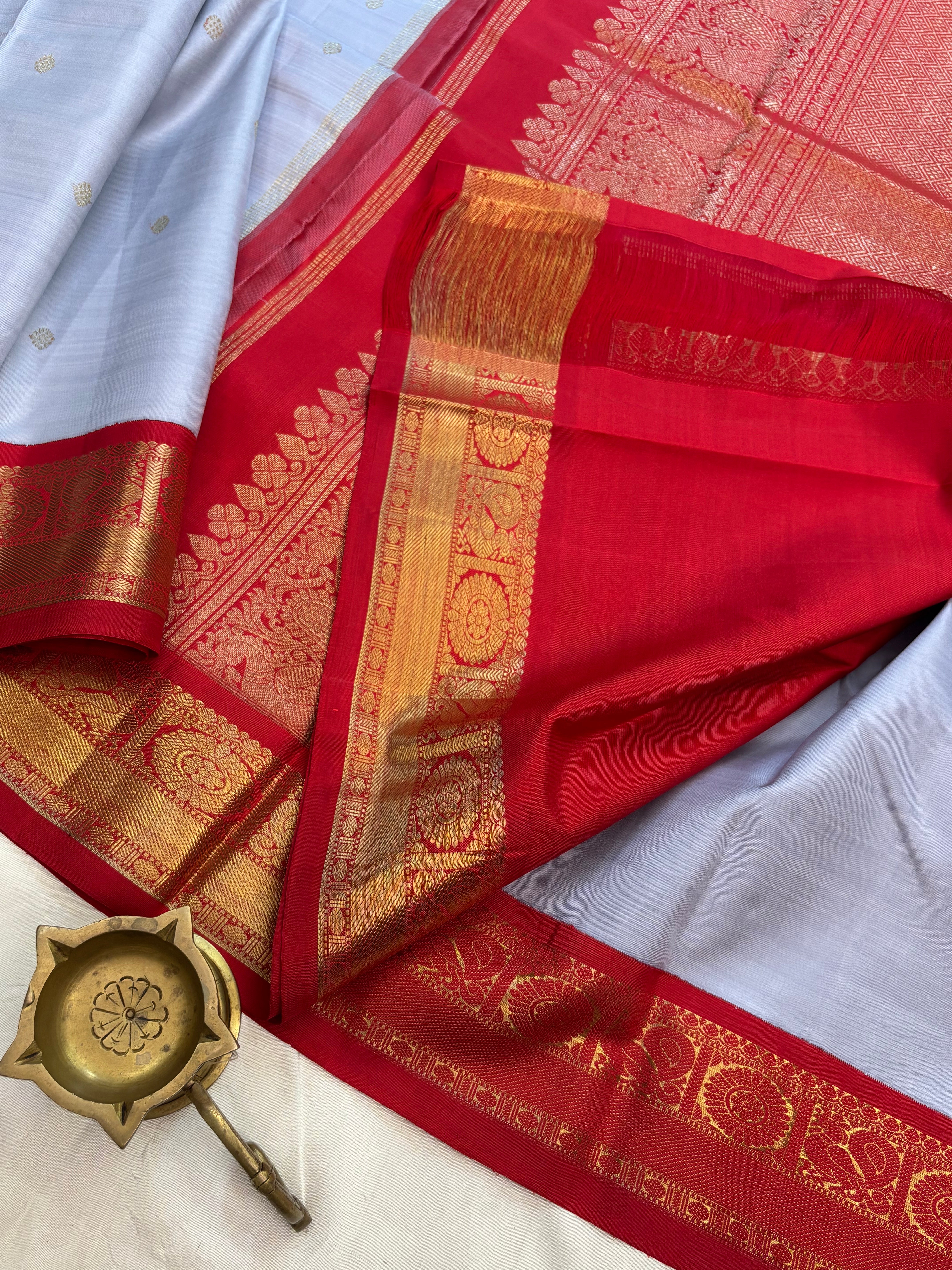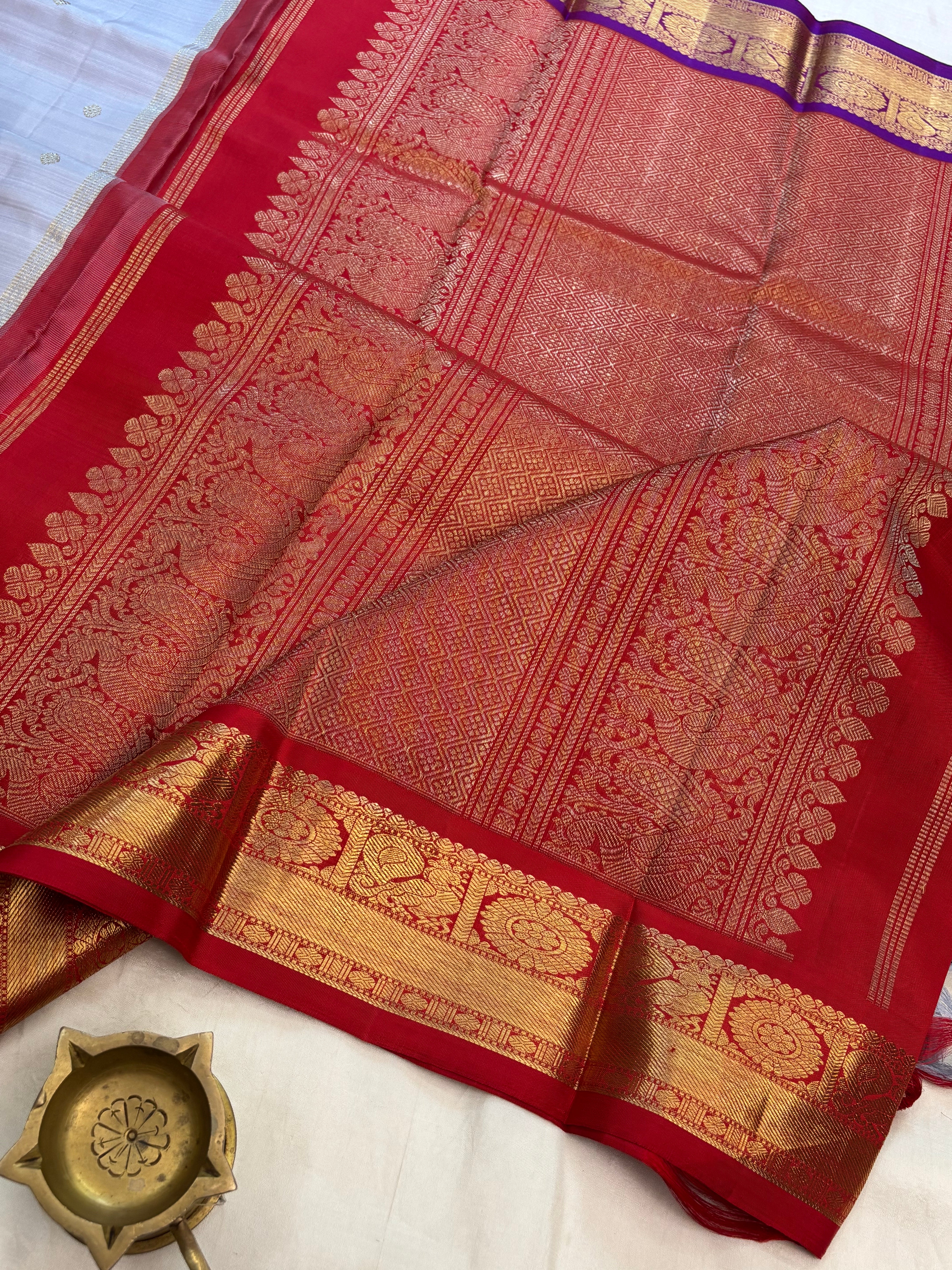 The body has steel grey with Rudraksham butta , and the border has Ganga Jamuna top border has purple and bottom has red with detailed pallu and attached blouse