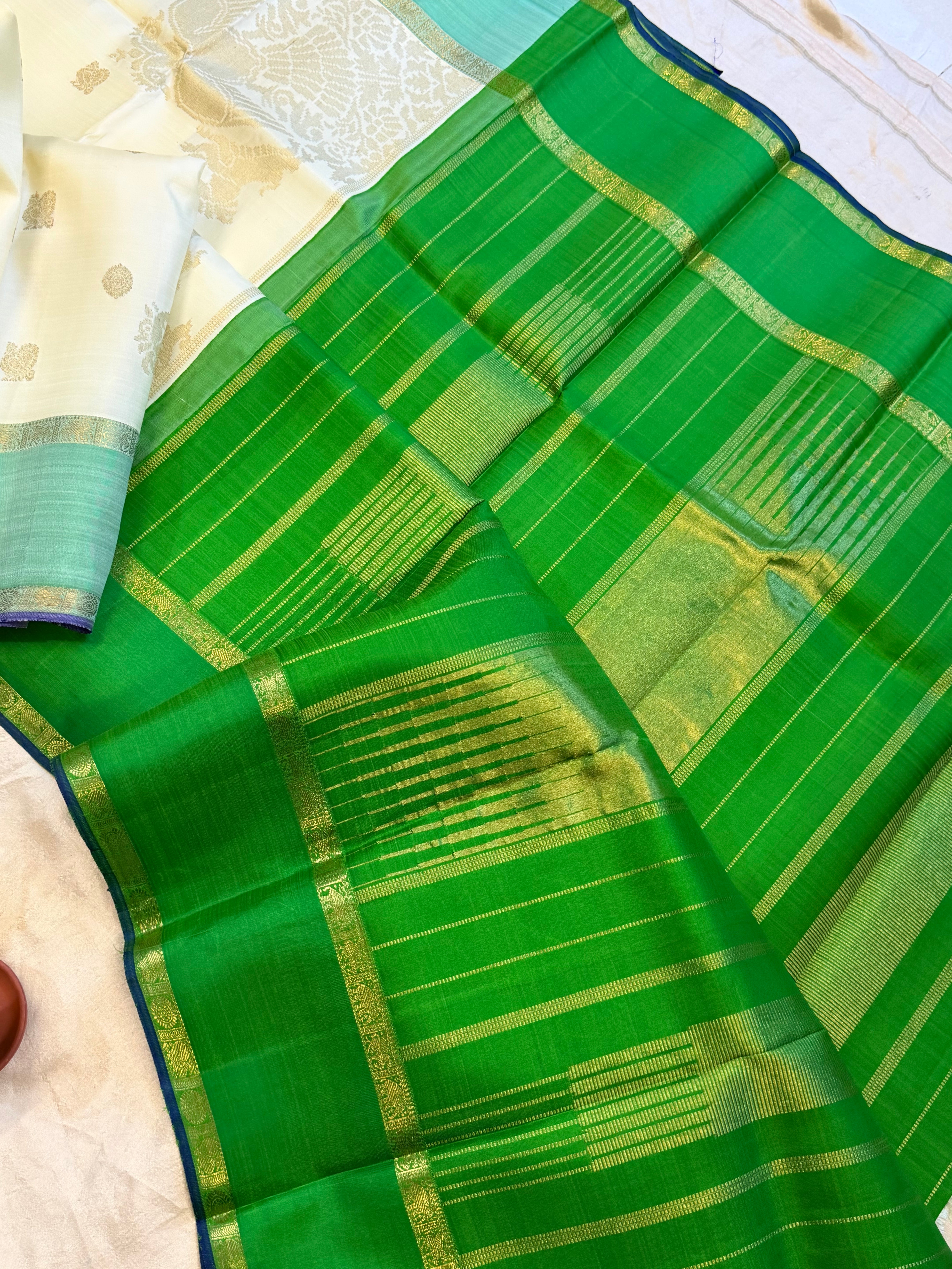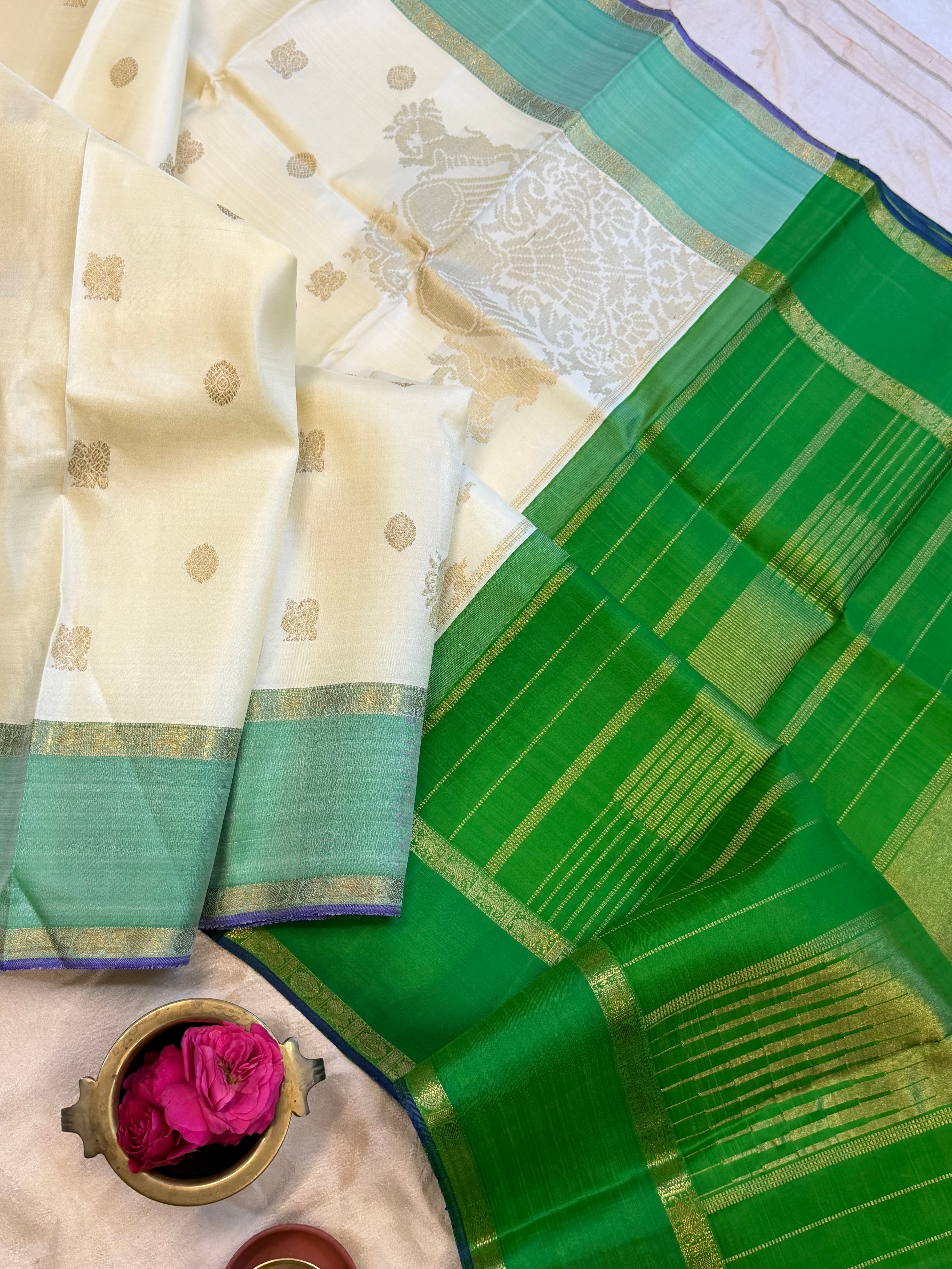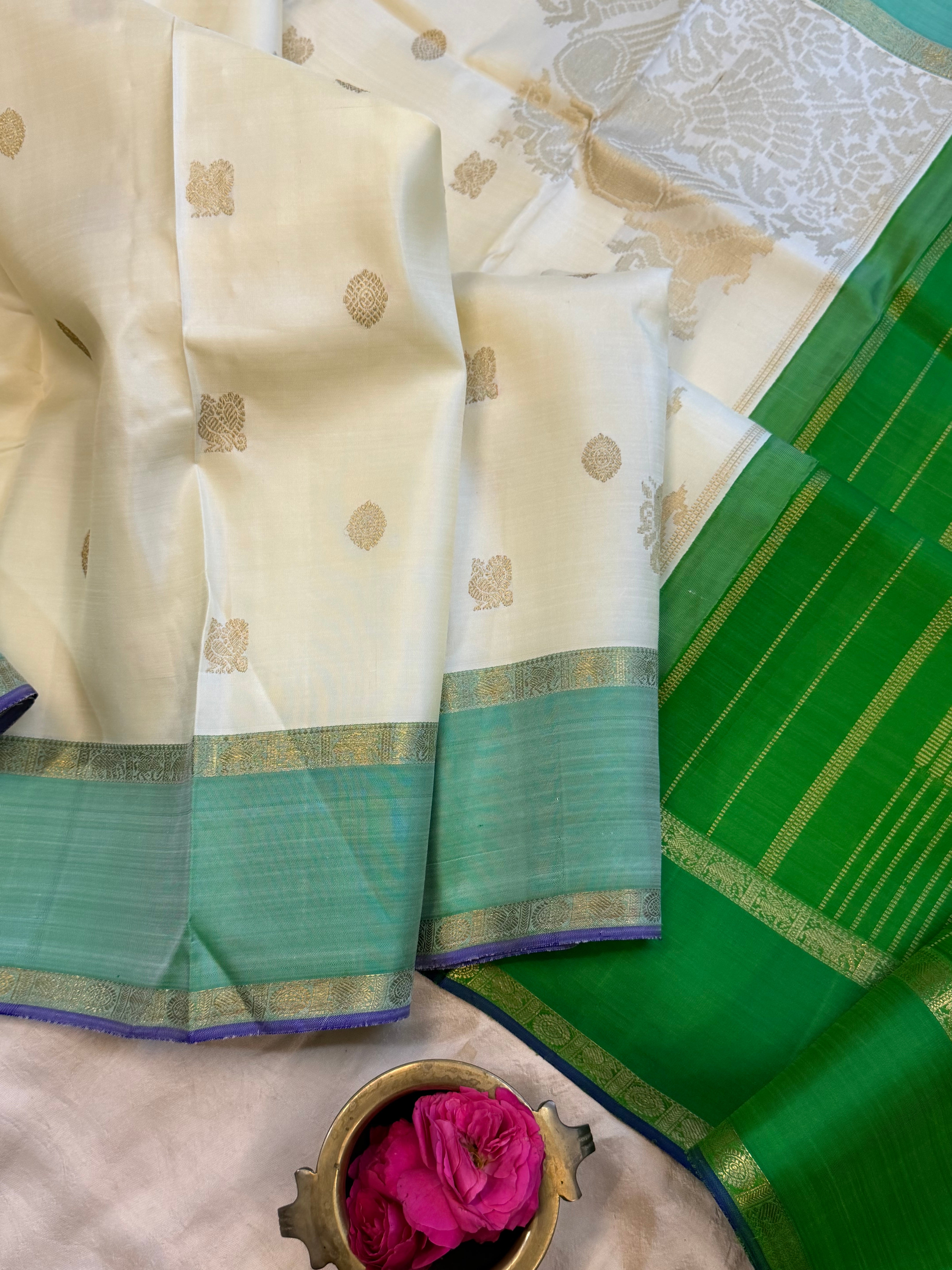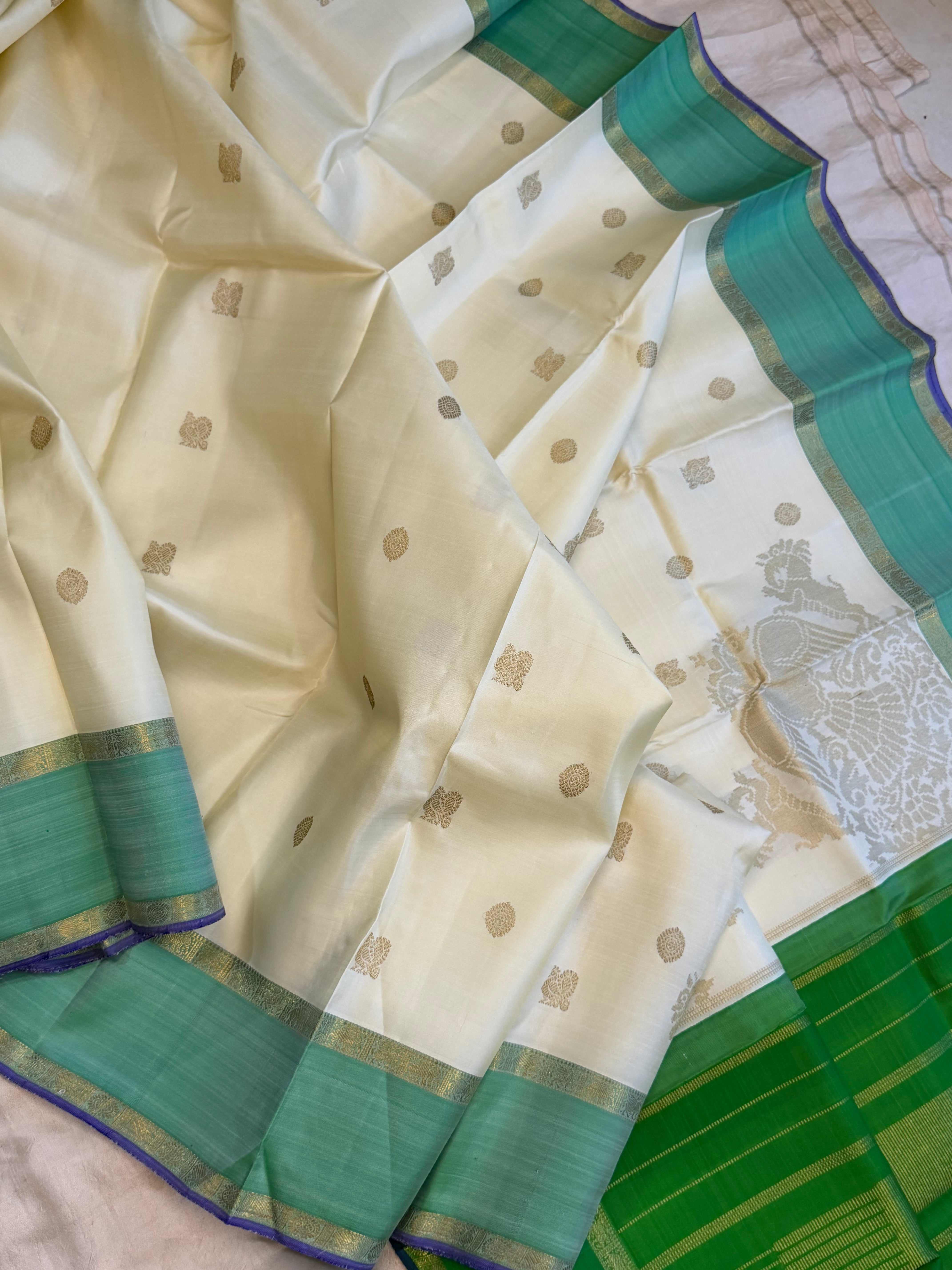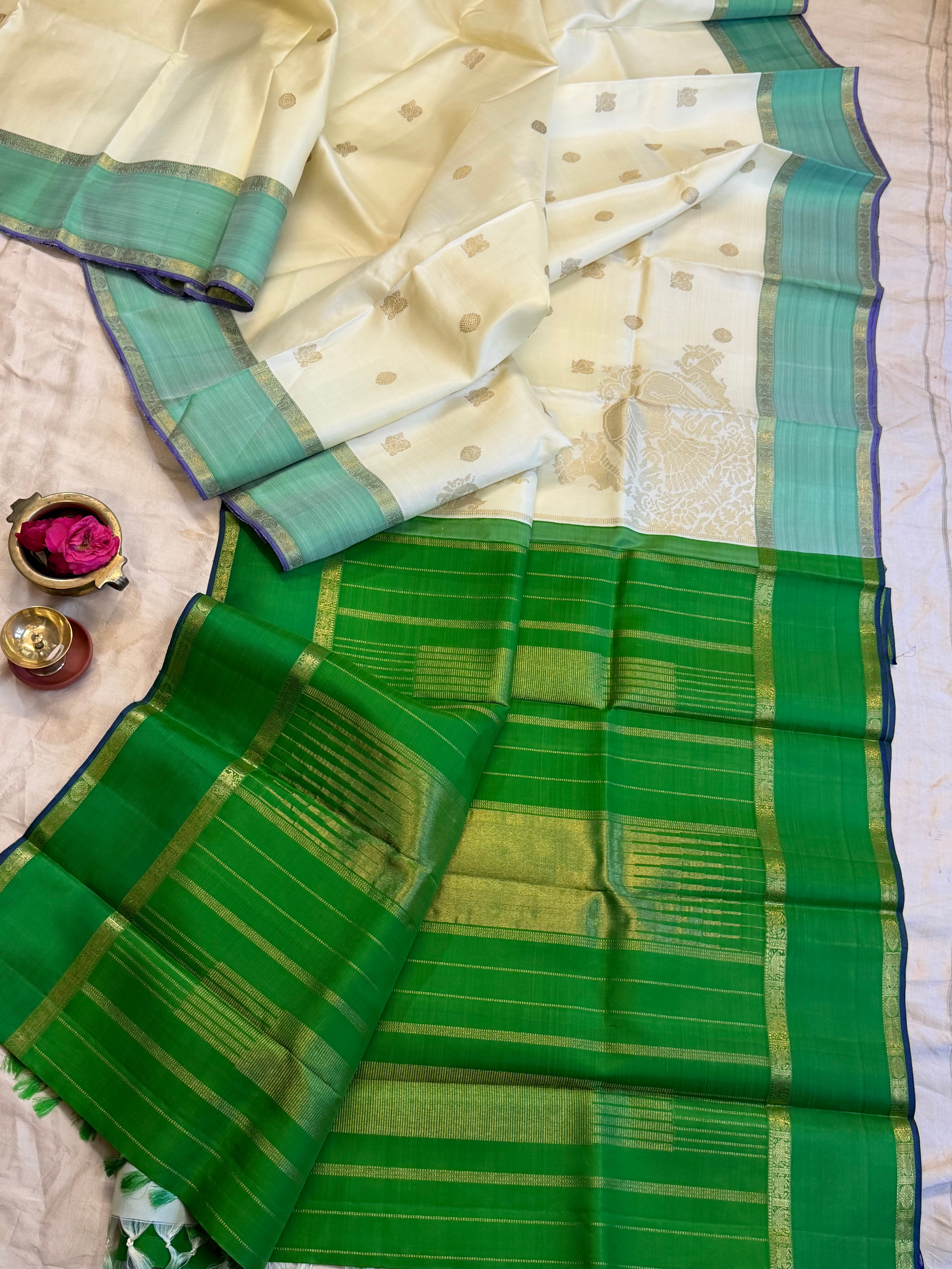 Venpattu : off white retta pet corner Butta / kanjipuram silk
