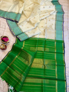 The saree is off white with Annam chakram Butta and retta pet border in green and corner irutalaipakshi woven in Adai and green Zari palla and blouse