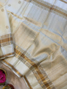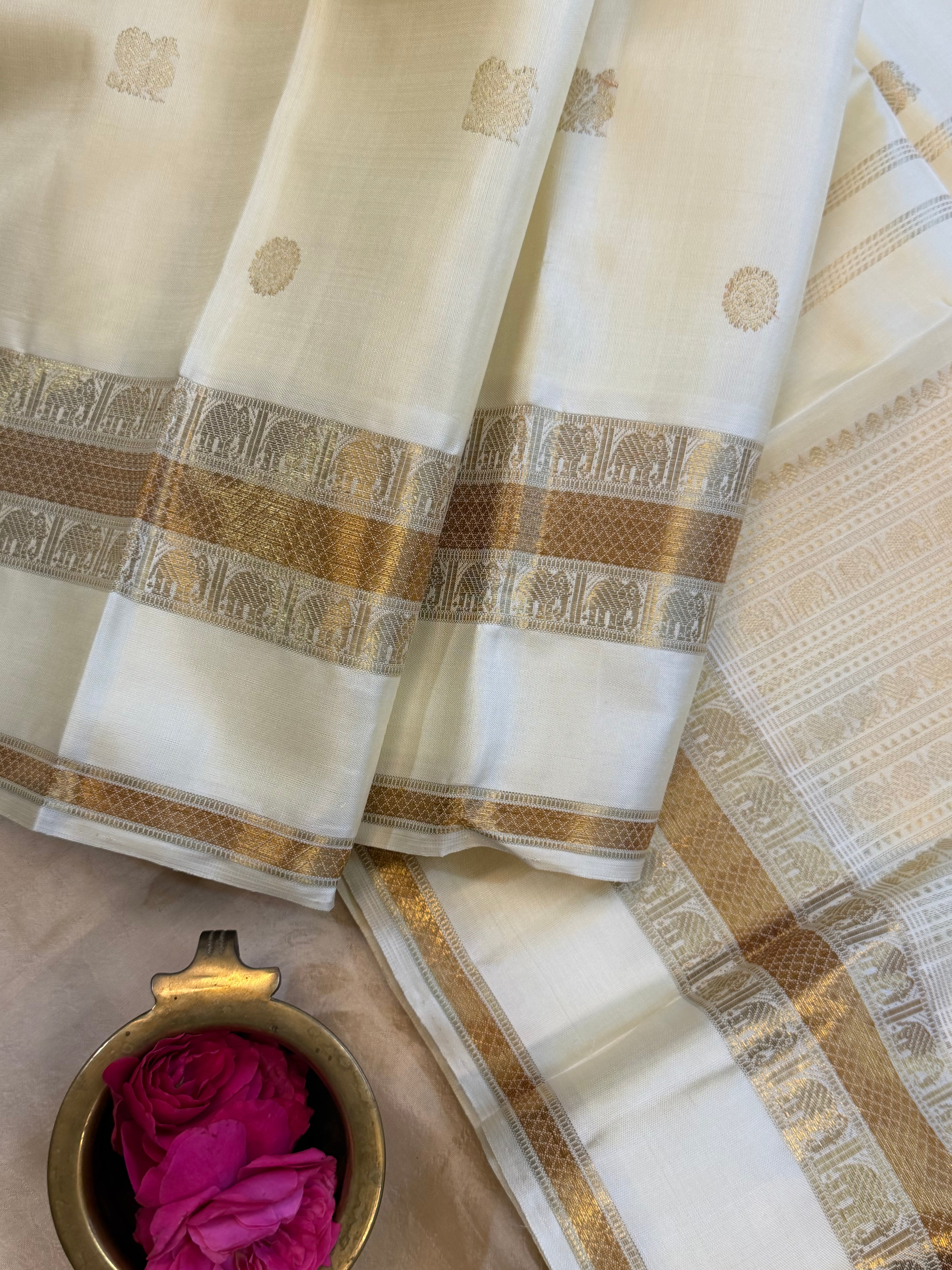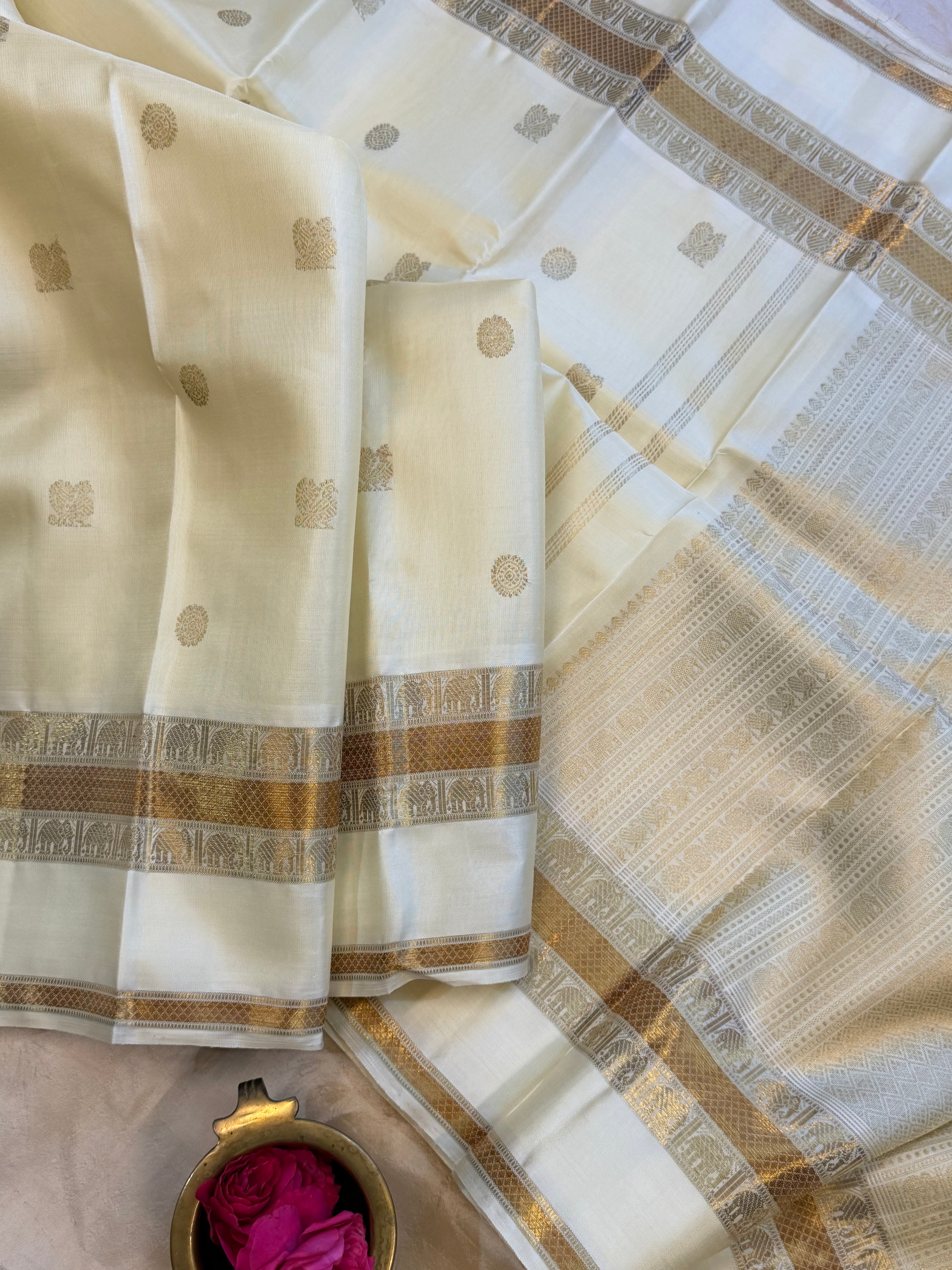 The saree is off white with Annam chakram Butta with retta pet Yanai and kuil kann pet kaal erangina border and dense pure Zari palla and blouse