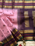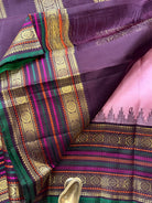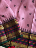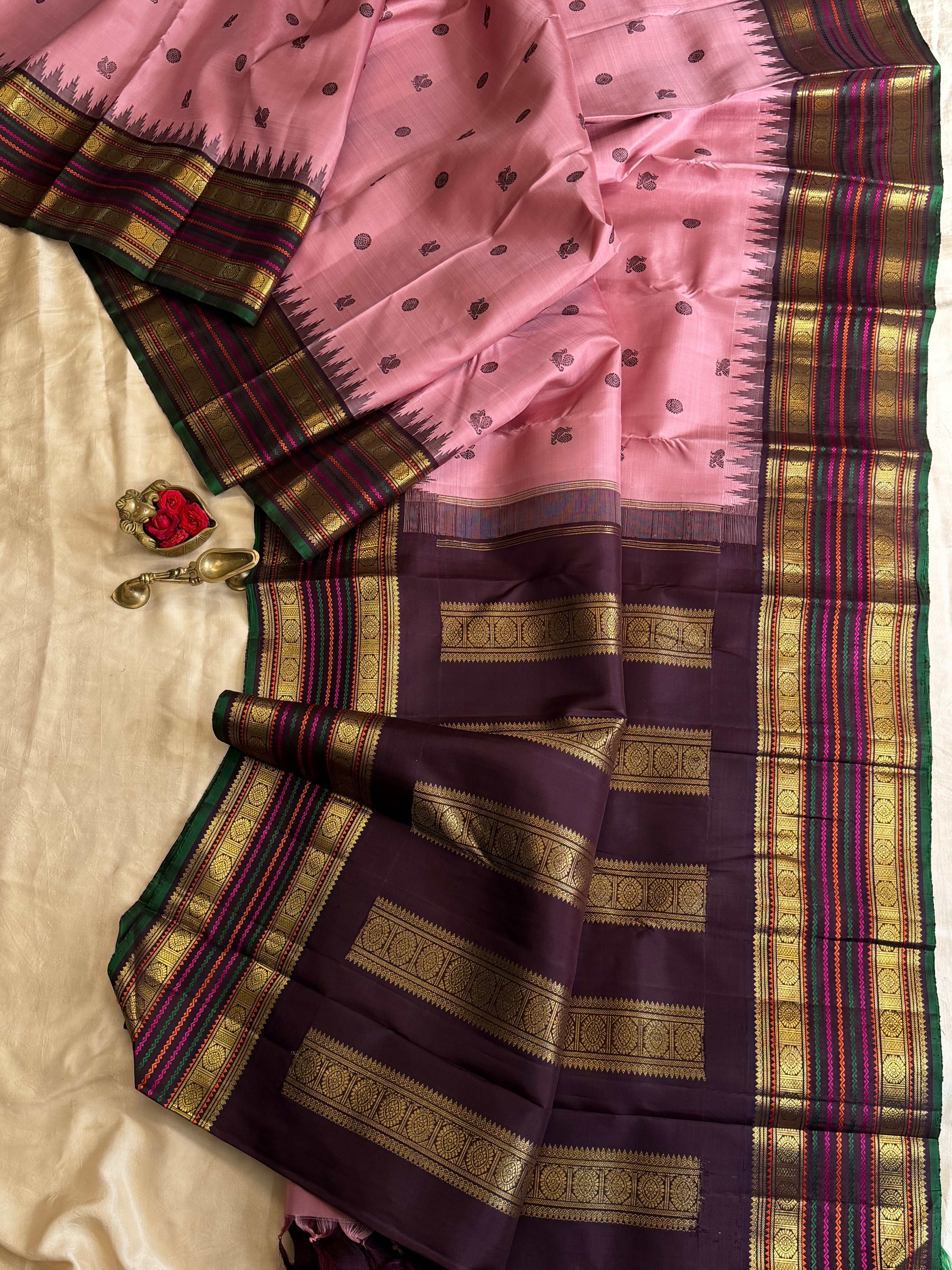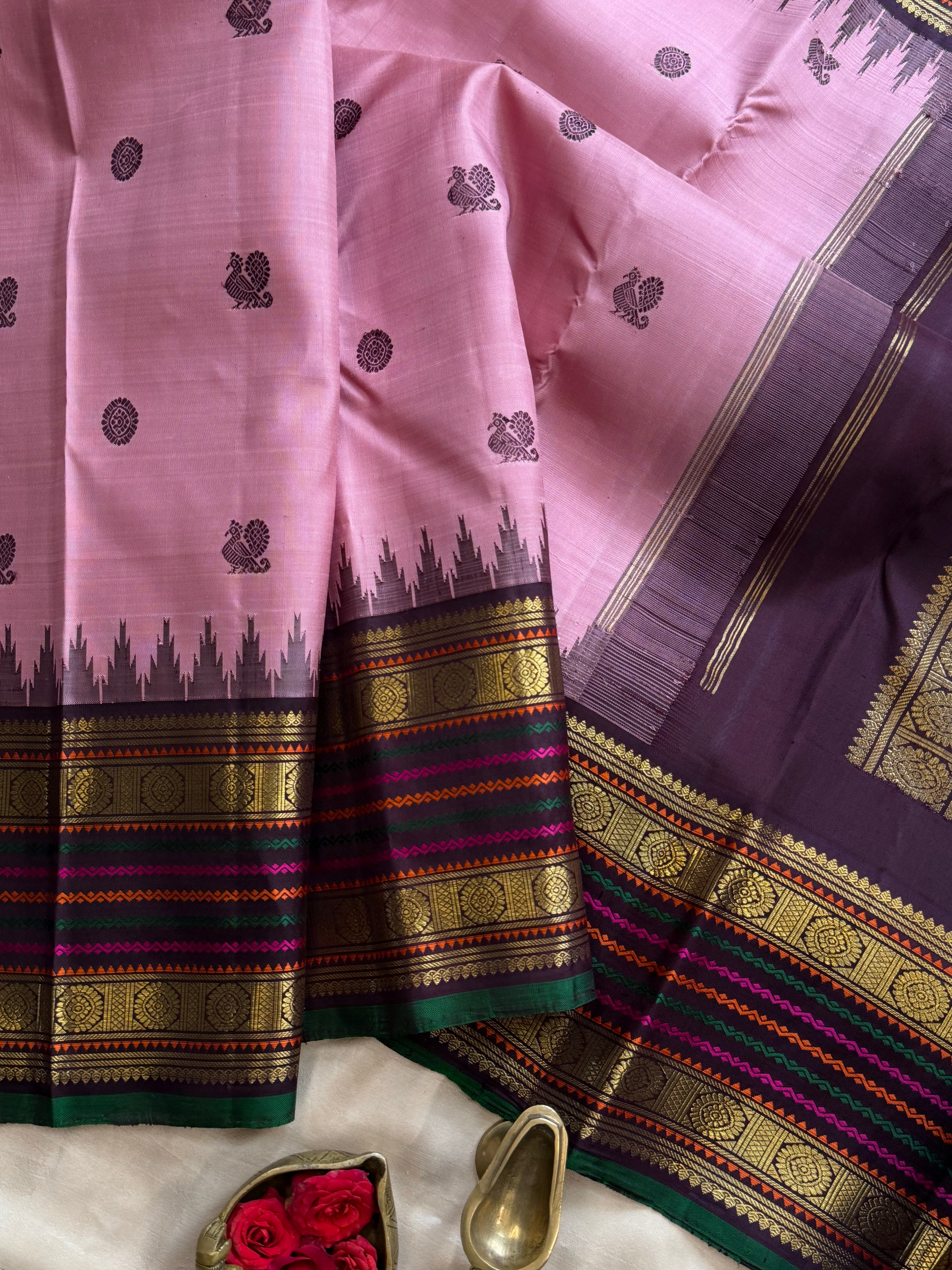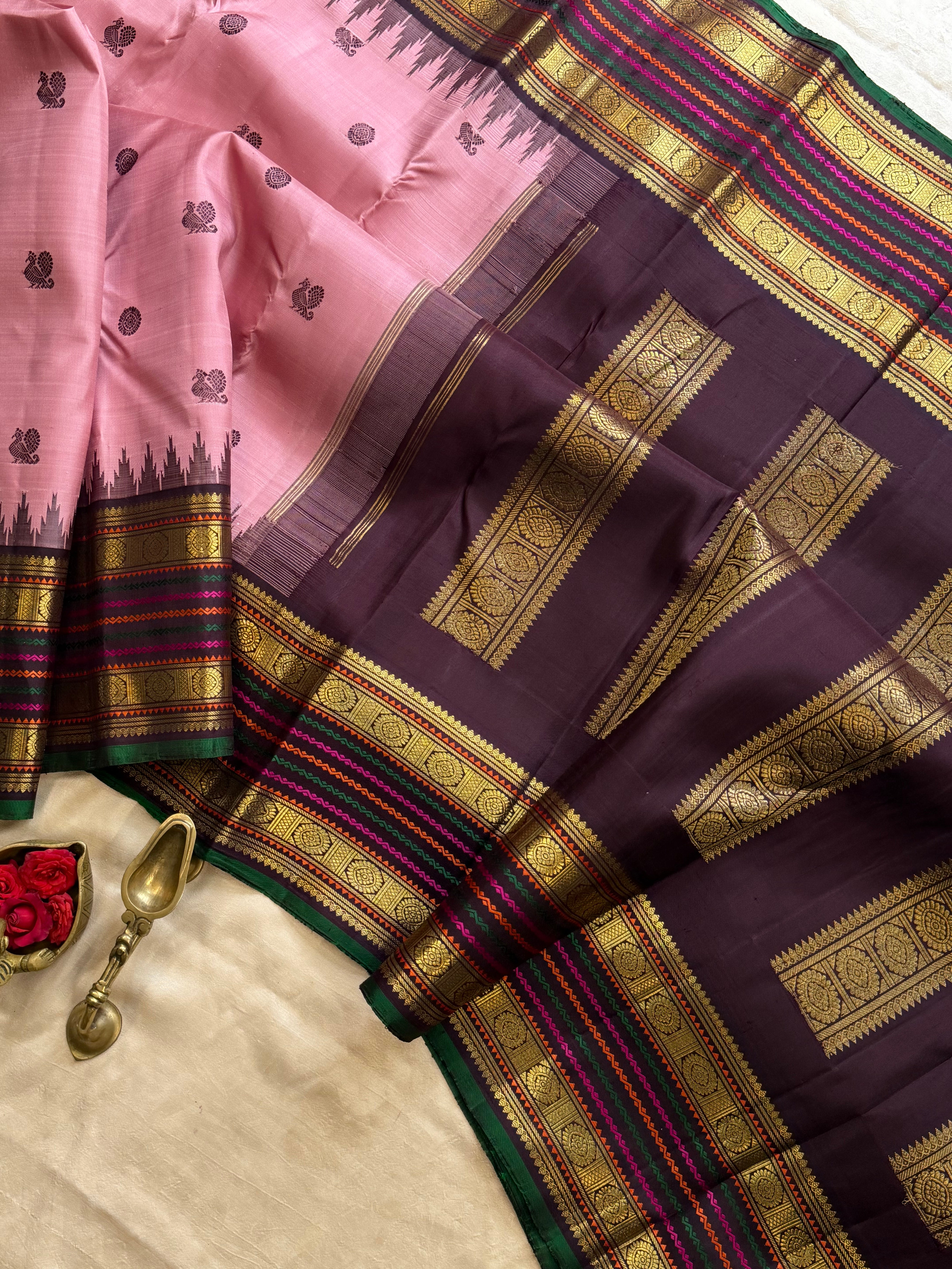 The body is dusky pink with annam chakrm Butta and the border is Paaku color varisapet with retta Rudraksha pet and centre is veldhari colour pet with thazhamboo Moggu with dense Palla and blouse